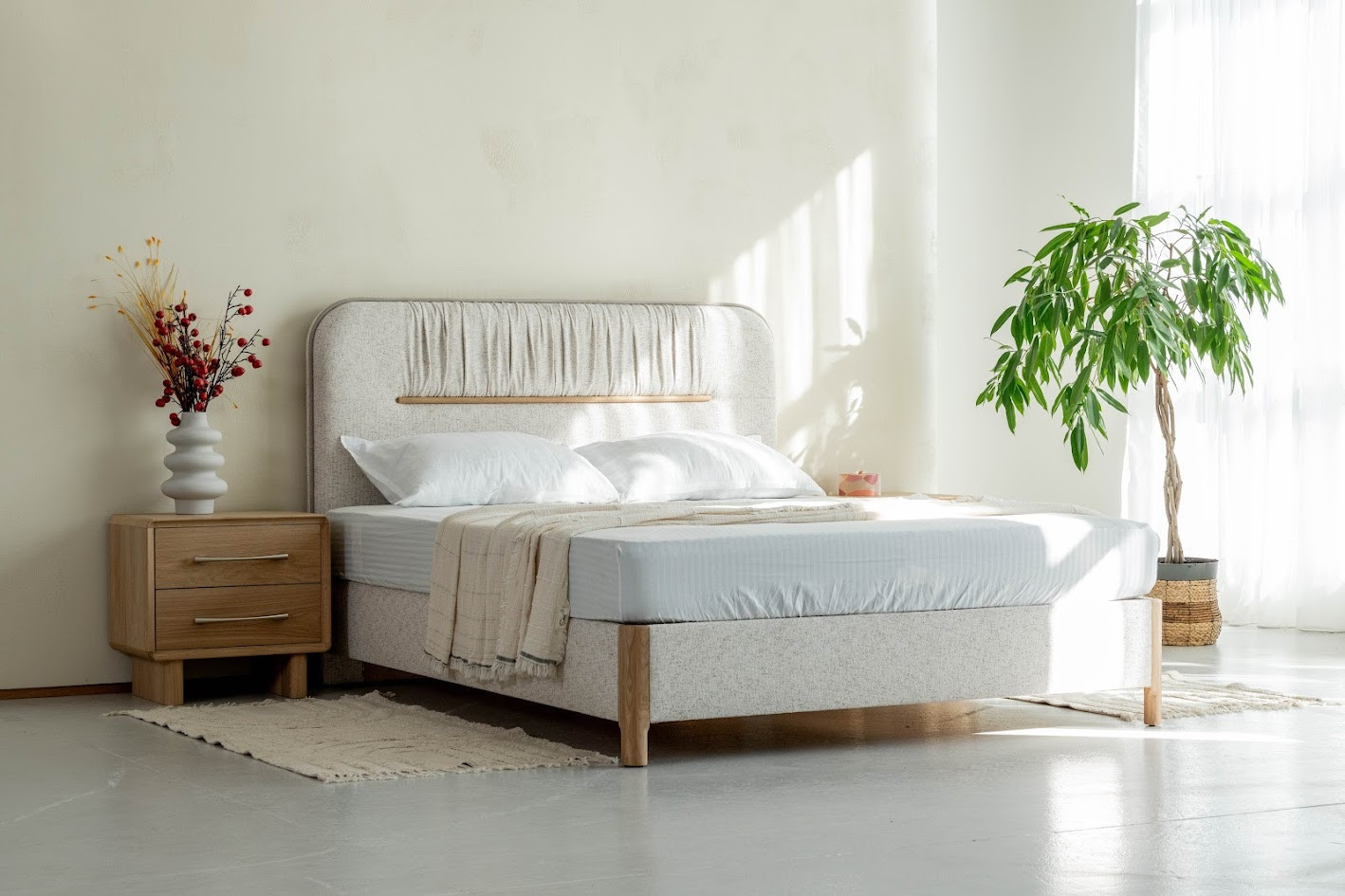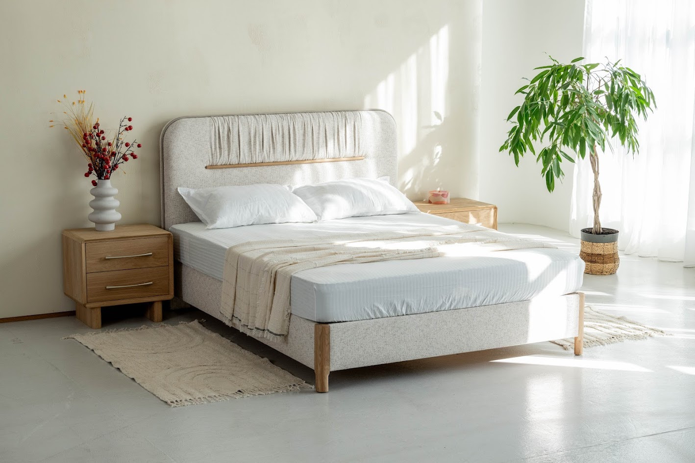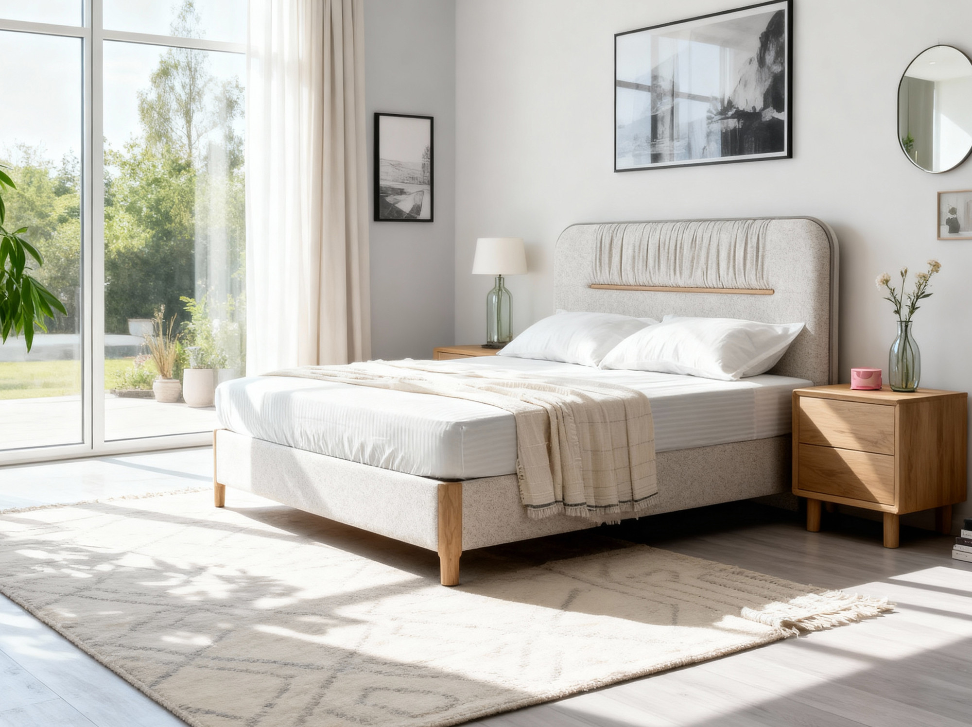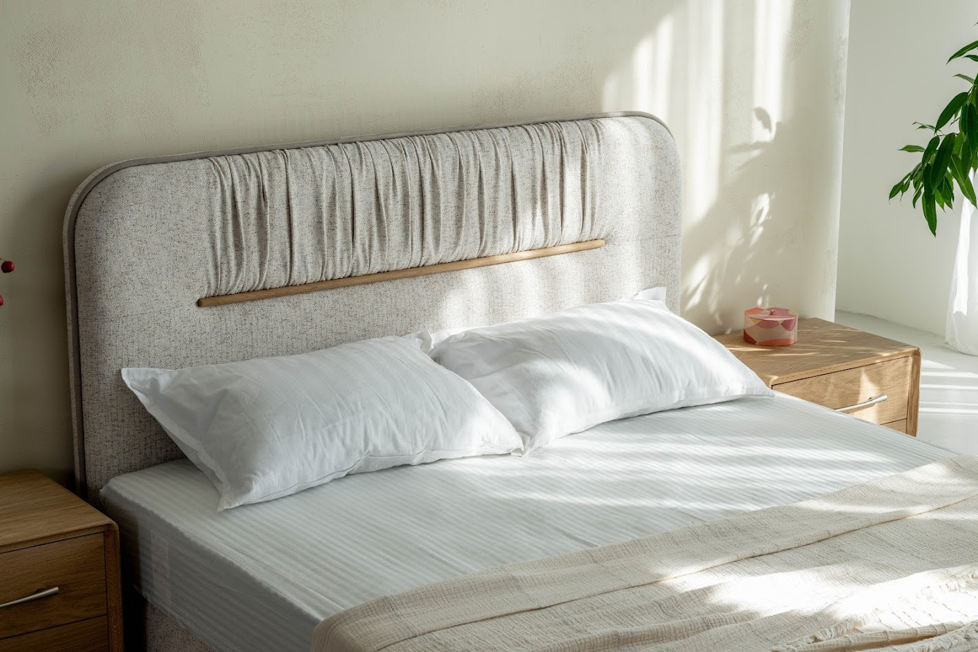 - Design: abgerundete Formen, natürliche Eichendetails und elegantes Kopfteil