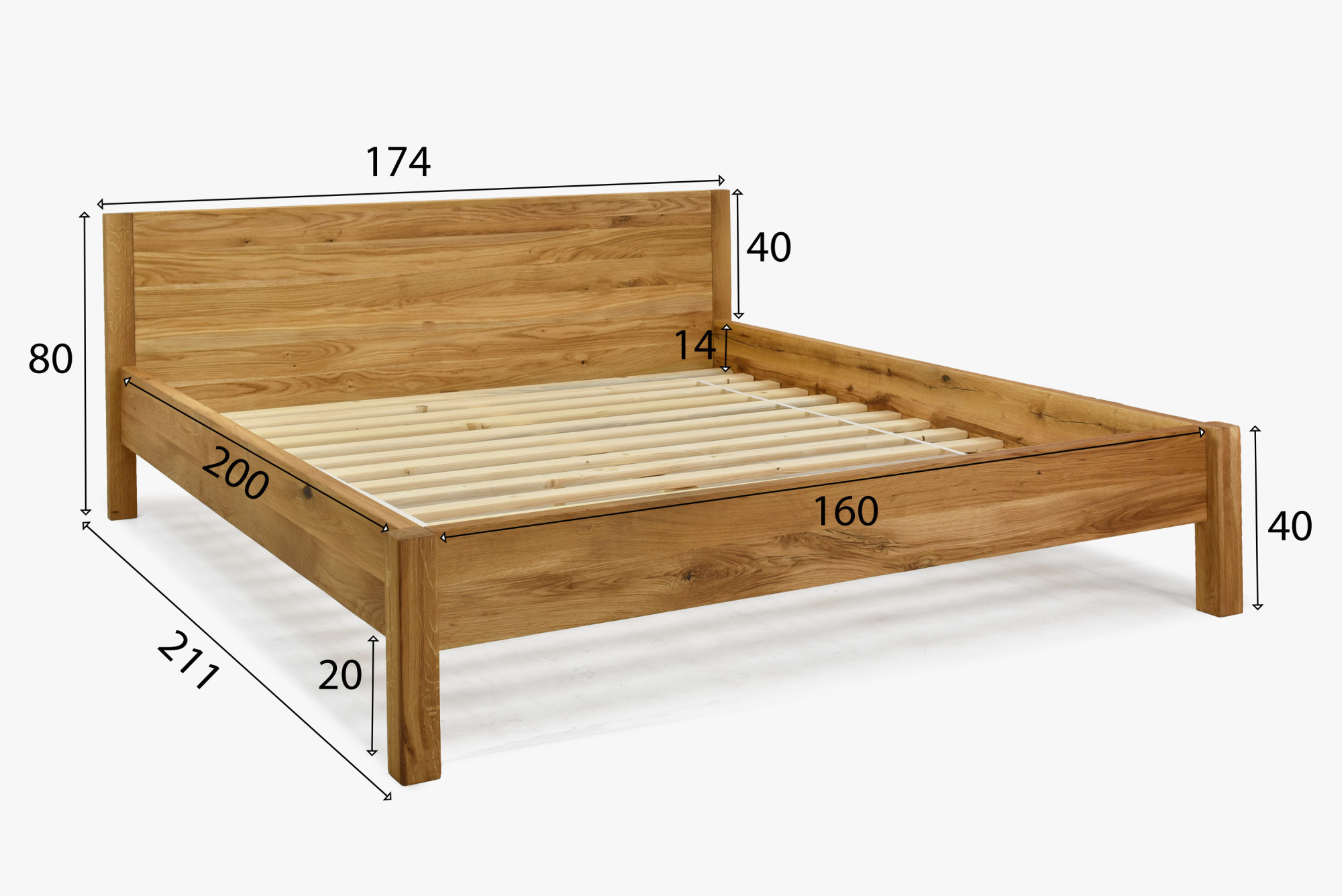 Die Konstruktion besteht aus bis zu 4 cm dicken Seitenrahmen und stabilen vorderen Füßen (7x7 cm), die für maximale Stabilität sorgen. Die Oberfläche ist mit natürlichem Öl behandelt, das die Holzmaserung betont und das Material schützt. Das Bett kann mit jedem beliebigen Lattenrost kombiniert werden, der separat erhältlich ist. Dank des zeitlosen Designs lässt sich das Bett hervorragend mit anderen Möbelstücken kombinieren.