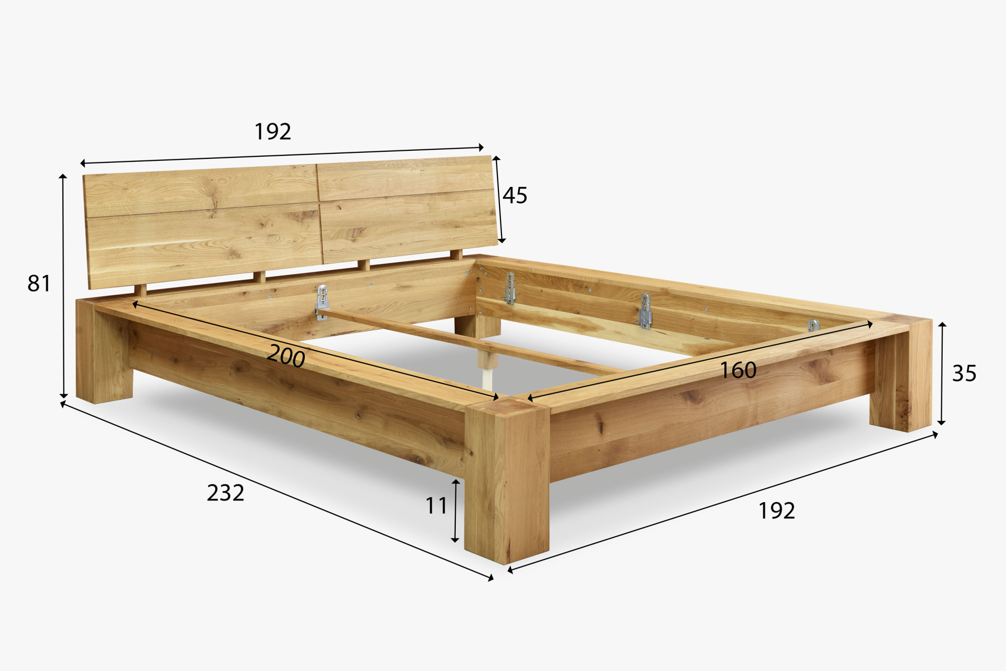 Suchen Sie ein massives Doppelbett, das Robustheit mit Eleganz verbindet? Unser massives Eichenbett in der Größe 160 x 200 cm ist die ideale Wahl für alle, die hochwertige Möbel aus Naturholz schätzen. Das Bett ist aus echtem Eichenholz gefertigt, das durch seine Widerstandsfähigkeit und schöne Struktur besticht. Dominierendes Designelement sind die massiven Beine mit den Maßen 16 x 16 cm, die dem Bett Stabilität und einen markanten Charakter verleihen. Die Oberflächenbehandlung mit naturbelassenem Öl erhält das natürliche Aussehen der Eiche und unterstreicht ihre einzigartige Maserung.