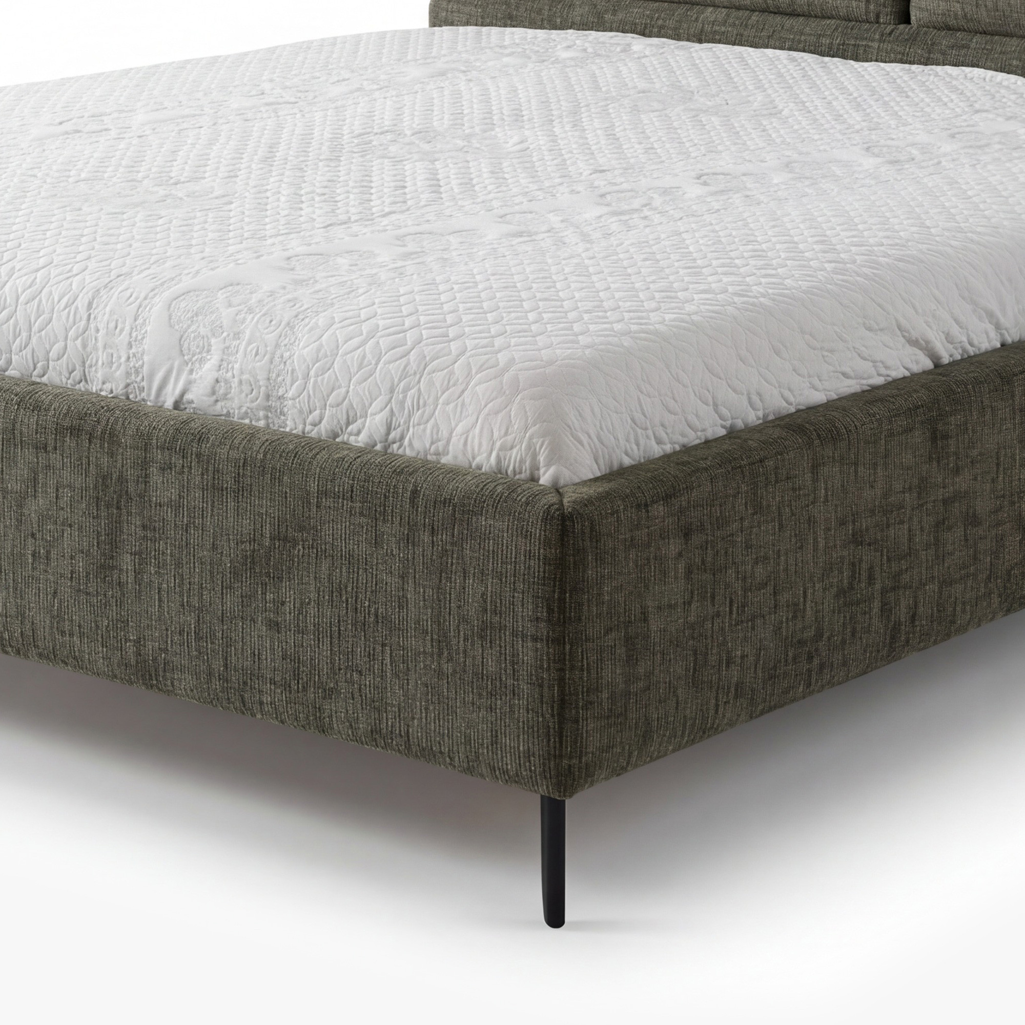 Dank der Kombination aus dunkelgrüner Polsterung und schwarzen matten Beinen passt das Bett hervorragend in moderne, industrielle sowie elegant gestaltete Schlafzimmer.