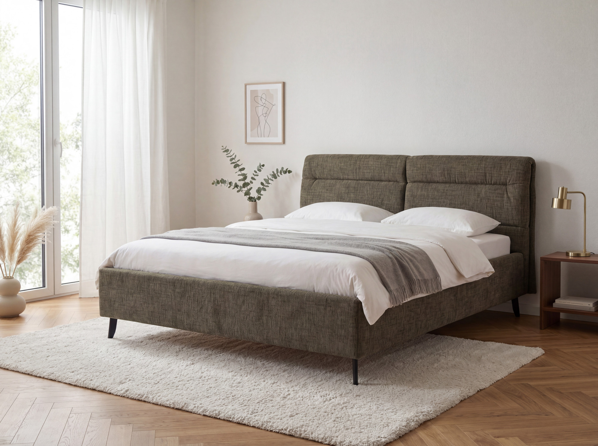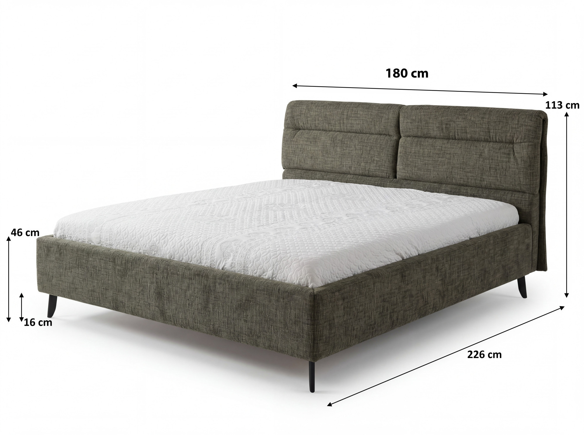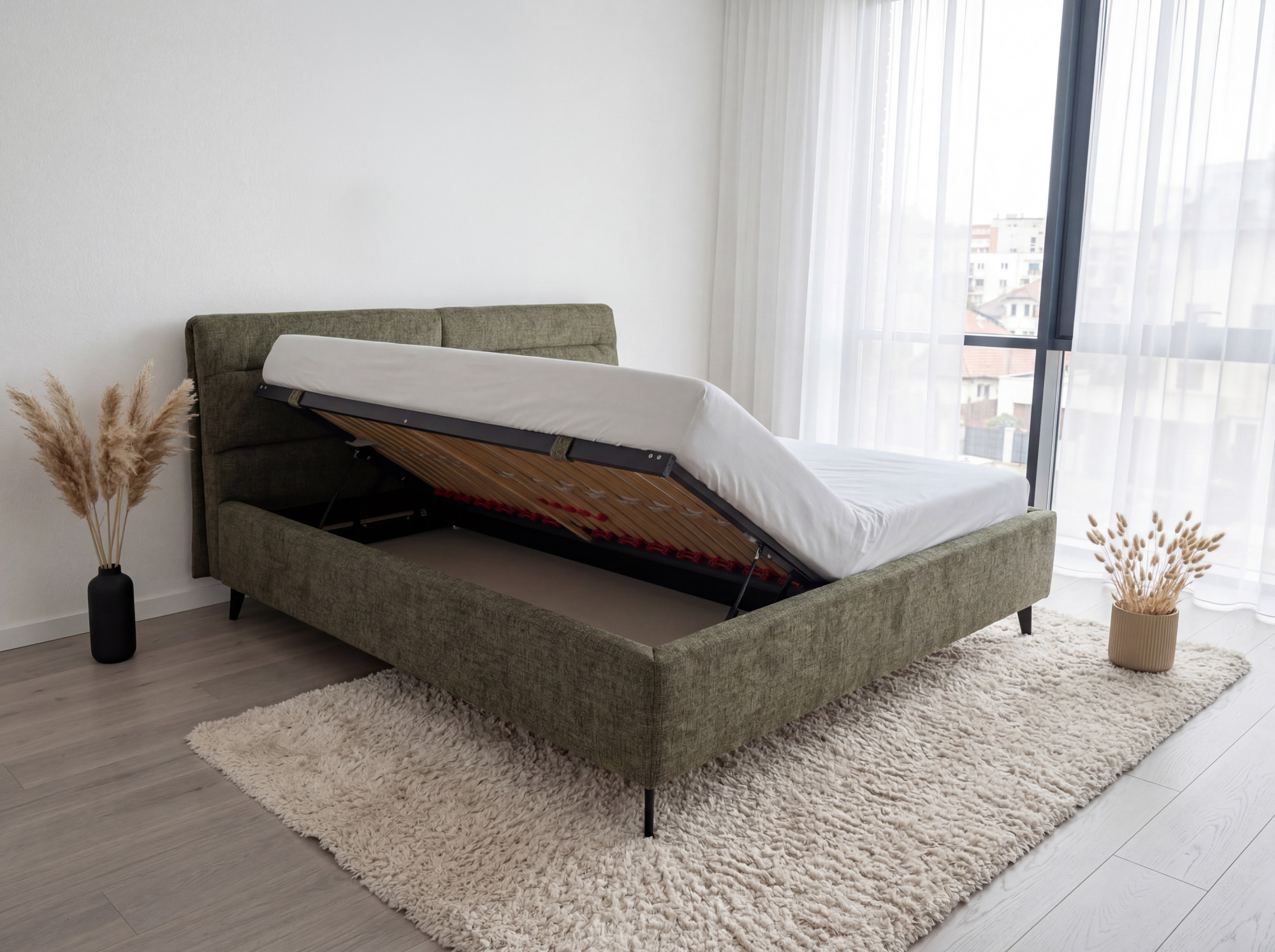 Suchen Sie ein modernes Doppelbett mit Stauraum, das elegantes Design, praktische Nutzung und Komfort für den täglichen Schlaf vereint? Dieses Stoffbett in dunkelgrüner Farbe ist eine ausgezeichnete Wahl für moderne und zeitlos eingerichtete Schlafzimmer. Es besticht durch eine markante Polsterung, schwarze, matte Metallbeine und bietet gleichzeitig einen praktischen Stauraum, den Sie zum Aufbewahren von Bettwäsche, Decken oder saisonalen Textilien zu schätzen wissen.
