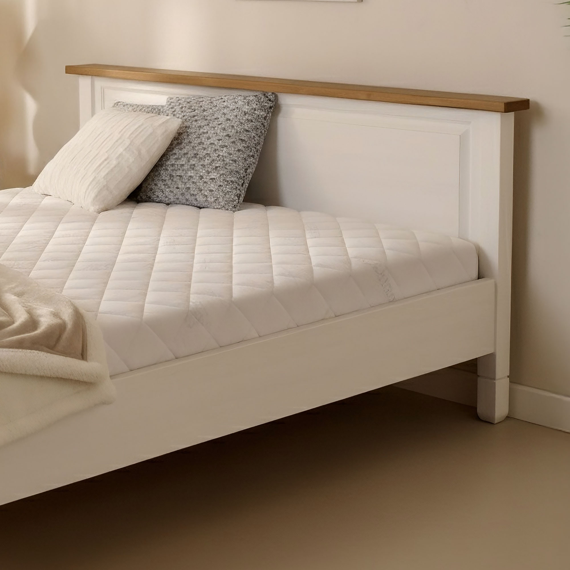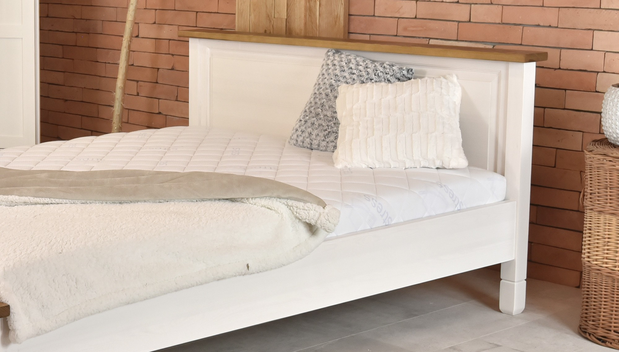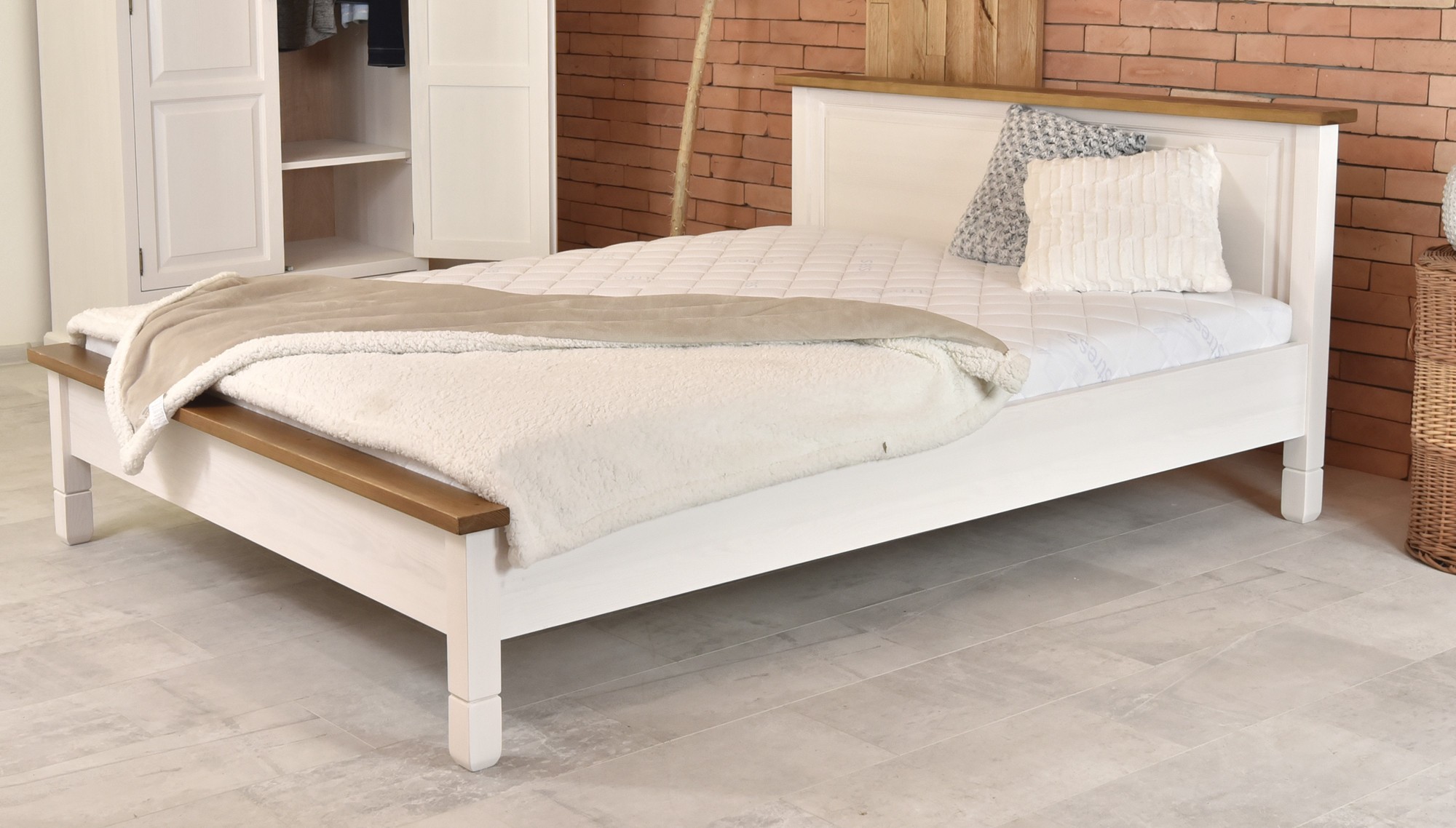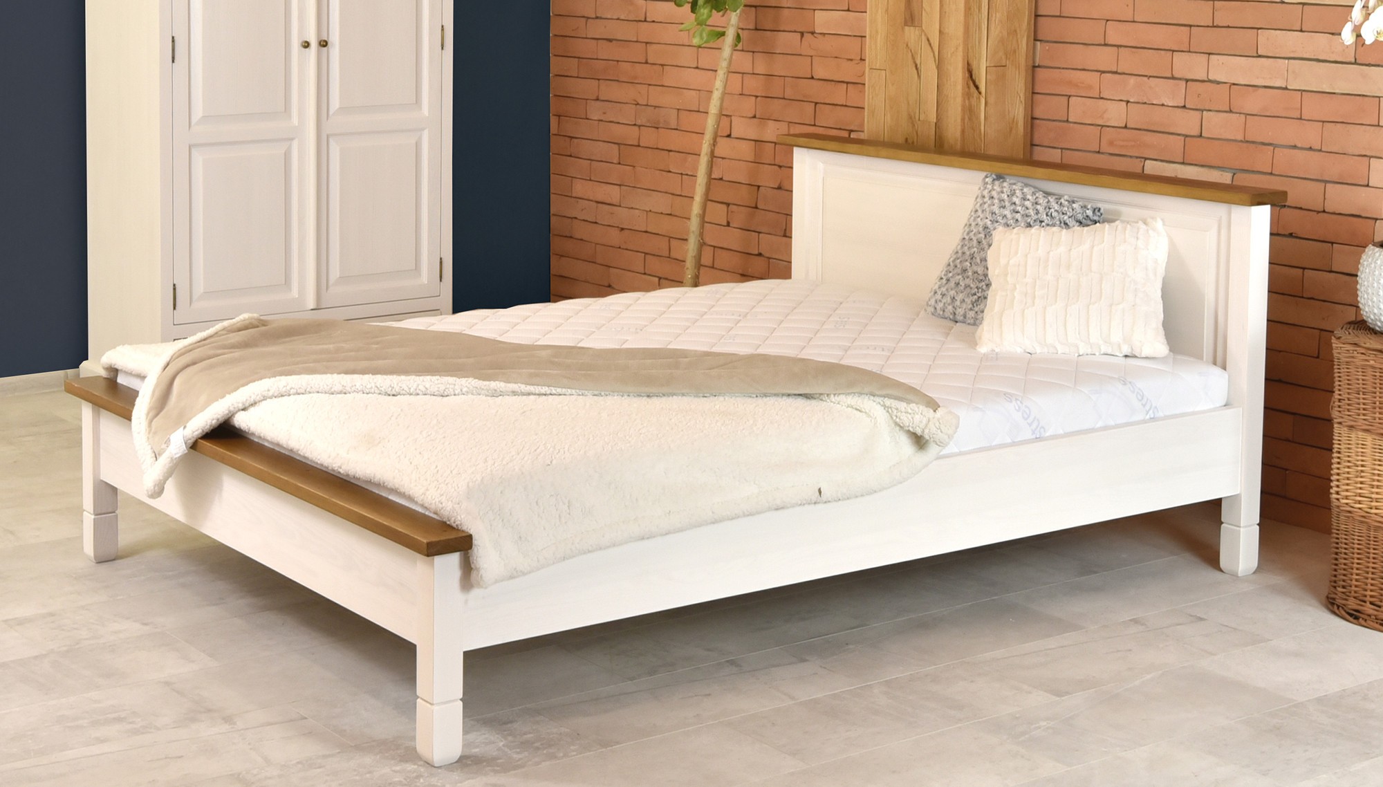 Die Konstruktion besteht aus hochwertigem Kiefernholz mit einer Oberfläche, die mit ökologischem mattem Lack behandelt wurde, um die natürliche Holzstruktur hervorzuheben und zu schützen. Das Bett ist in der Kombination aus Weiß und Braun gehalten und lässt sich hervorragend mit anderen Möbelstücken der Kollektion France kombinieren. Die stabile Bauweise garantiert eine langlebige Nutzung ohne Knarren. Zudem kann jeder passende Lattenrost in den Rahmen eingebaut werden – dieser ist nicht im Preis enthalten.