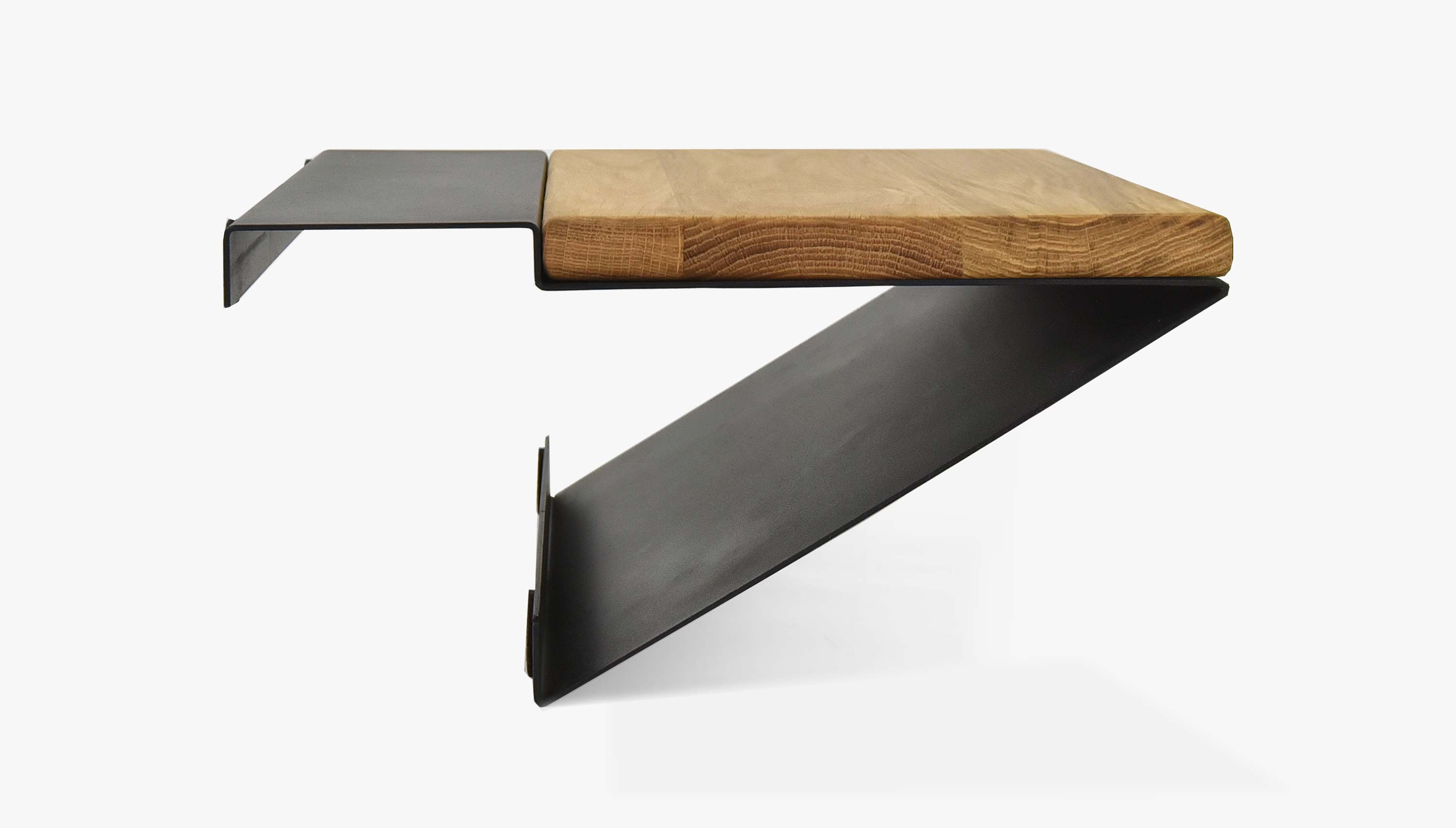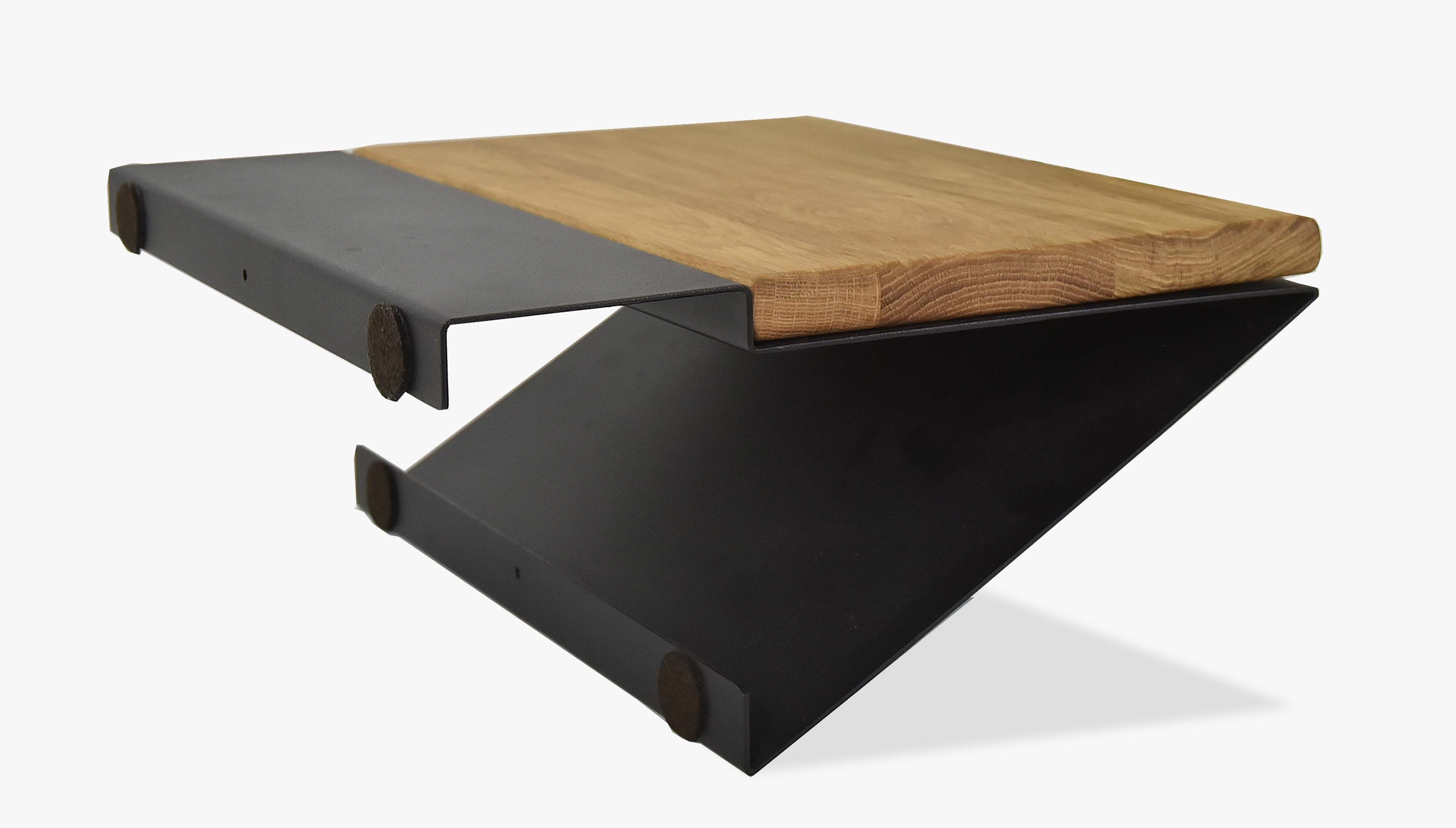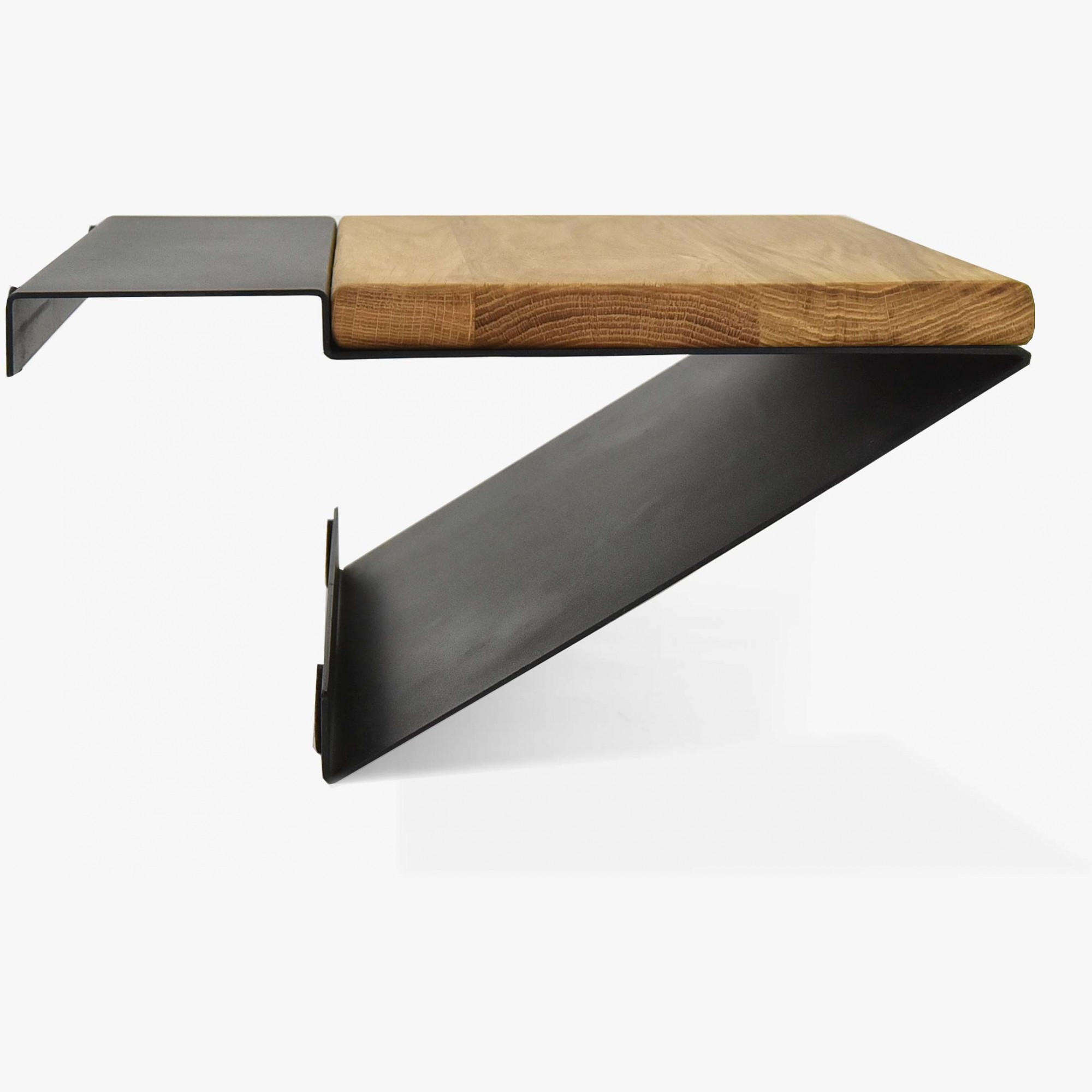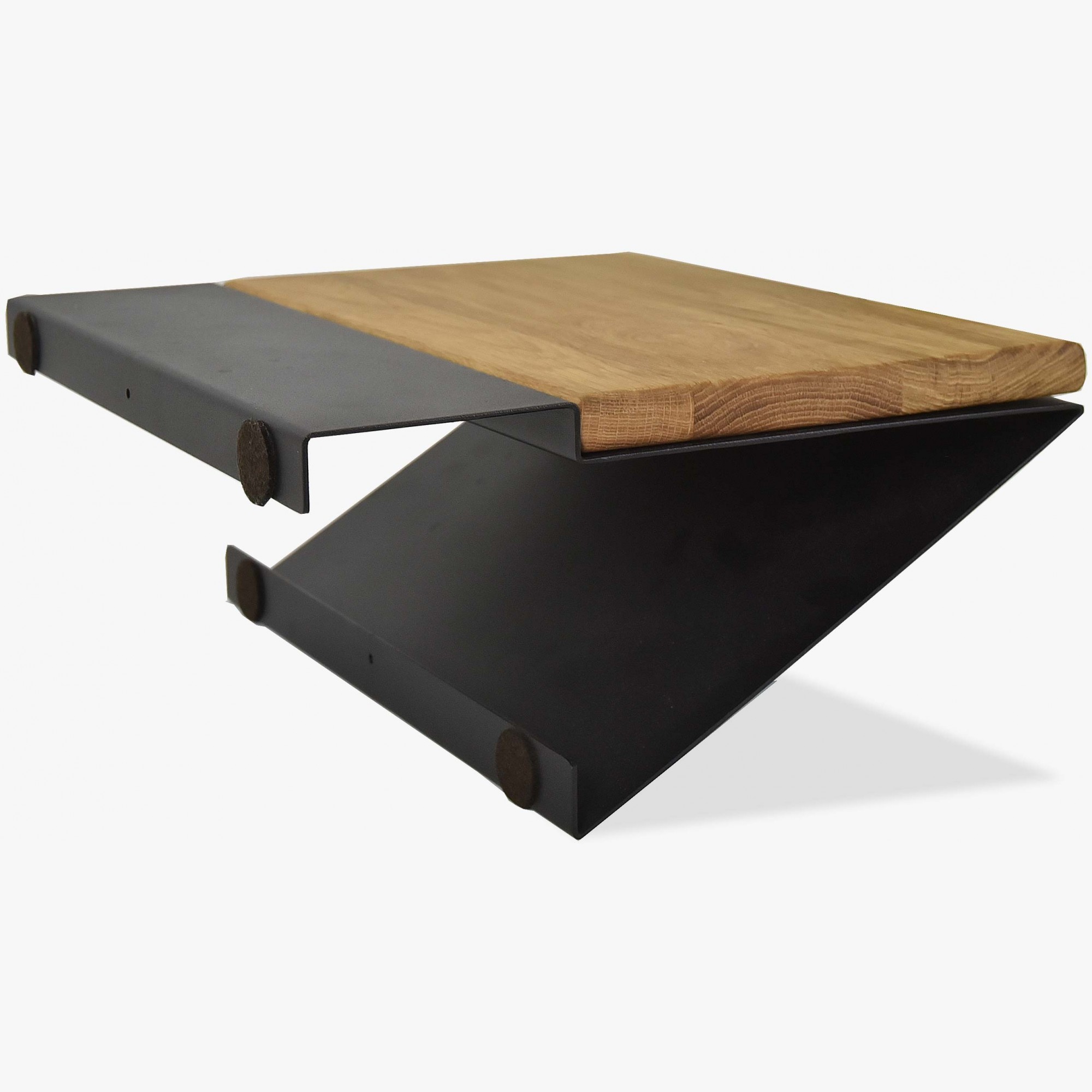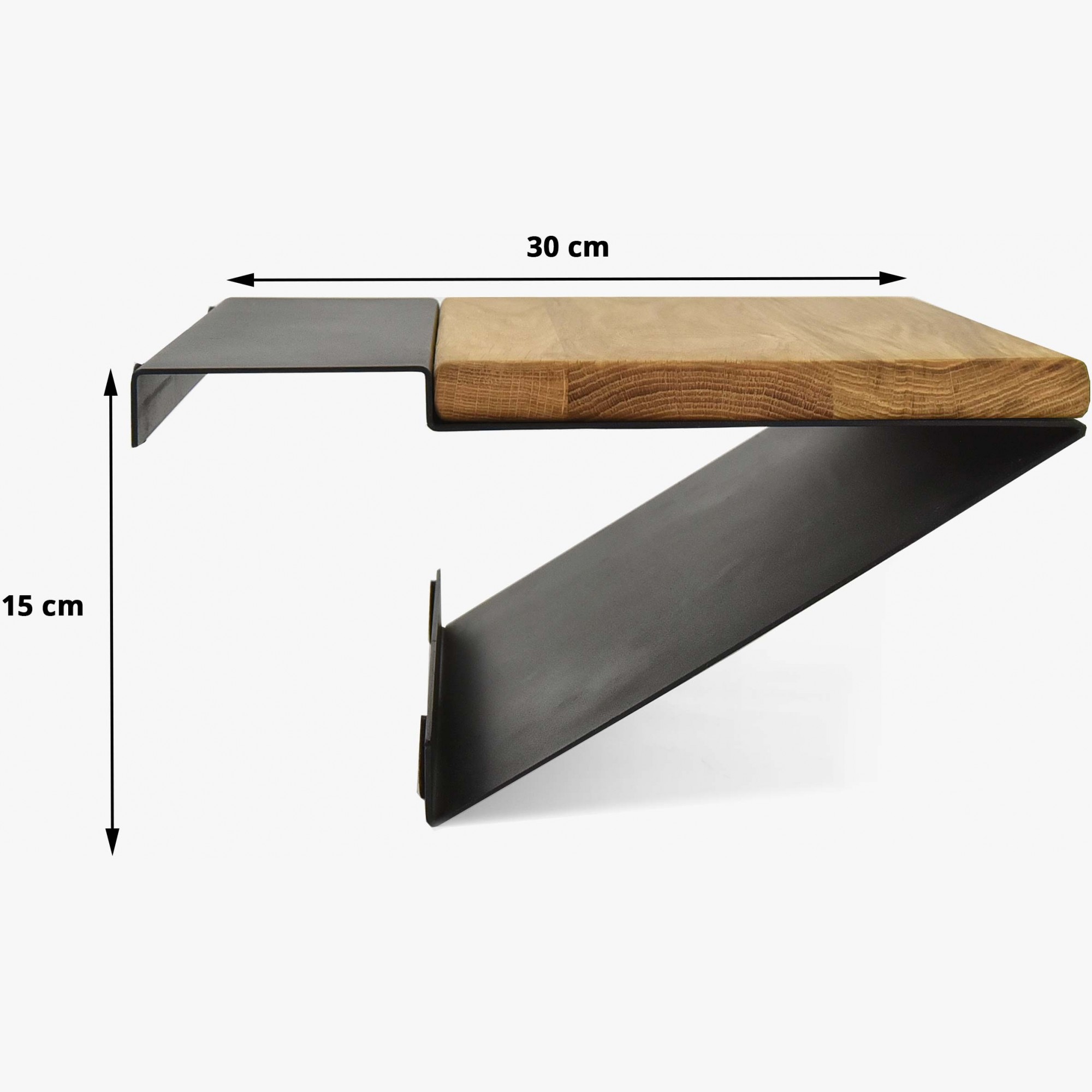Moderner Nachttisch aus Metall in mattem Schwarz mit einer oberen Platte aus Eiche. Der Nachttisch Loft ist hängend und wird nur an der Bettkante befestigt. Er eignet sich für Betten, die eine Bettkante in der Größe 16 x 9 cm haben. Der Nachttisch ist somit passend für all unsere Balkenbetten.