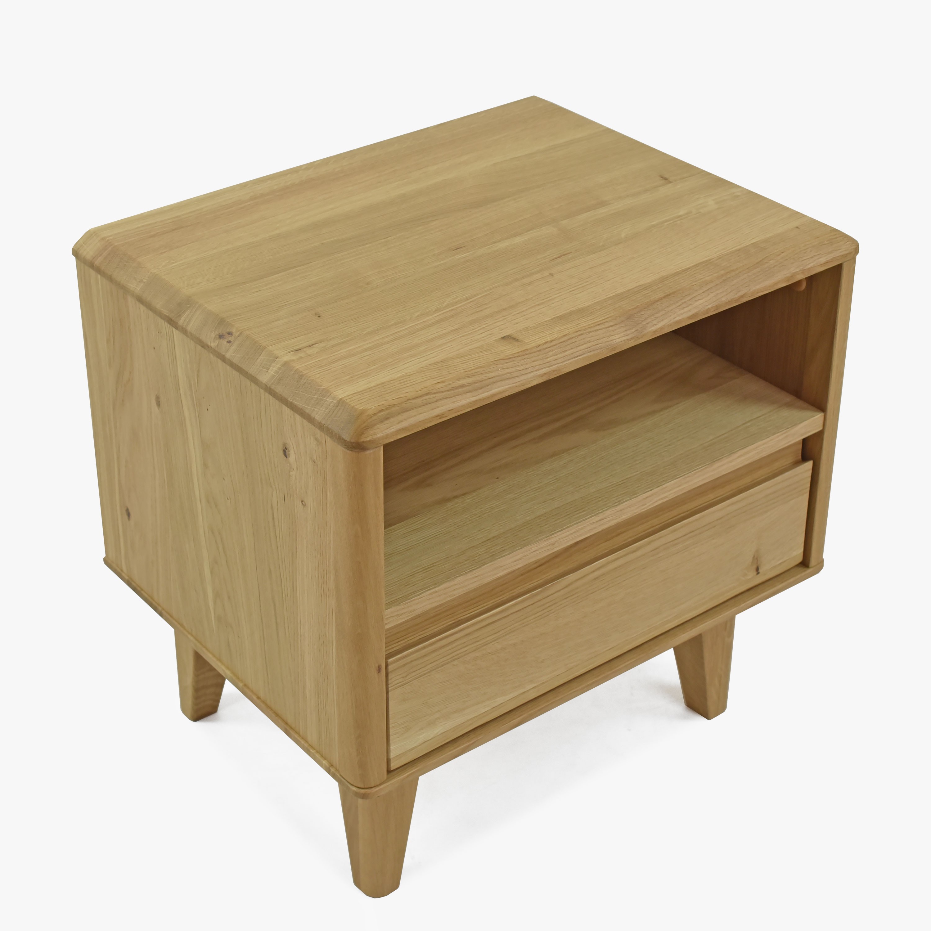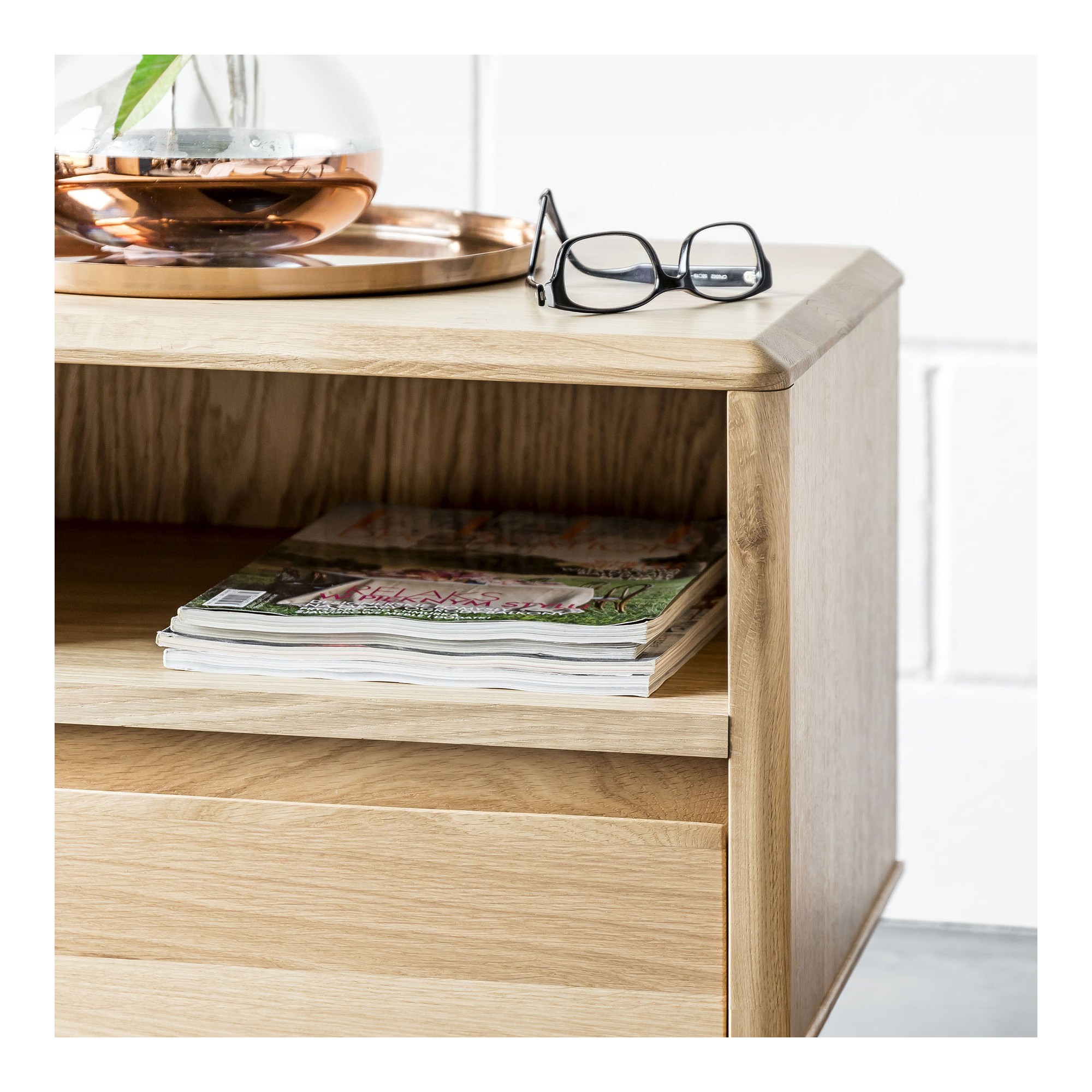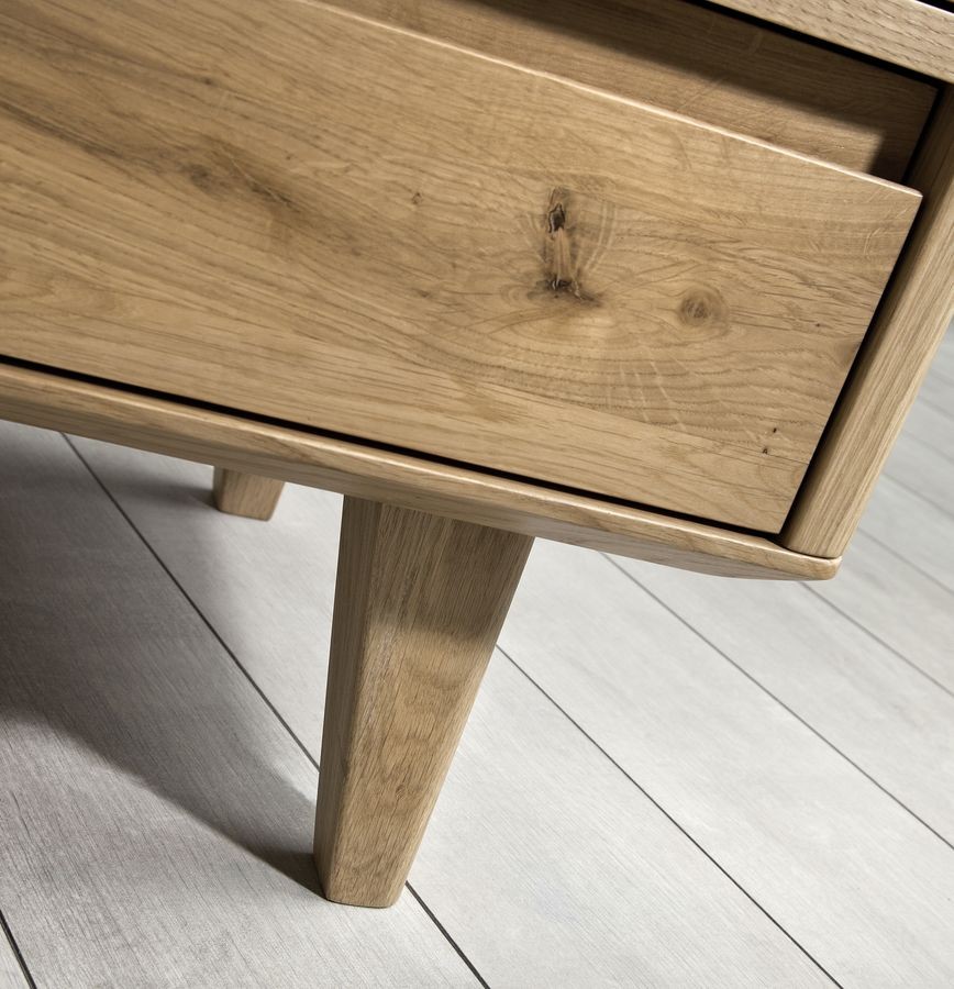 Elegante Nachtkommode aus unserer beliebten Möbelserie Love. Dieses gemütliche Möbelstück ist die perfekte Ergänzung für jedes Interieur, das vom skandinavischen Design inspiriert ist, das für seine Schlichtheit, Funktionalität und Schönheit bekannt ist. Die Nachtkommode ist sorgfältig aus Eichenholz gefertigt, zeichnet sich durch hohe Qualität und lange Lebensdauer aus. Ihr Design ist durch abgeschrägte Kanten und moderne Eichenfüße geprägt, die ihr Leichtigkeit und Eleganz verleihen.