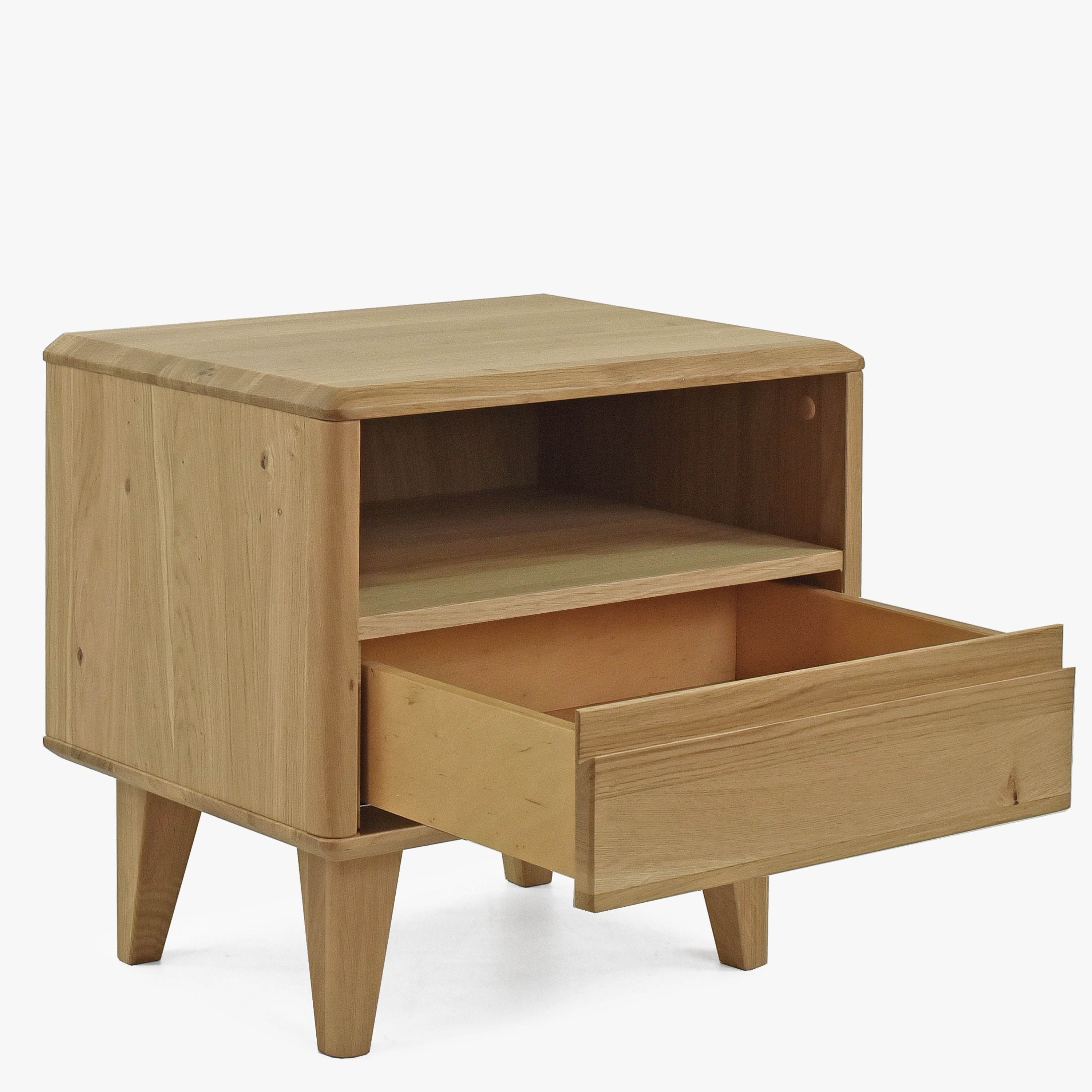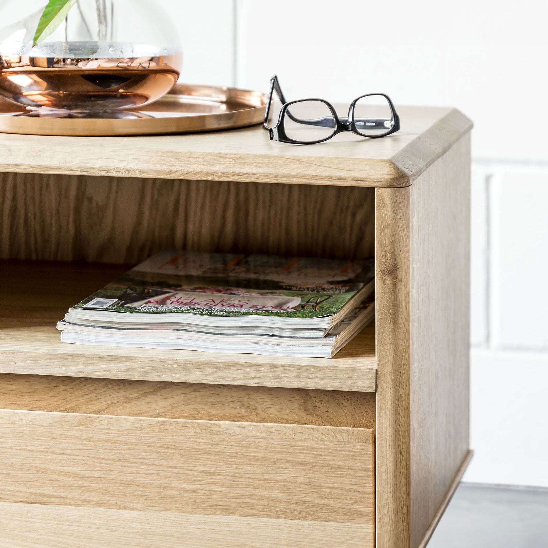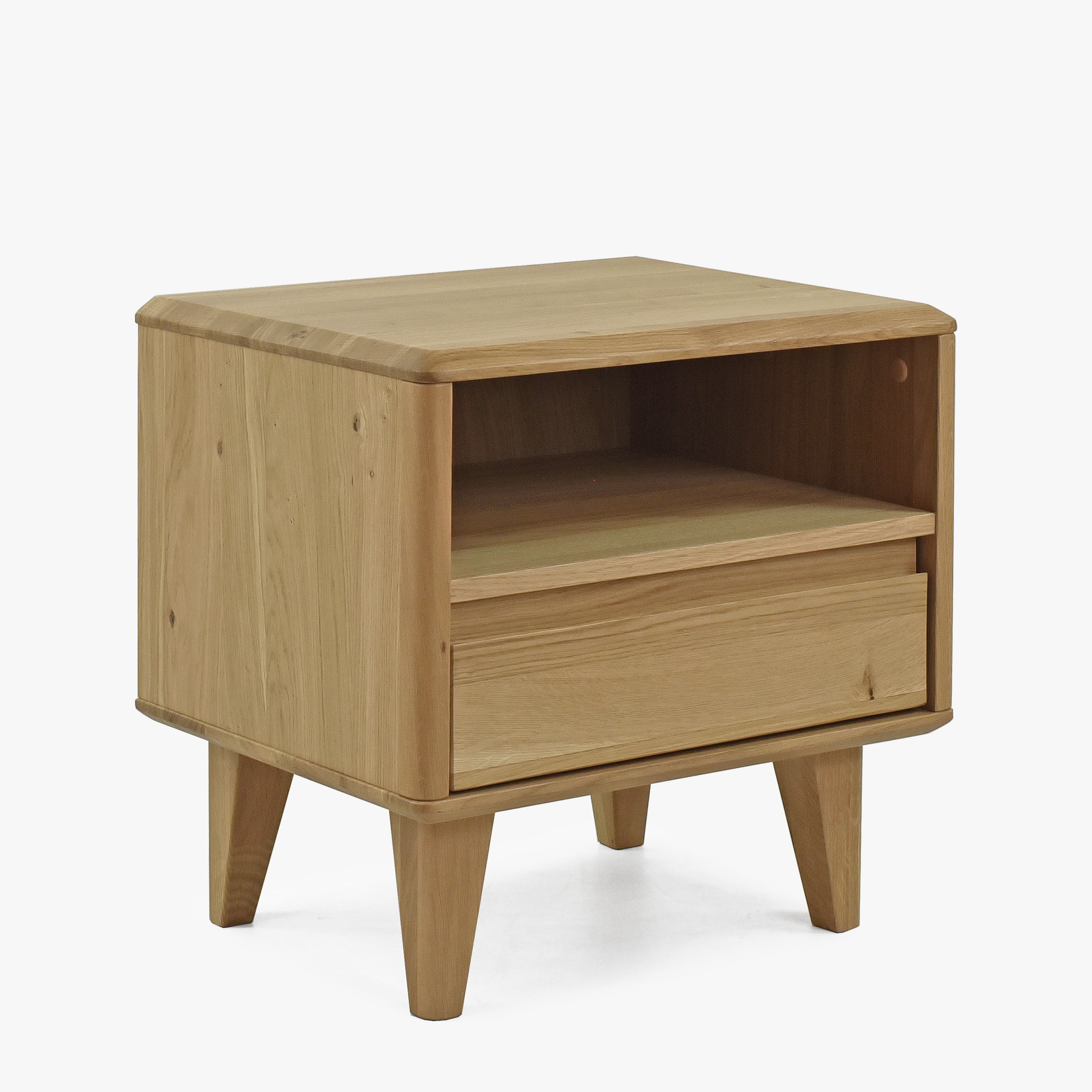Elegante Nachtkommode aus unserer beliebten Möbelserie Love. Dieses gemütliche Möbelstück ist die perfekte Ergänzung für jedes Interieur, das vom skandinavischen Design inspiriert ist, das für seine Schlichtheit, Funktionalität und Schönheit bekannt ist. Die Nachtkommode ist sorgfältig aus Eichenholz gefertigt, zeichnet sich durch hohe Qualität und lange Lebensdauer aus. Ihr Design ist durch abgeschrägte Kanten und moderne Eichenfüße geprägt, die ihr Leichtigkeit und Eleganz verleihen.