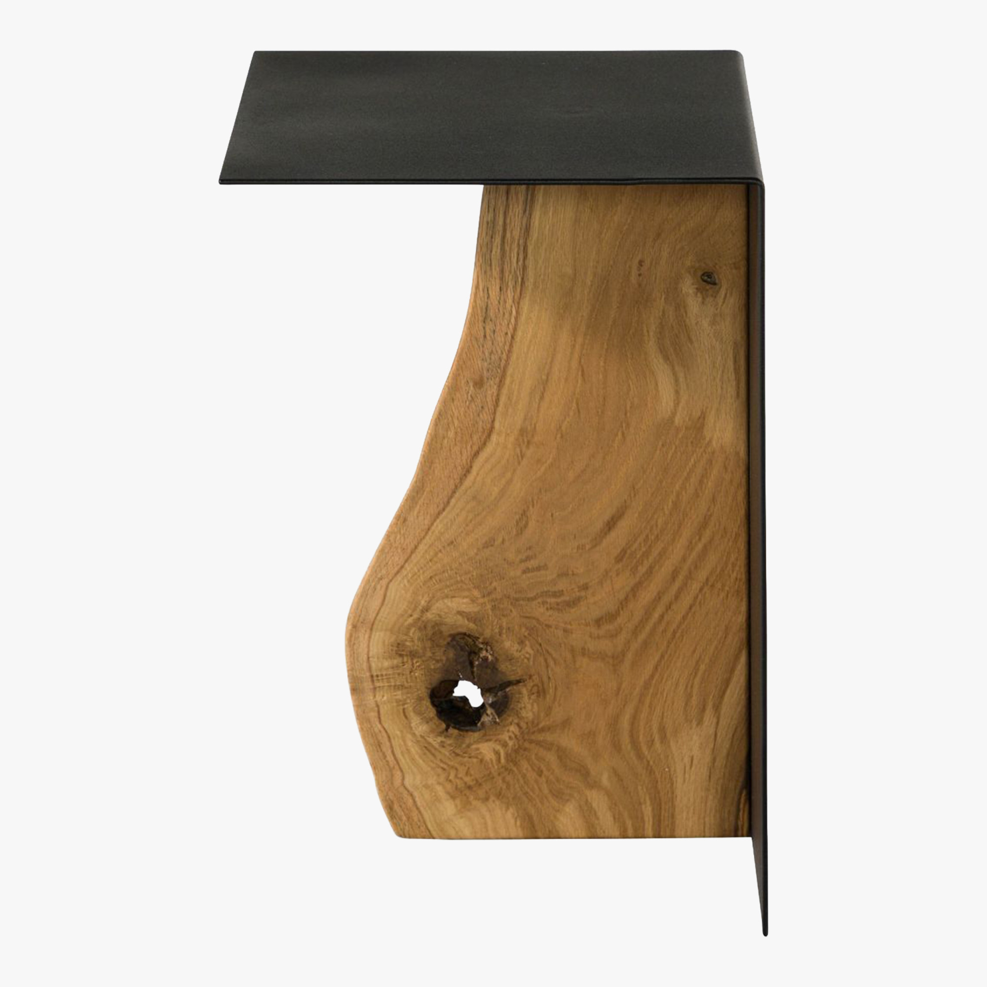 Dieser elegante Beistelltisch verbindet die natürliche Schönheit von Eichenholz mit modernem Industrie-Design. Die Platte aus geöltem massivem Eichenholz besticht durch eine einzigartige Struktur und natürliche Konturen, die jedes Stück zu einem absoluten Unikat machen. Die beim Herstellungsprozess verwendeten Holzprofile schonen natürliche Ressourcen und verleihen dem Tisch zugleich Leichtigkeit und Luftigkeit. Die Metallkonstruktion in L-Form in schwarzer Ausführung bildet eine stabile Basis und wirkt gleichzeitig als Designelement, das den modernen Charakter des gesamten Produkts betont.