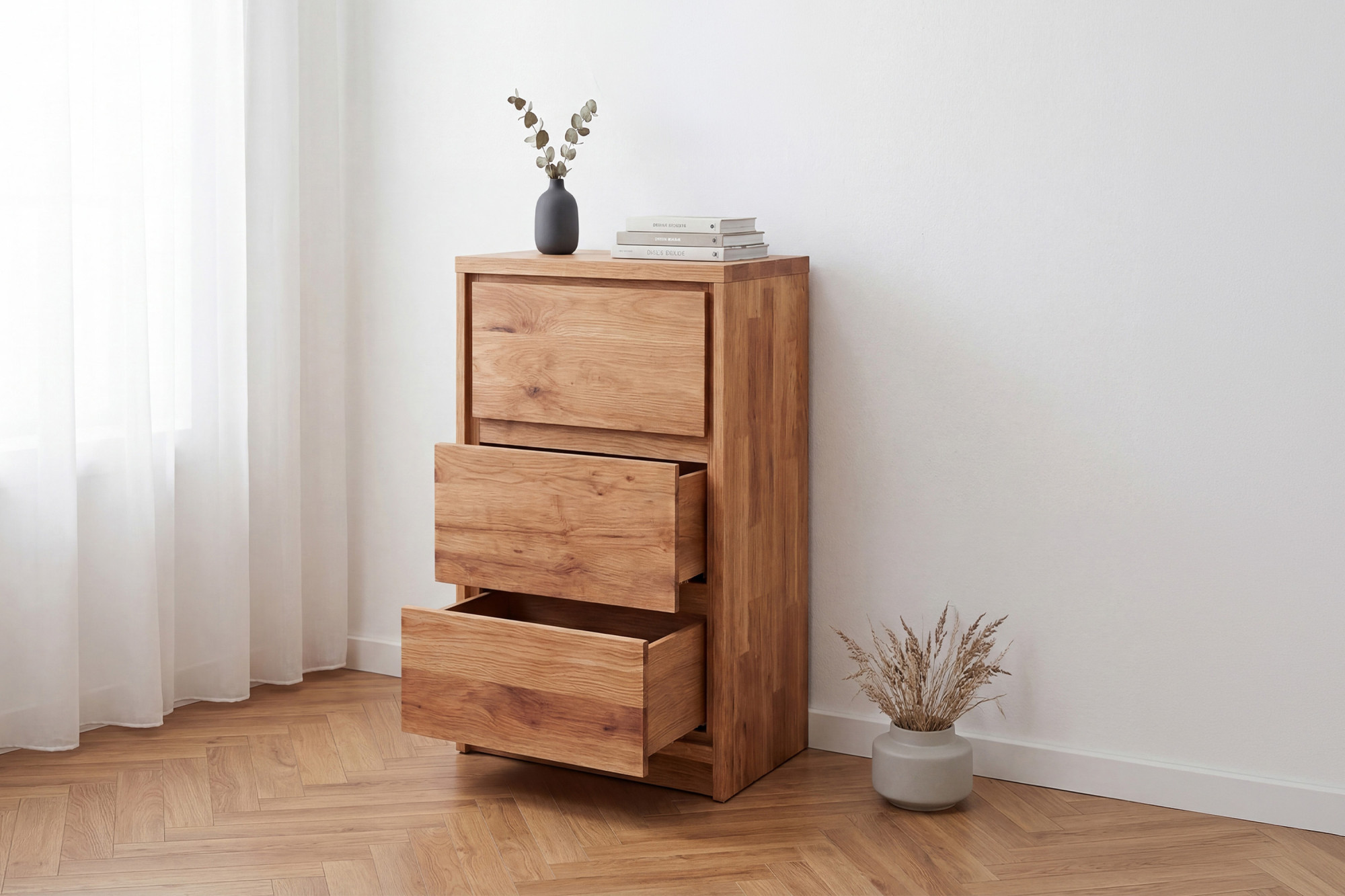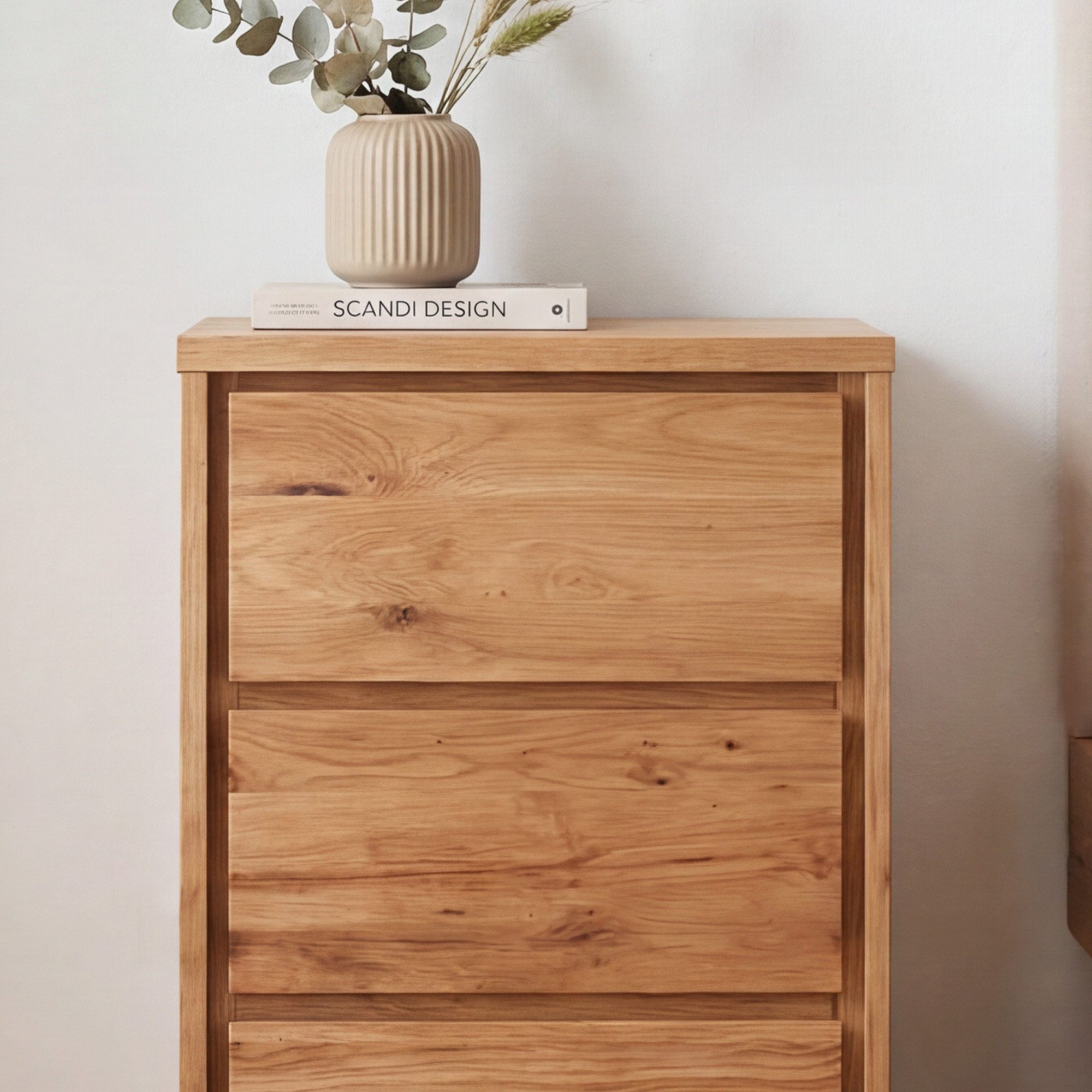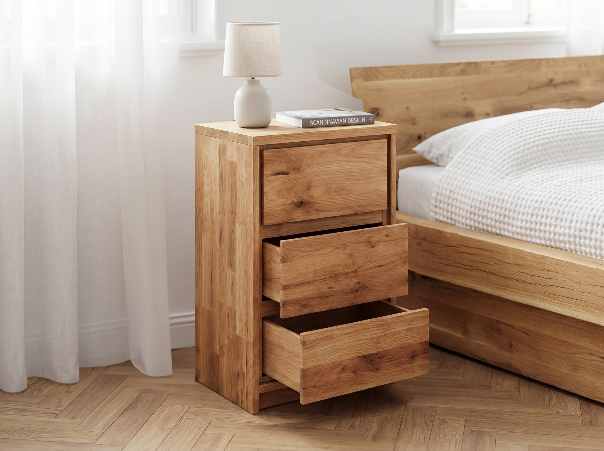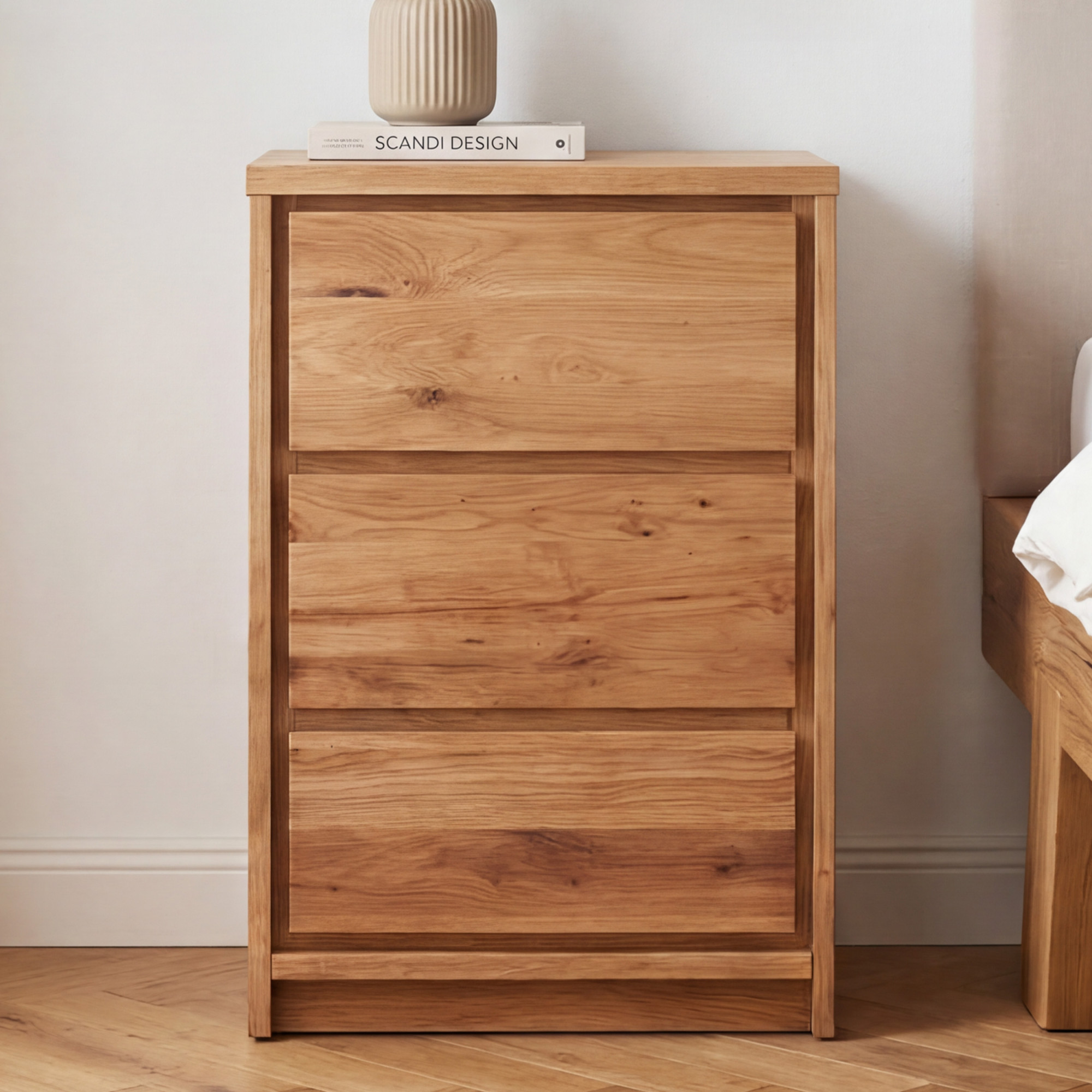 Eiche Nachttisch Oregon aus Wildeiche – 3 Schubladen, Höhe 76 cm