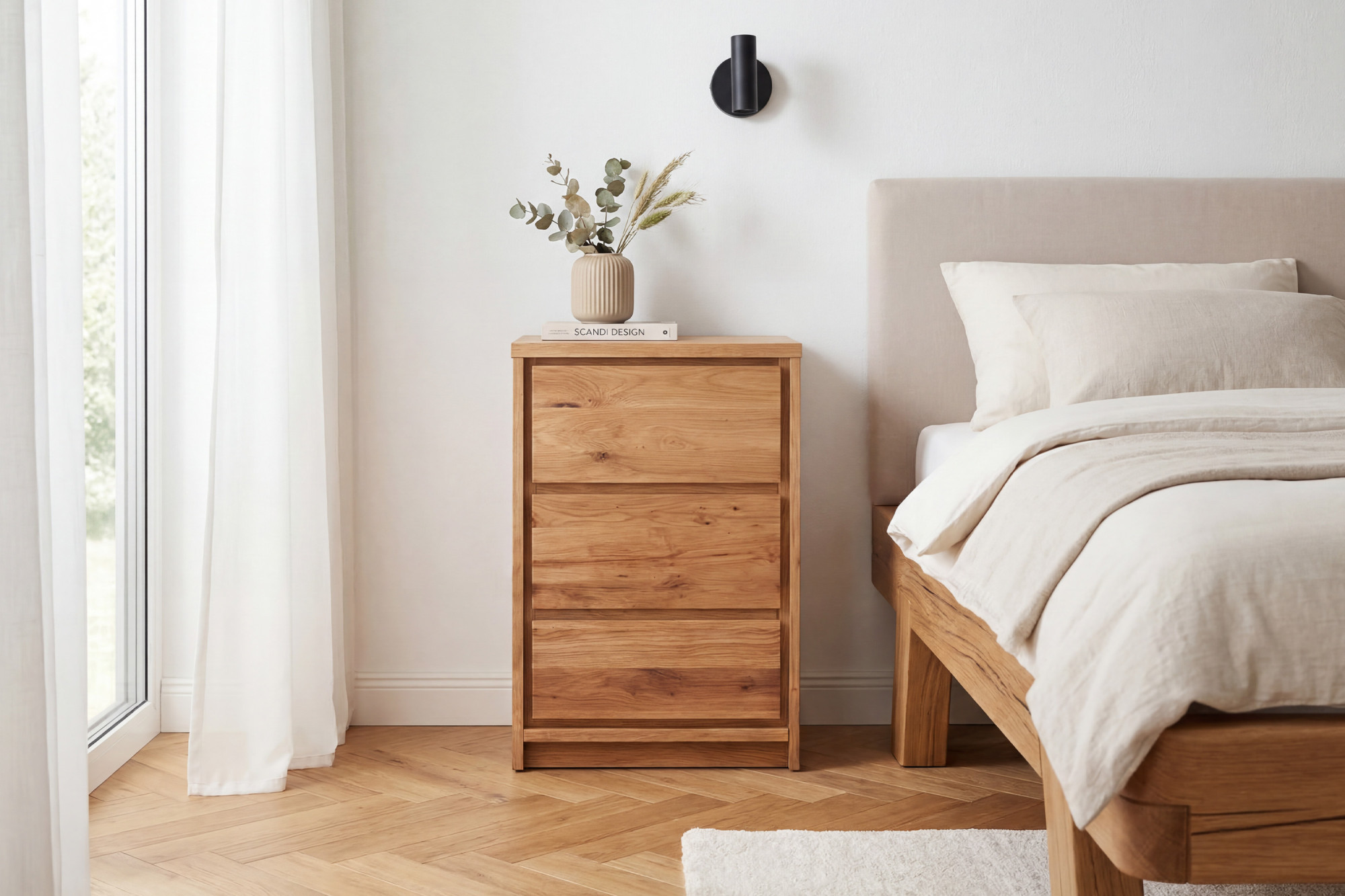 Mit den Maßen 47 × 76 × 42 cm (B × H × T) erreicht dieser Nachttisch die ideale Höhe für die meisten Doppelbetten und bietet gleichzeitig eine ausreichend große Ablagefläche für eine Lampe, Wecker oder eine Tasse Tee. Die Oberfläche ist mit naturbelassenem Öl behandelt, das die lebendige Struktur der Wildeiche hervorhebt und das Holz im täglichen Gebrauch schützt. Die Konstruktion ist vollmassiv – keine Furniere oder MDF – und der Tisch wird komplett montiert geliefert, sofort einsatzbereit.