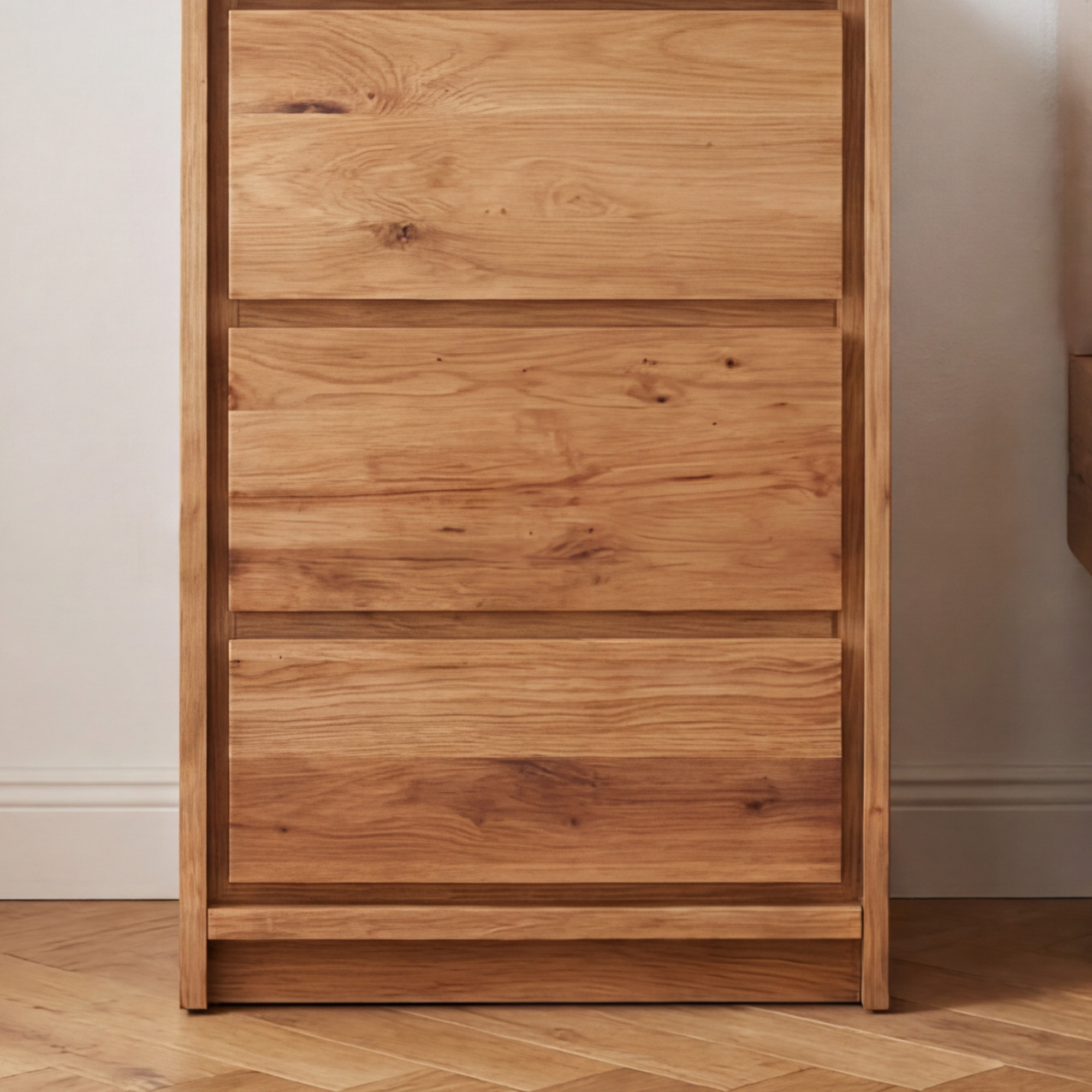 Der höhere Nachttisch Oregon mit drei Schubladen bietet neben einer Ablagefläche an Ihrem Bett auch überraschend großzügigen Stauraum. Drei tiefe Schubladen fassen Bücher, Ladegeräte, Brillen, Medikamente und weitere Dinge, die Sie nachts griffbereit haben möchten. Der Tisch ist vollständig aus massiver Wildeiche mit typischen markanten Astlöchern und dekorativen Rissen gefertigt, dank derer jedes Stück ein absolutes Unikat ist. Alle drei Schubladen sind mit einem Soft-Close-System ausgestattet, sodass auch nächtliches Öffnen und Schließen den ruhigen Schlaf Ihres Partners nicht stört.
