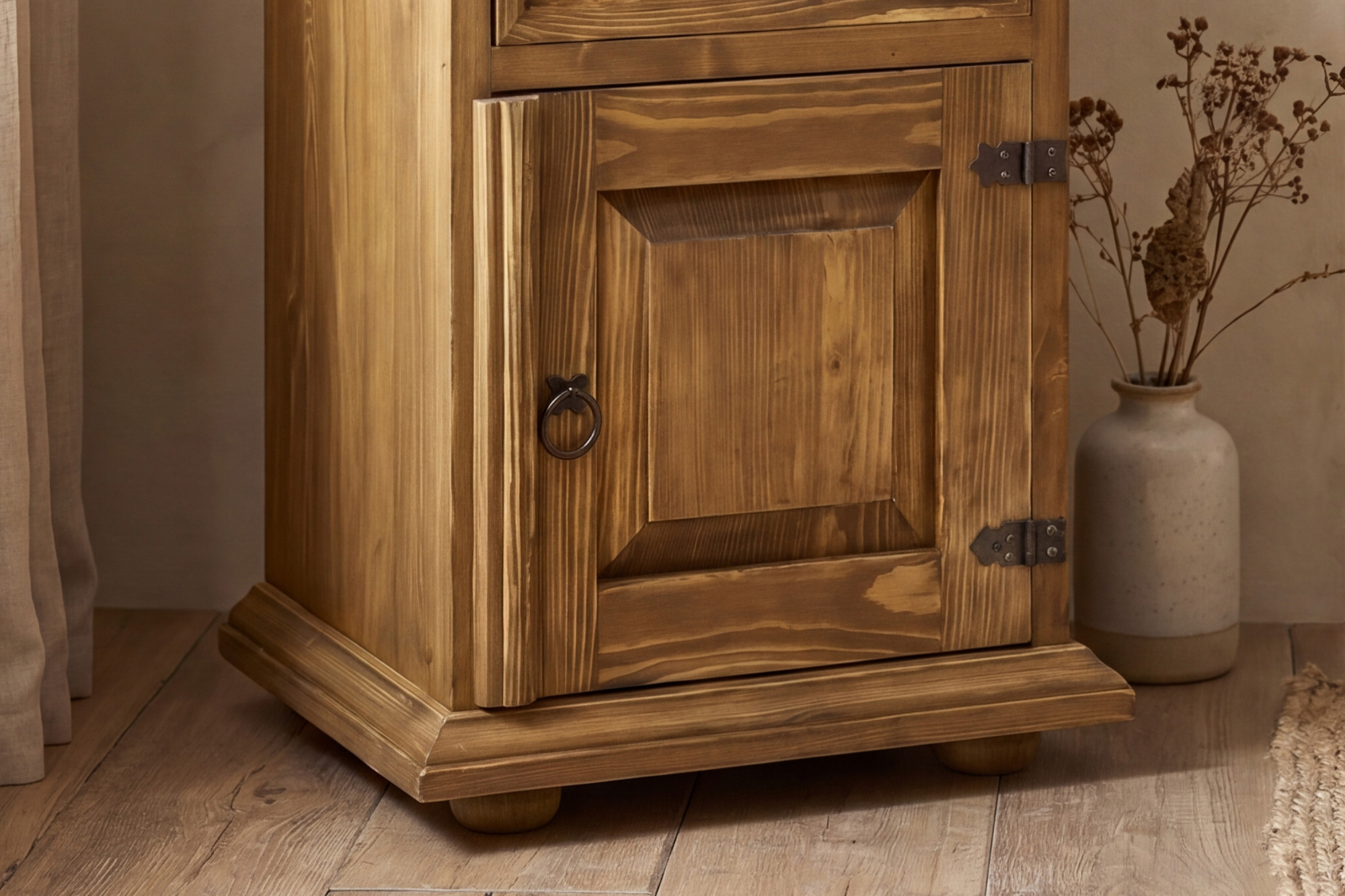 Nachtkommode aus Kiefernholz aus der Kollektion Landhaus ist eine ausgezeichnete Wahl für alle, die ein harmonisches und gemütliches Schlafzimmer schaffen möchten. Sie passt besonders gut zum Ehebett im gleichen Stil und hilft, ein perfekt abgestimmtes Interieur zu gestalten. Rustikale Massivholzmöbel sind nicht nur wegen ihres Aussehens beliebt, sondern auch wegen ihrer Langlebigkeit und Zeitlosigkeit. Diese Kommode besticht durch die Kombination aus Praktikabilität, hochwertigem Material und elegantem Landhausdesign, das modischen Trends nicht unterliegt.