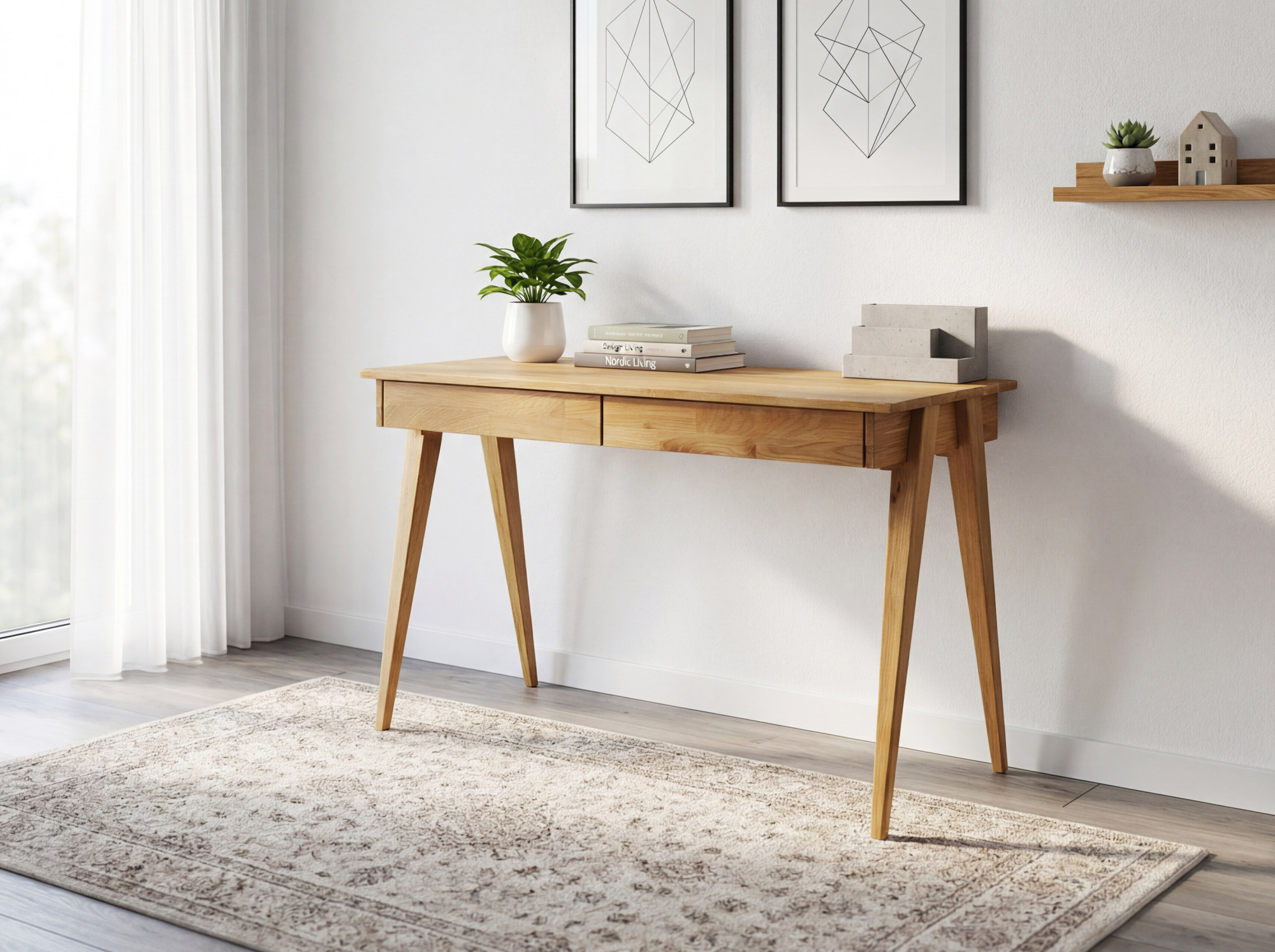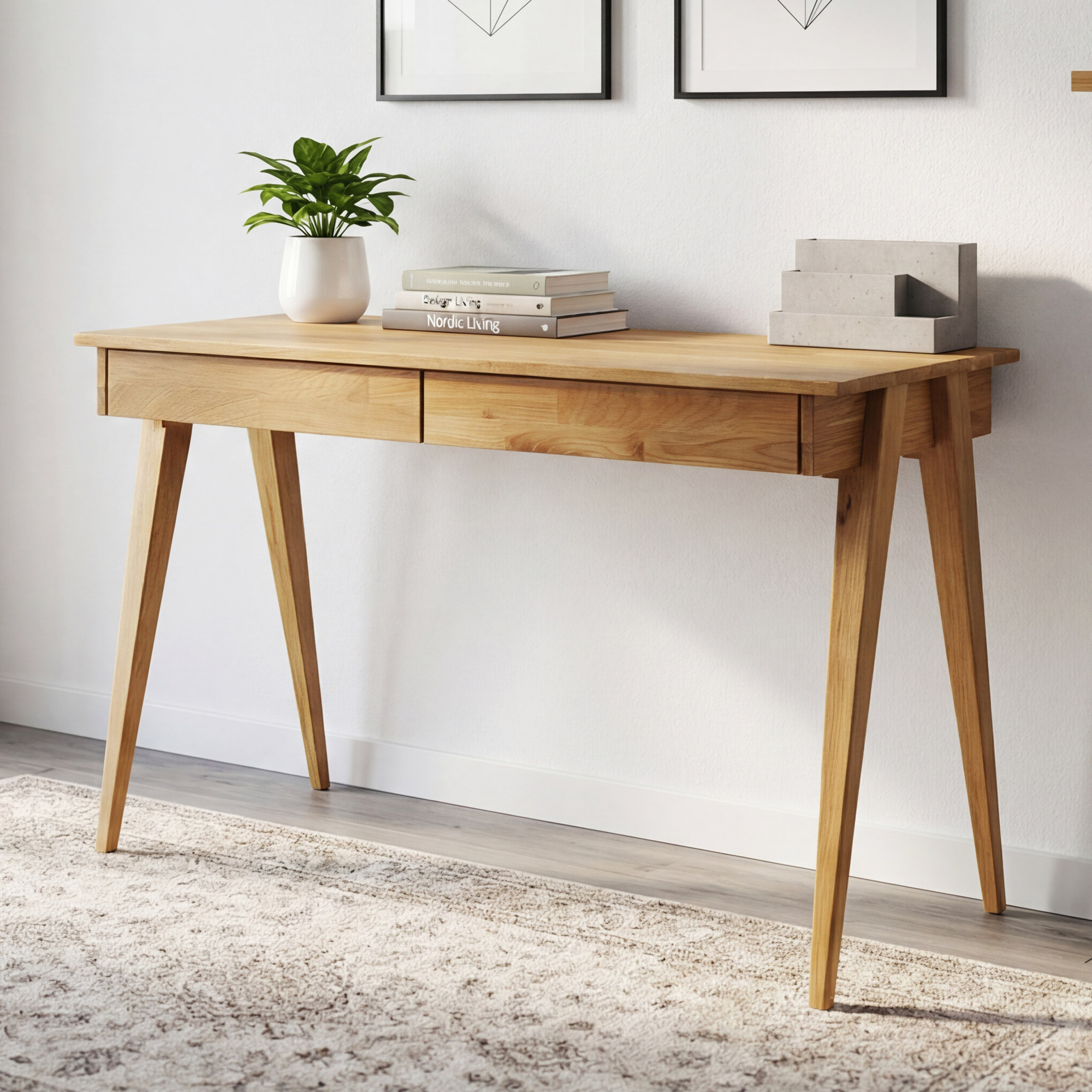 Der PC-Tisch aus Eichenholz bringt in jeden Haushalt eine Kombination aus Robustheit, natürlichem Design und Praktikabilität. Seine rechteckige Form bietet ausreichend Arbeitsfläche für Computer, Monitor oder andere Büroausstattung, während die Beine in Form eines umgedrehten V dem Tisch ein elegantes und luftiges Aussehen verleihen. Die Tischplatte ist im Parkettmuster (Finger Joint) gefertigt und mit natürlichem Öl behandelt, das die Schönheit und Struktur des Eichenholzes hervorhebt. Gleichzeitig sorgt es für Langlebigkeit und schützt die Oberfläche vor Abnutzung. Der Tisch ist zudem mit zwei praktischen Schubladen mit Innenmaßen von 48 (Breite) × 43 (Tiefe) × 5 (Höhe) cm ausgestattet, was genügend Stauraum für Dokumente oder Schreibutensilien bietet.