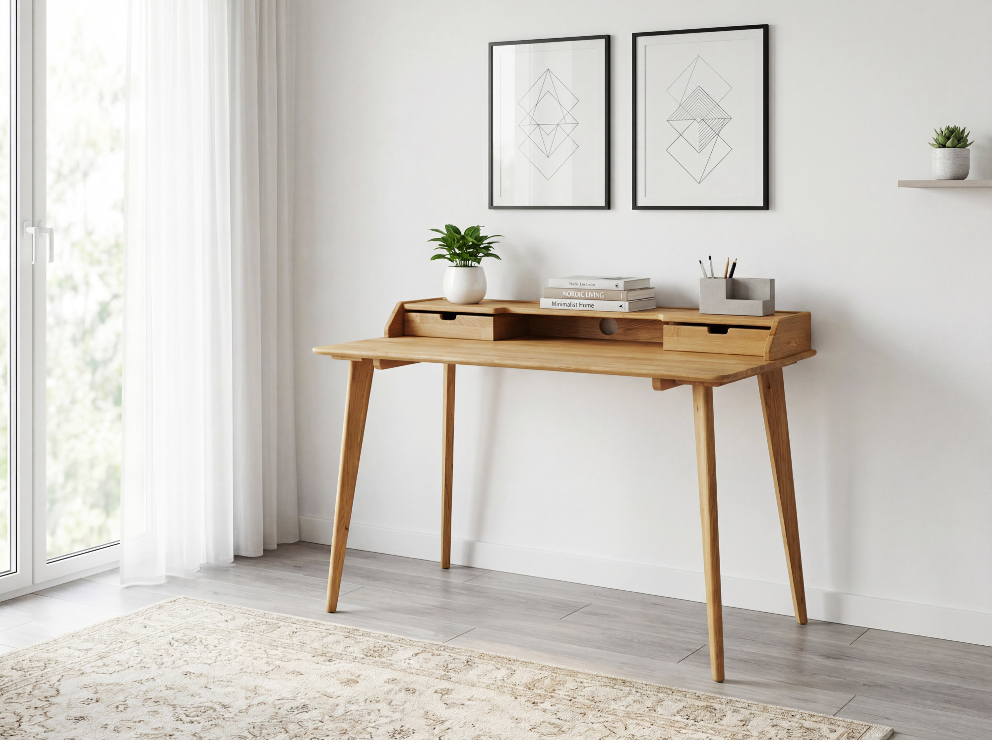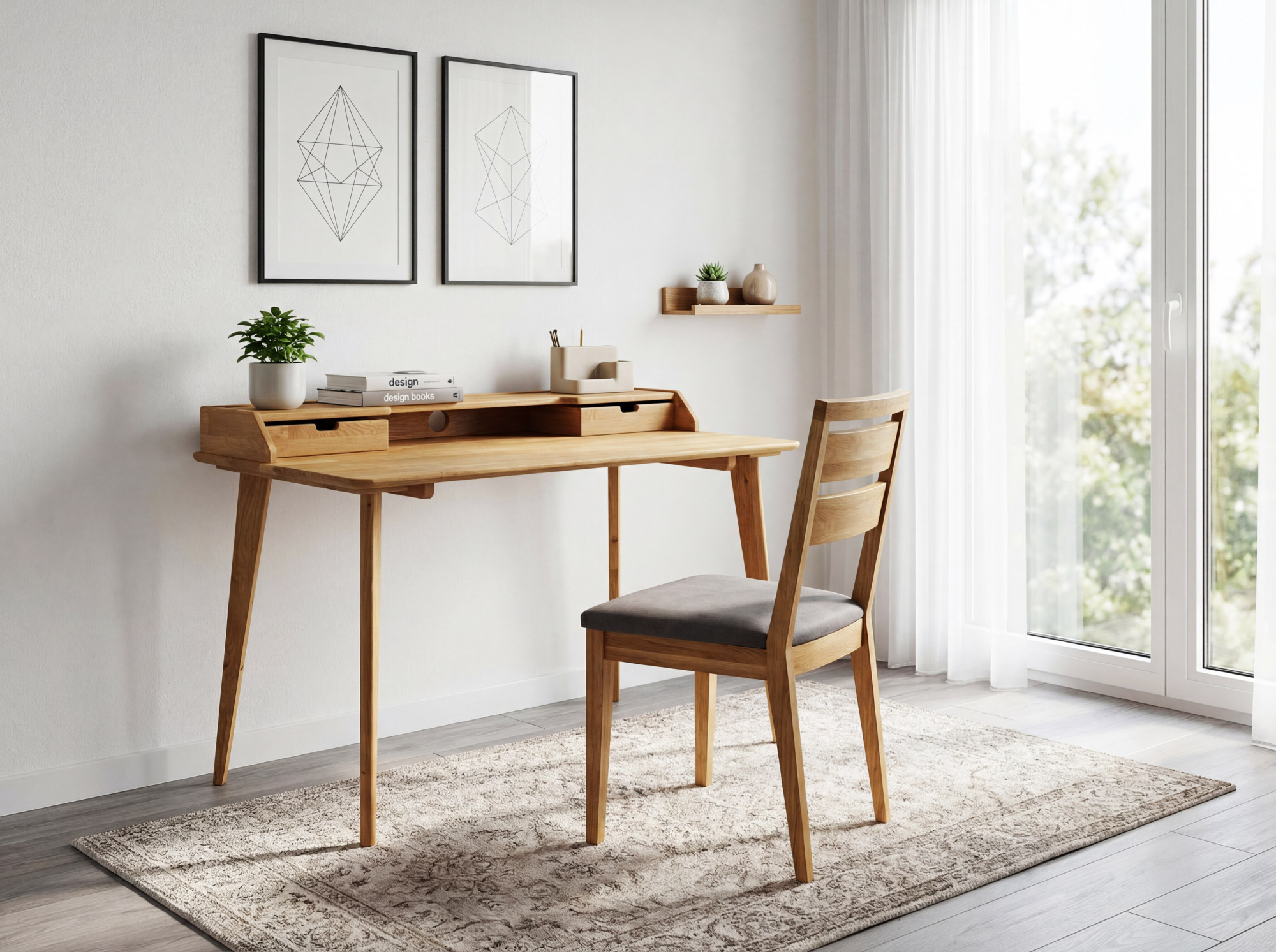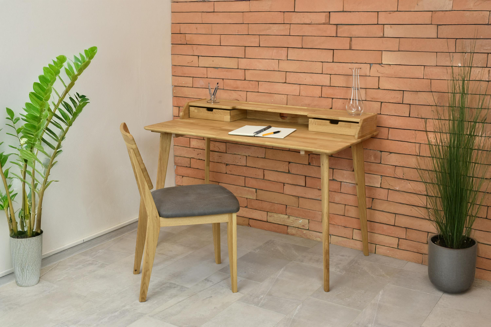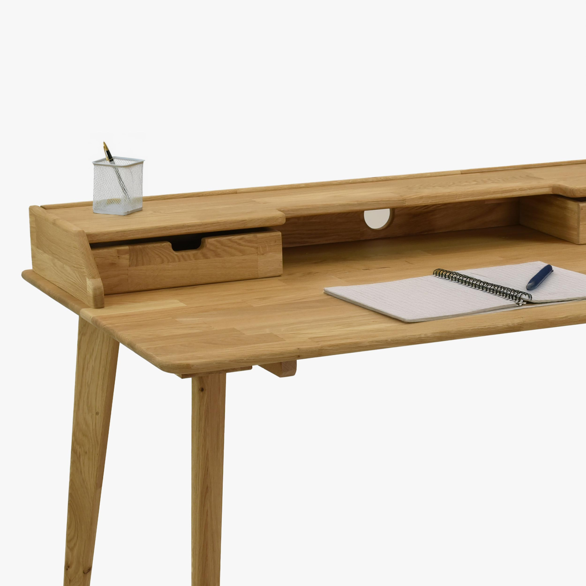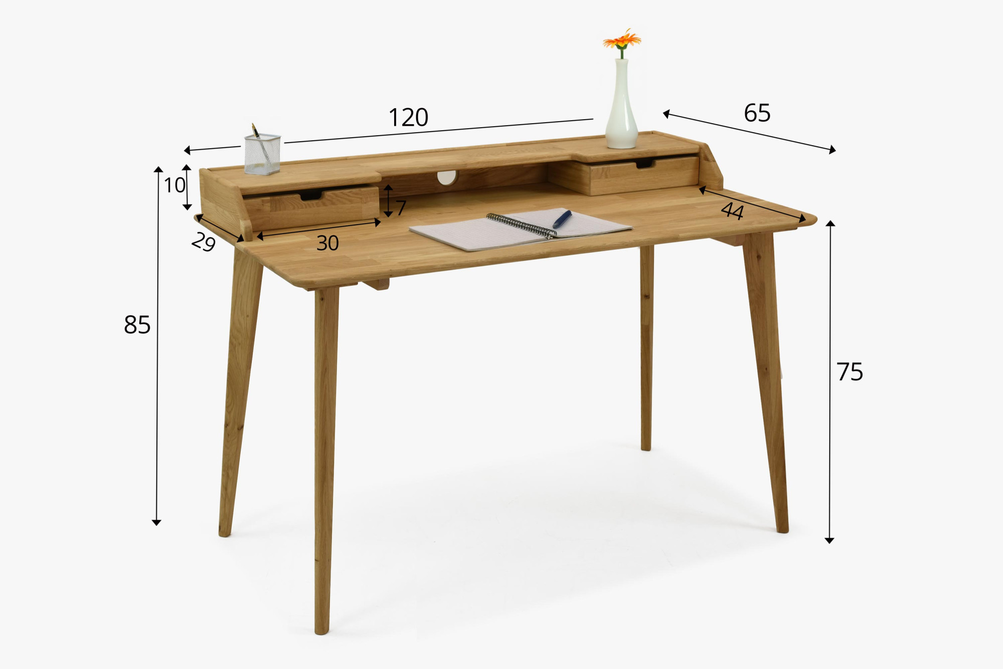 Das praktische Design des Tisches bietet eine ausreichend große Arbeitsfläche, die sich für die Arbeit mit dem Laptop, das Schreiben von Hausaufgaben oder die tägliche Büroarbeit eignet. Im Lieferumfang sind auch zwei kleinere Schubladen zum Aufbewahren von Kleinteilen enthalten, die lose eingelegt und leicht zugänglich sind. Der PC-Tisch wird zerlegt geliefert und ist einfach und intuitiv montierbar. Sein zeitloses Design lässt sich problemlos mit anderen Produkten aus Eichenholz in Ihrem Zuhause kombinieren.