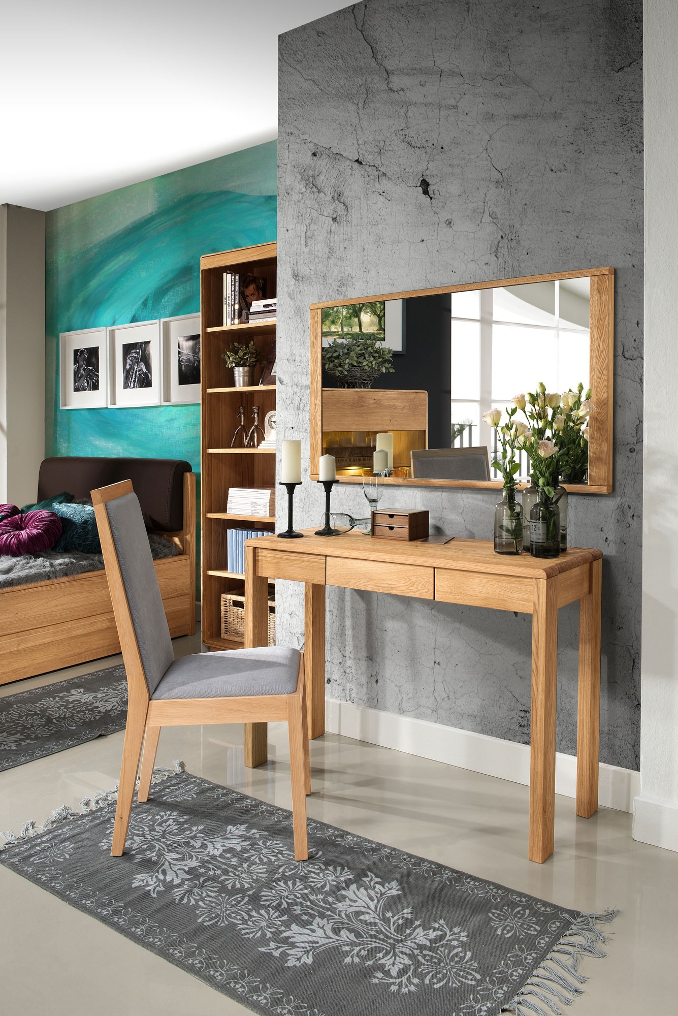 Der Korpus sowie die Tischplatte des Arbeitstisches sind aus massivem Wild-Eichenholz gefertigt und zeichnen sich, wie die anderen Komponenten der Helsinki Kollektion, durch elegant abgerundete Kanten, einen minimalistischen Stil und ein luftiges Design aus.