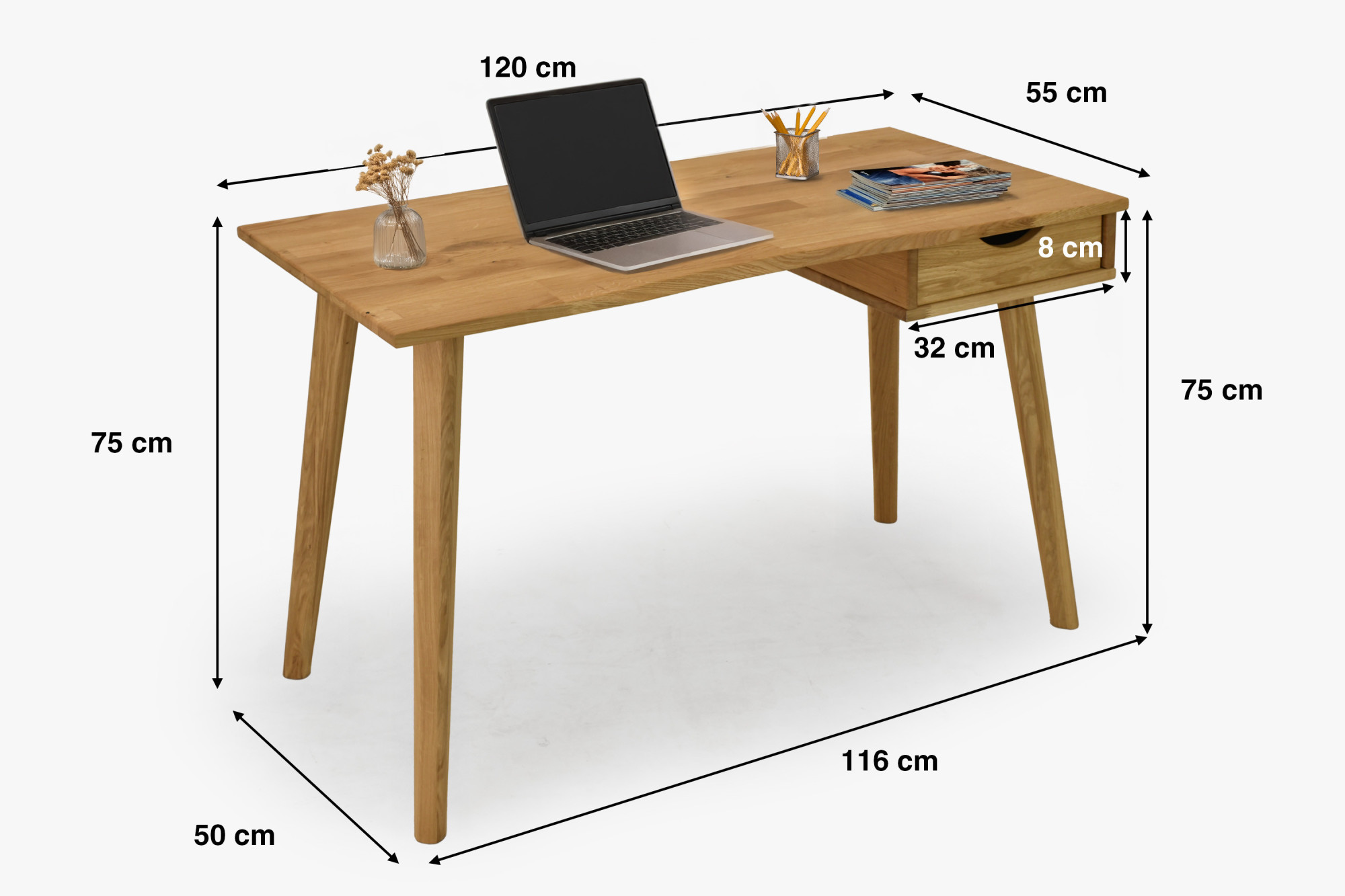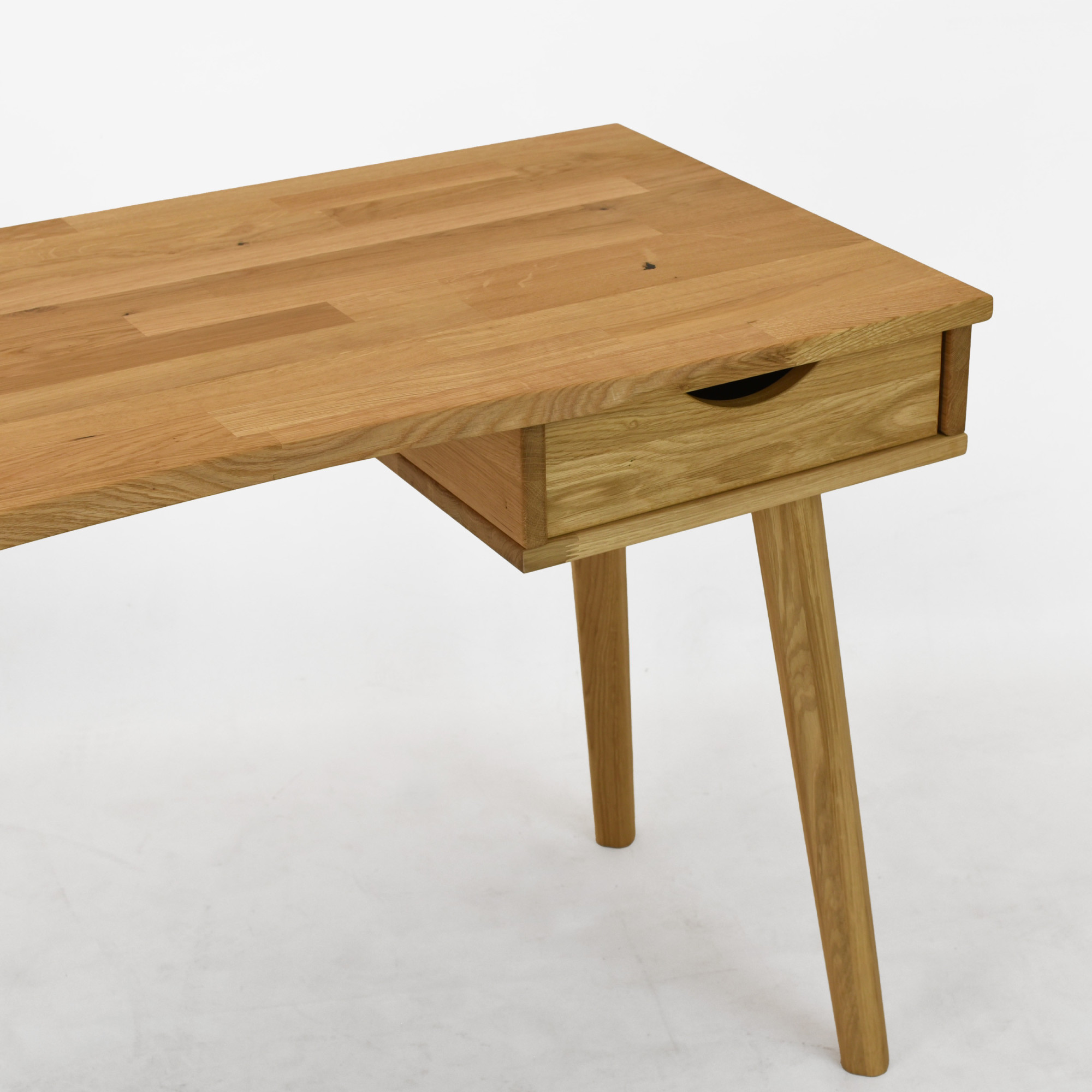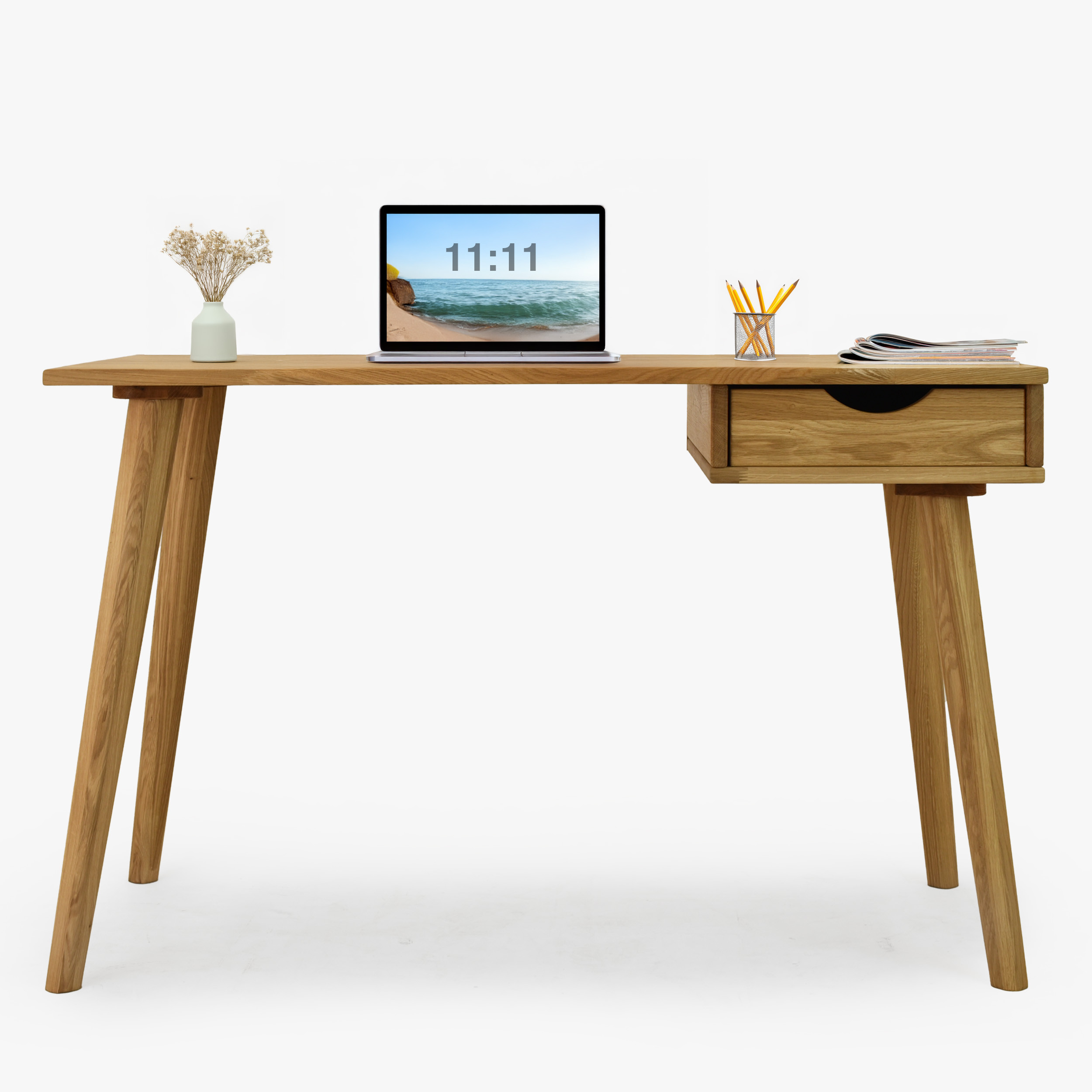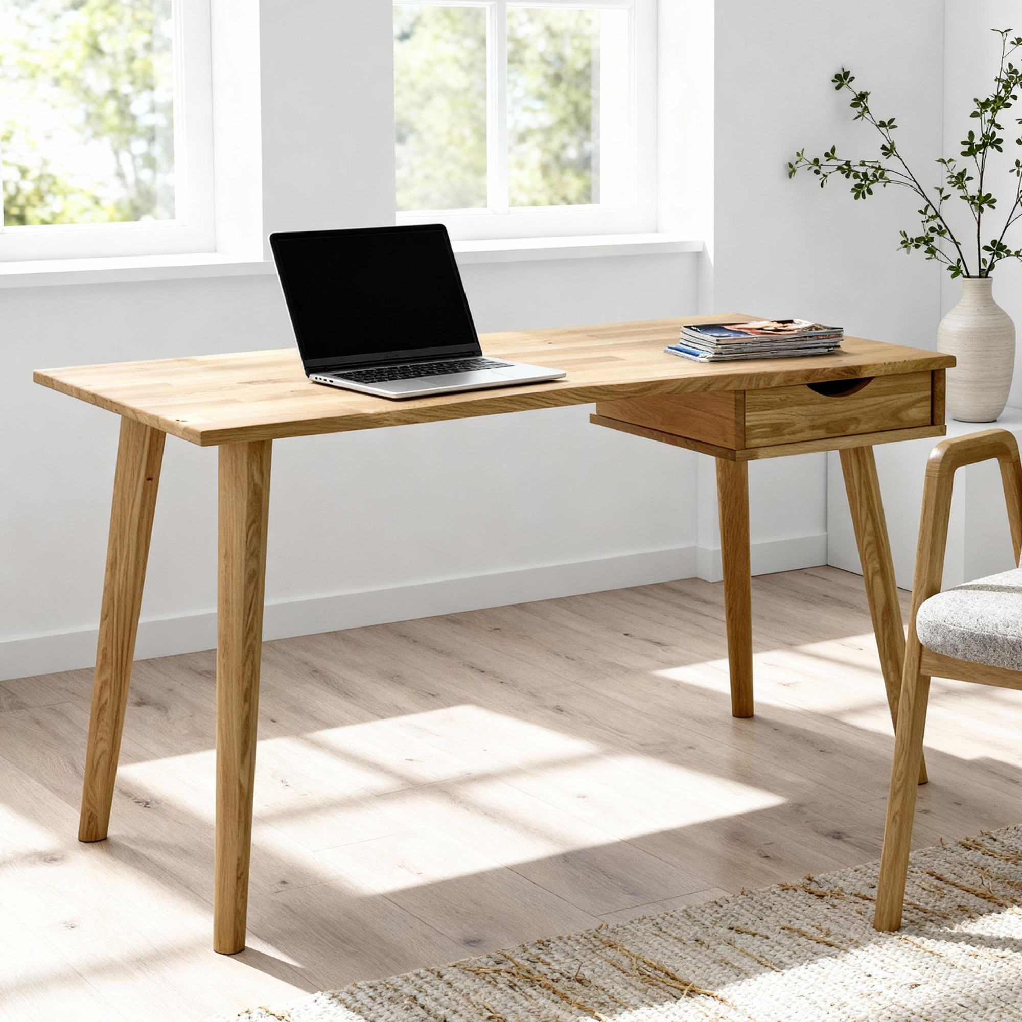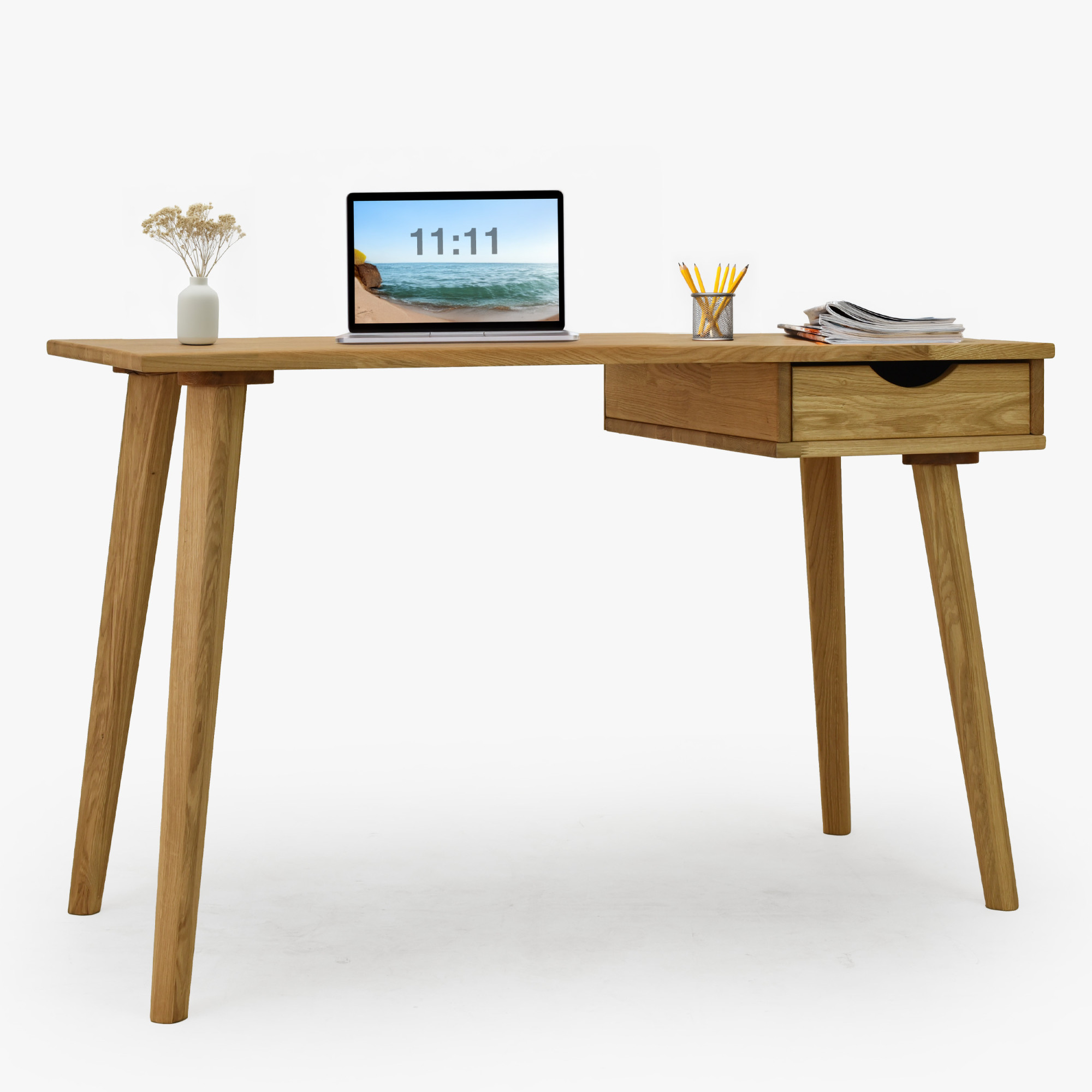 Eleganter Eichen-Schreibtisch Juraj ist die ideale Wahl für alle, die Funktionalität, modernes Design und die Qualität von Naturholz verbinden möchten. Dieser Schreibtisch ist aus massivem Eichenholz in natürlichem Farbton Eiche natur gefertigt, das mit hochwertigem Öl behandelt wurde, welches für lange Haltbarkeit, Abriebfestigkeit und einfache Pflege sorgt. Dank seines minimalistischen Designs passt er perfekt in moderne Wohnungen, Arbeitsecken und Home-Offices. Die praktische Schublade auf der rechten Seite bietet ausreichend Platz zur Aufbewahrung von Dokumenten, Schreibutensilien oder kleinen Accessoires, die Sie immer griffbereit haben möchten.