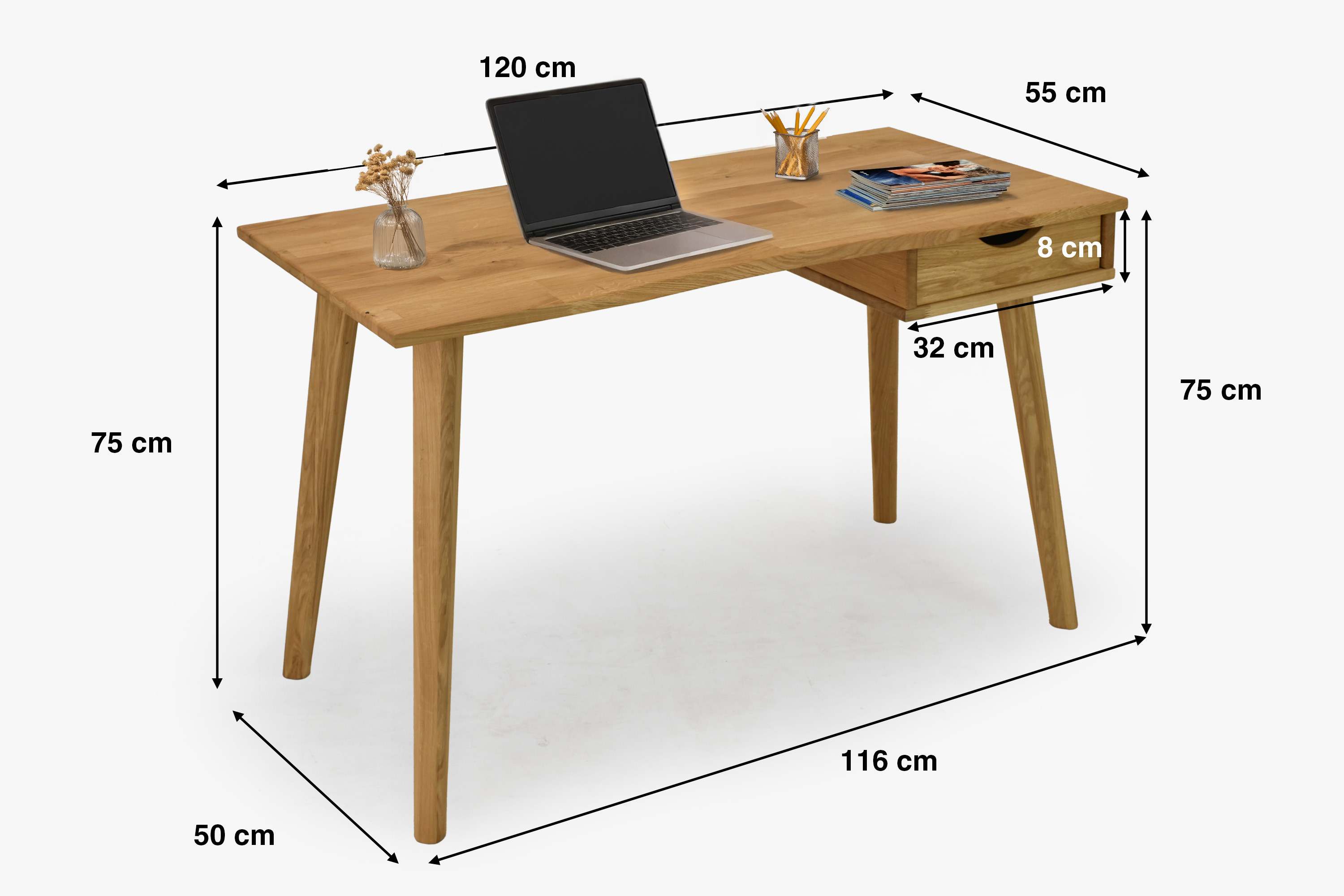 Ja, der Schreibtisch ist so gestaltet, dass er mit weiteren Produkten aus Eichenholz harmoniert – Kommoden, Stühlen oder Regalen.