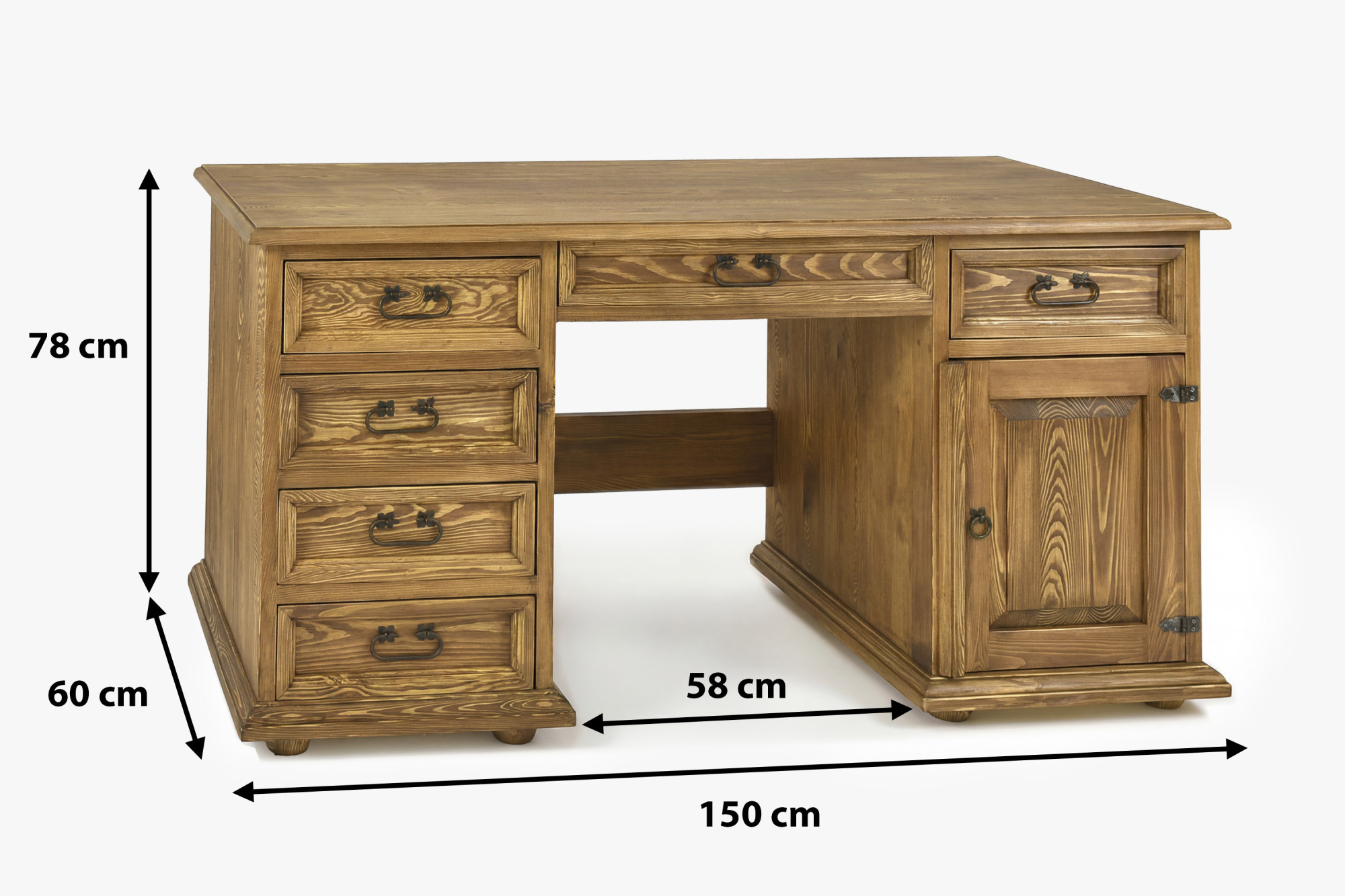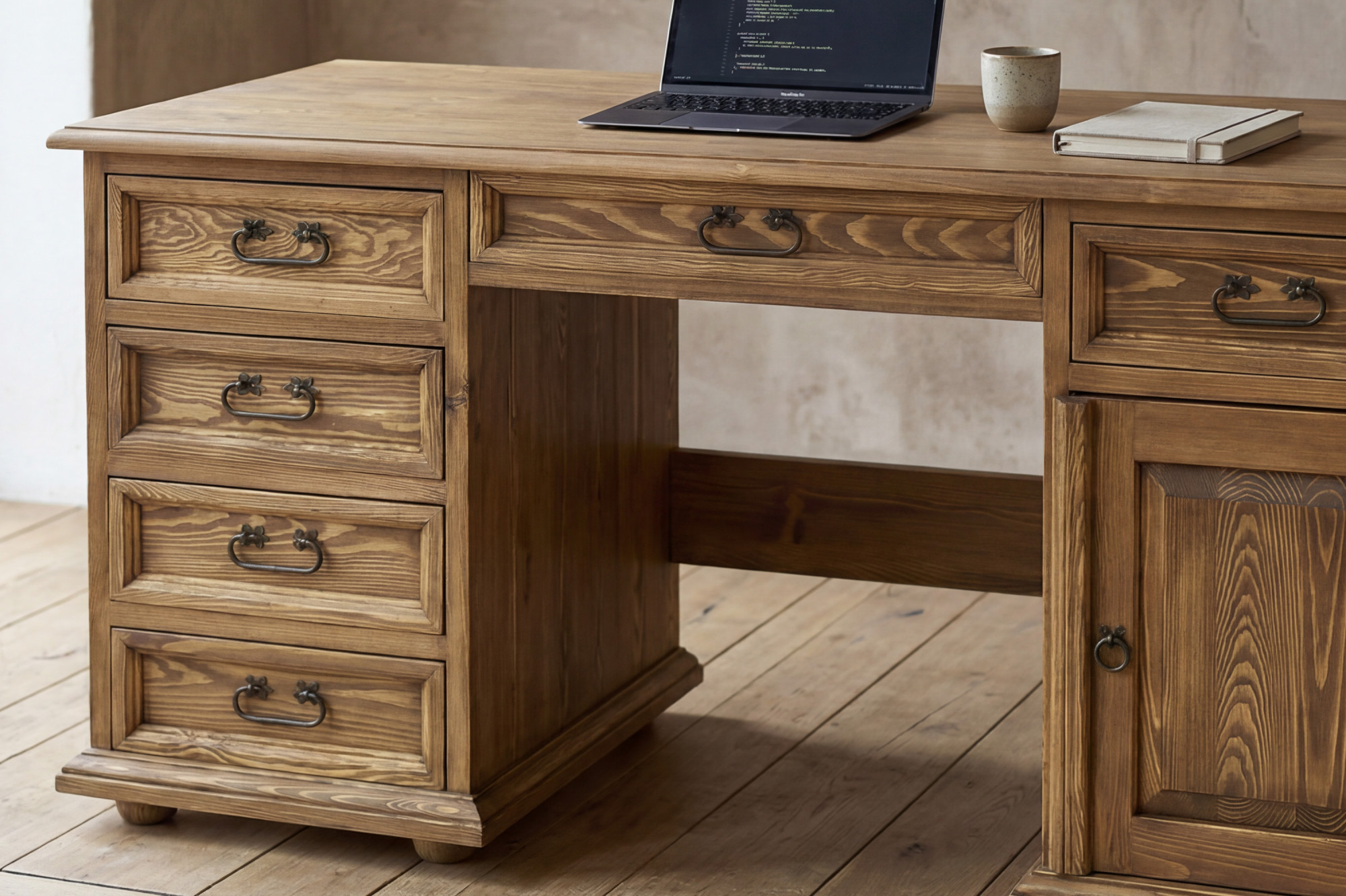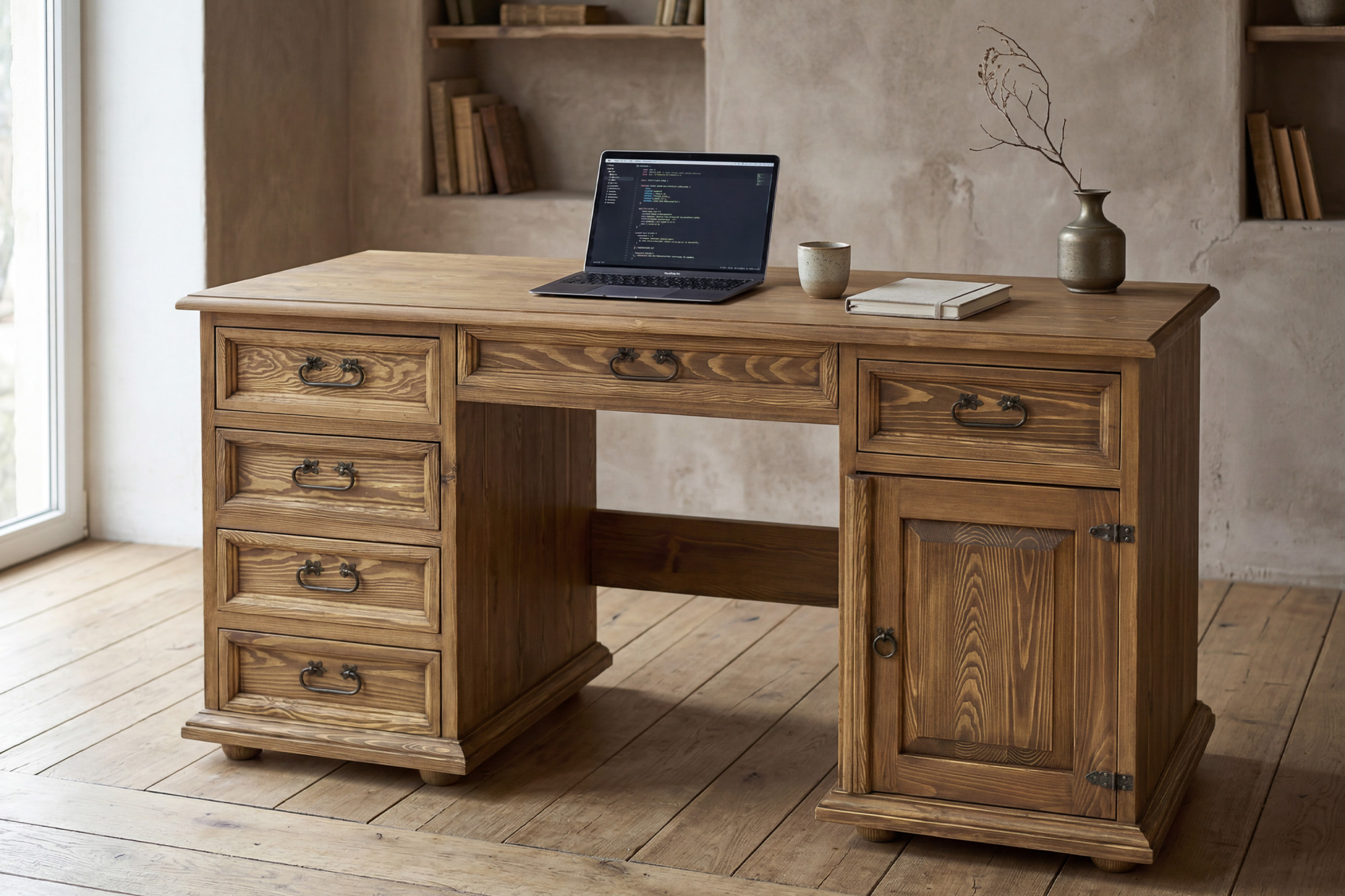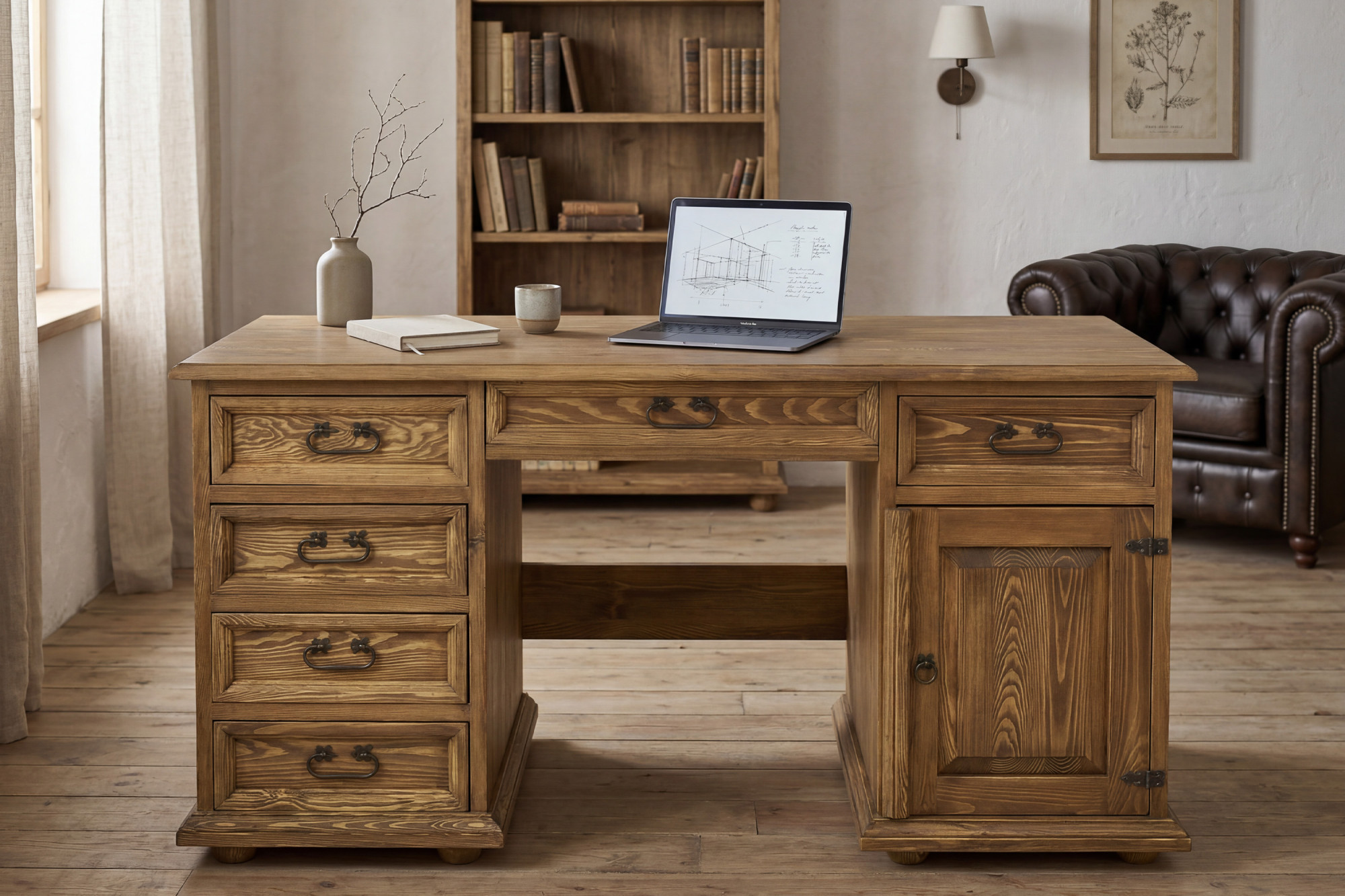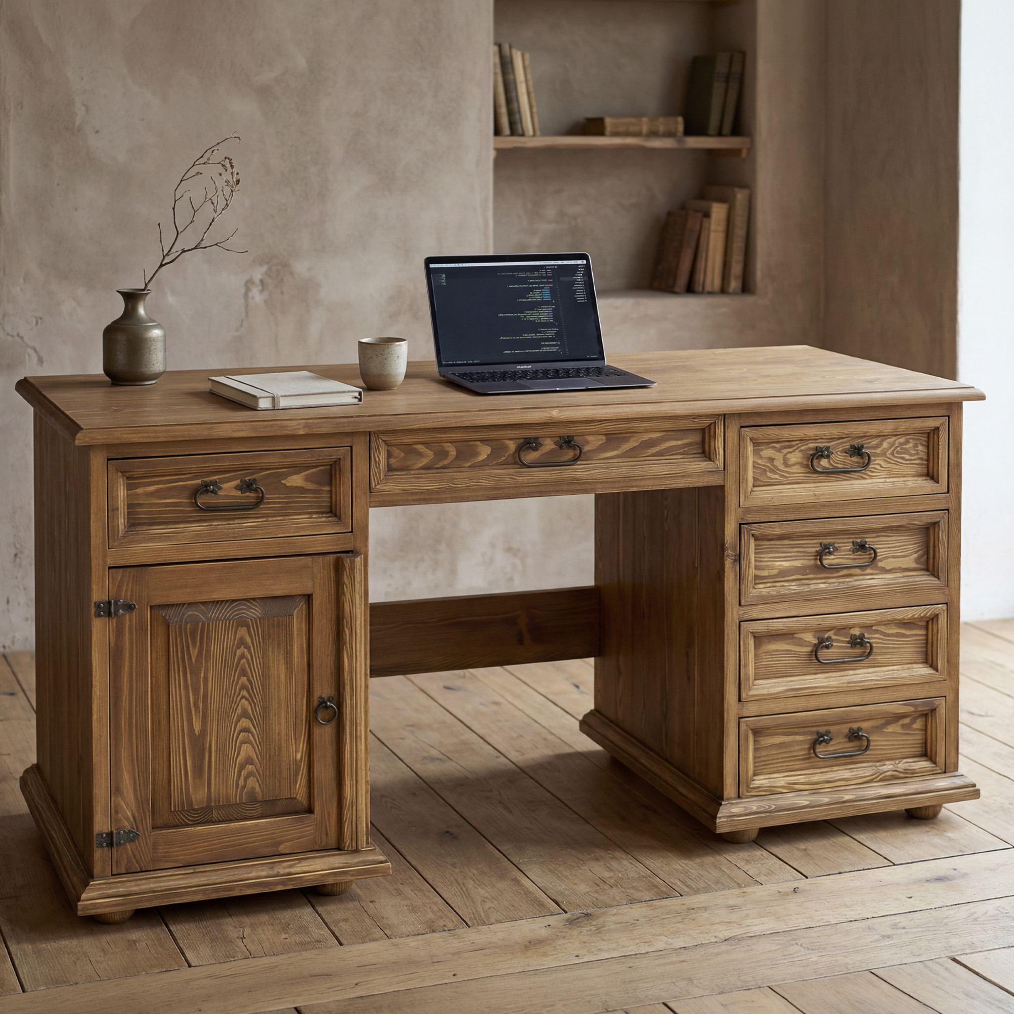 Dieser massive Schreibtisch ist die perfekte Wahl für alle, die Eleganz, ehrliches Material und Funktionalität suchen. Die großzügige Arbeitsplatte mit einer Breite von 150 cm bietet ausreichend Platz für Computer, Lampe, Schreibutensilien und die tägliche Arbeit von zuhause. Dank der Kombination aus Schubladen, Schrank und Mittelschublade haben Sie alles übersichtlich geordnet und stets zur Hand. Die rustikale Ausführung mit gewachster Oberfläche verleiht dem Möbelstück zudem einen authentischen Charakter und ein angenehmes Naturbild.