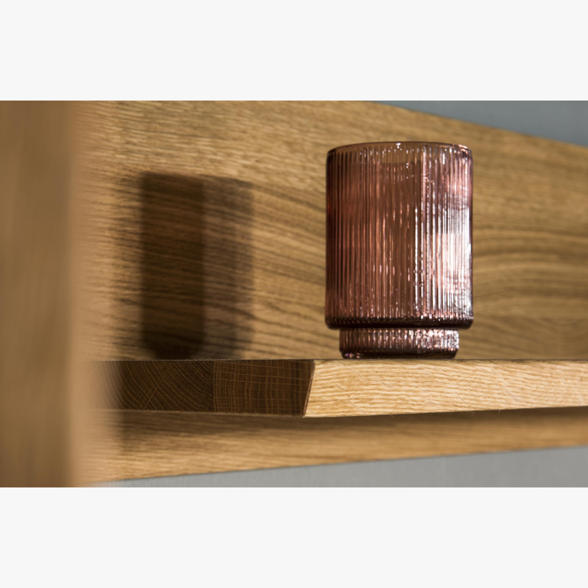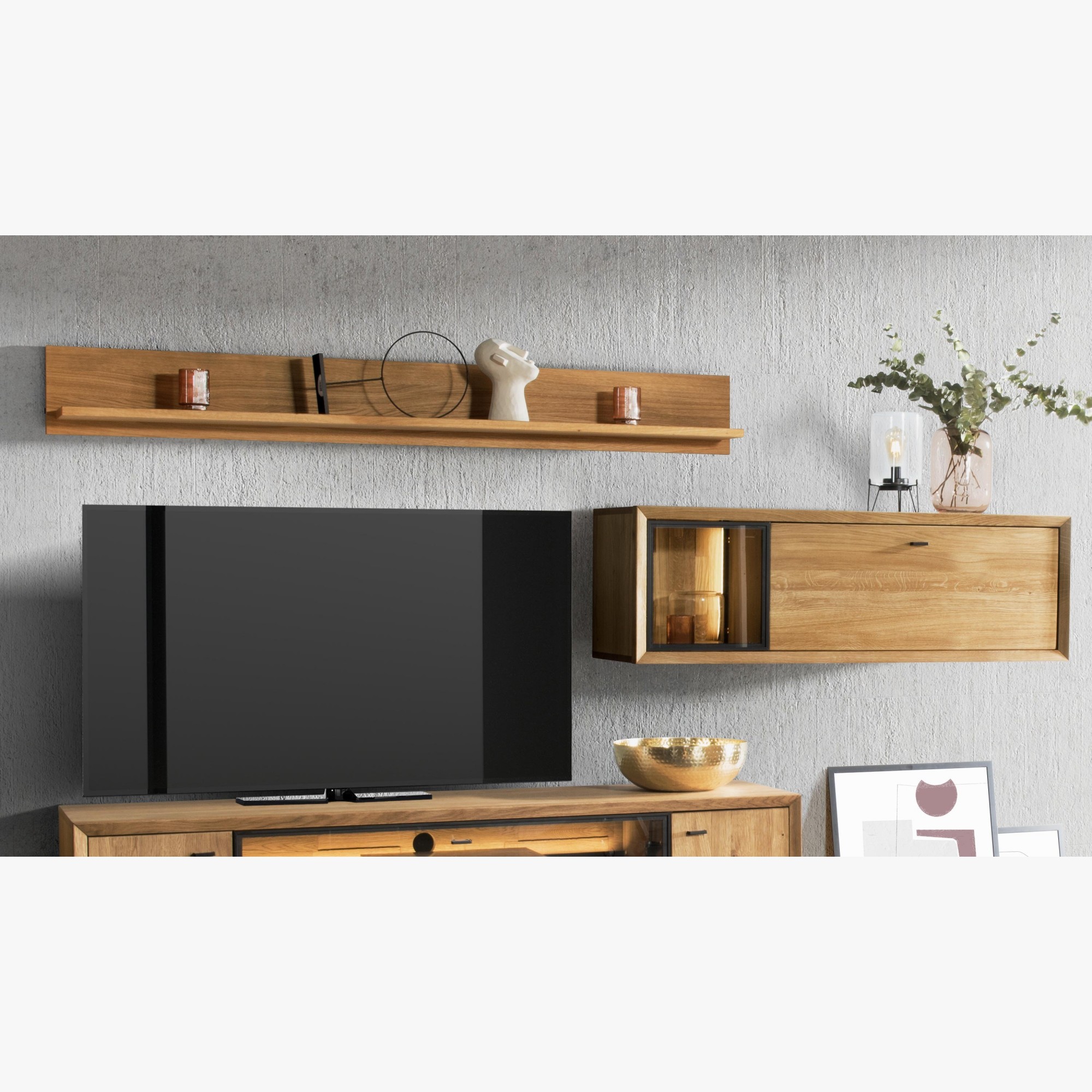 Wandhängendes Regal mit Ablagen. Das Regal wird direkt an der Wand gemäß der beiliegenden Anleitung installiert und ist für die Erstellung einer kompletten Wohnwand gedacht. Es lässt sich am besten direkt mit dem Fernsehschrank aus der Kollektion Vilo kombinieren. Das Regal ist aus einer Kombination von Eichenholz und natürlicher Eichenfurnier hergestellt, wird zerlegt geliefert und ist einfach zu montieren.