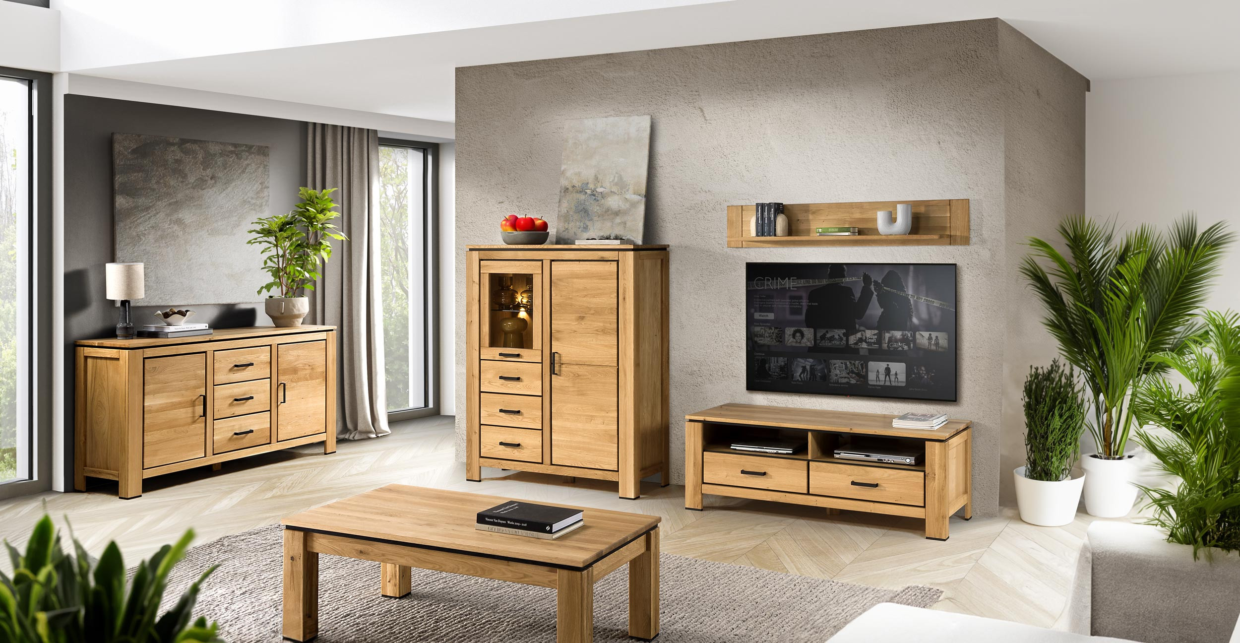 - Sind die Möbel aus natürlichem Holz gefertigt? Ja, die Möbel bestehen aus echtem Eichenholz und sind mit natürlichem Eichenfurnier ergänzt.