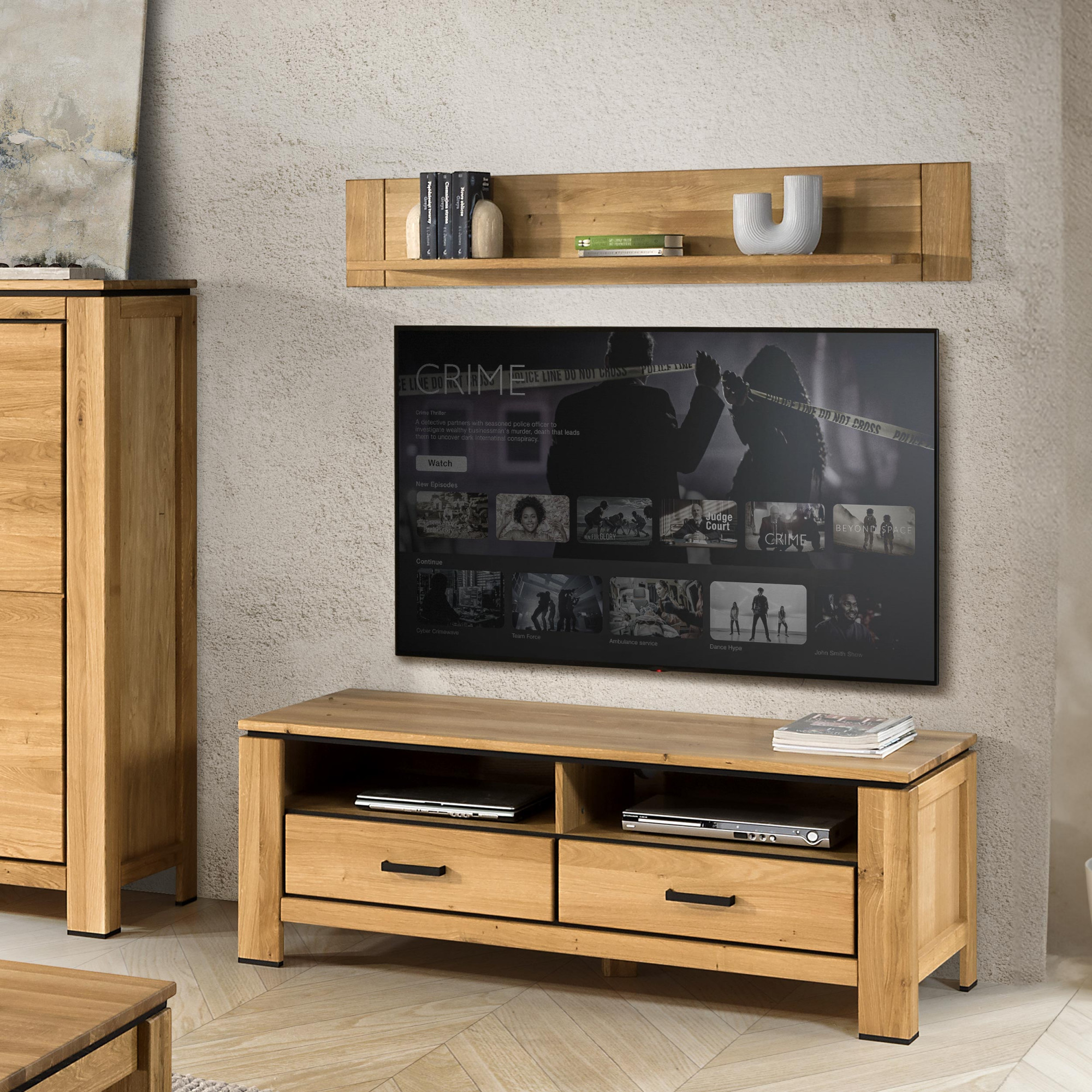 Möbel der Kollektion New Line II sind die Verkörperung handwerklicher Tradition verbunden mit modernen Trends. Hergestellt aus hochwertigem Eichenholz ist jedes Stück einzigartig und mit Blick auf Details und Langlebigkeit entworfen. Die Vorderteile, die obere Platte und die tragende Konstruktion sind aus massivem Eichenholz gefertigt, während die Seitenfüllungen und der Innenkorpus mit natürlicher Eichenfurnier ausgeführt sind, was ein einheitliches Erscheinungsbild mit natürlicher Struktur und Farbgebung gewährleistet. Investieren Sie in Qualität, die jahrelang hält und zu einem dominanten Element Ihres Interieurs wird.