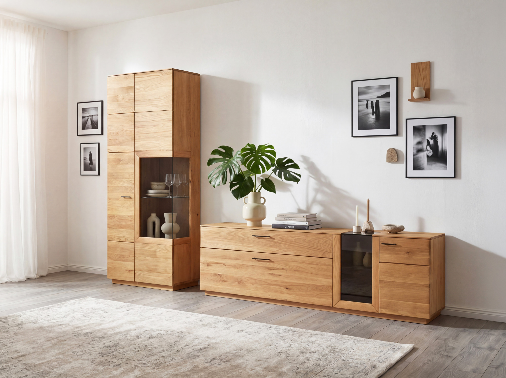 Die Bosco Kollektion bietet moderne Möbel aus Naturholz, die für Wohn- und Esszimmer bestimmt sind. Alle Teile werden vollständig montiert geliefert, wodurch eine komplizierte Möbelmontage entfällt. Ein charakteristisches Merkmal dieser Reihe sind die sanft abgerundeten Kanten und Abschlüsse, die den Möbeln ein luxuriöses und elegantes Erscheinungsbild verleihen, ohne massig zu wirken. Die Oberfläche ist mit Öl im Farbton Eiche Natur behandelt, das die natürliche Struktur und Maserung des Holzes schön hervorhebt. Durch die Kombination des Paneels mit weiteren Teilen der Kollektion schaffen Sie ein harmonisches und einheitliches Interieur im zeitlosen Stil.