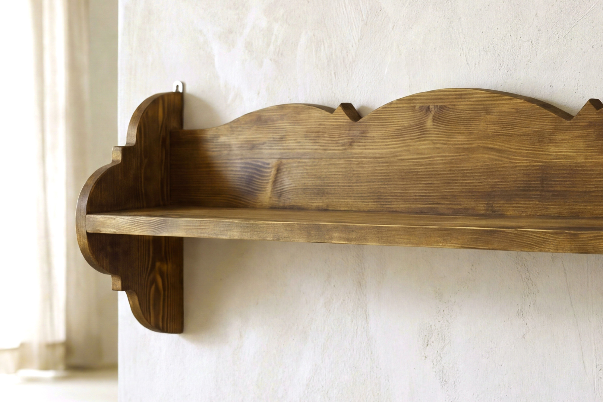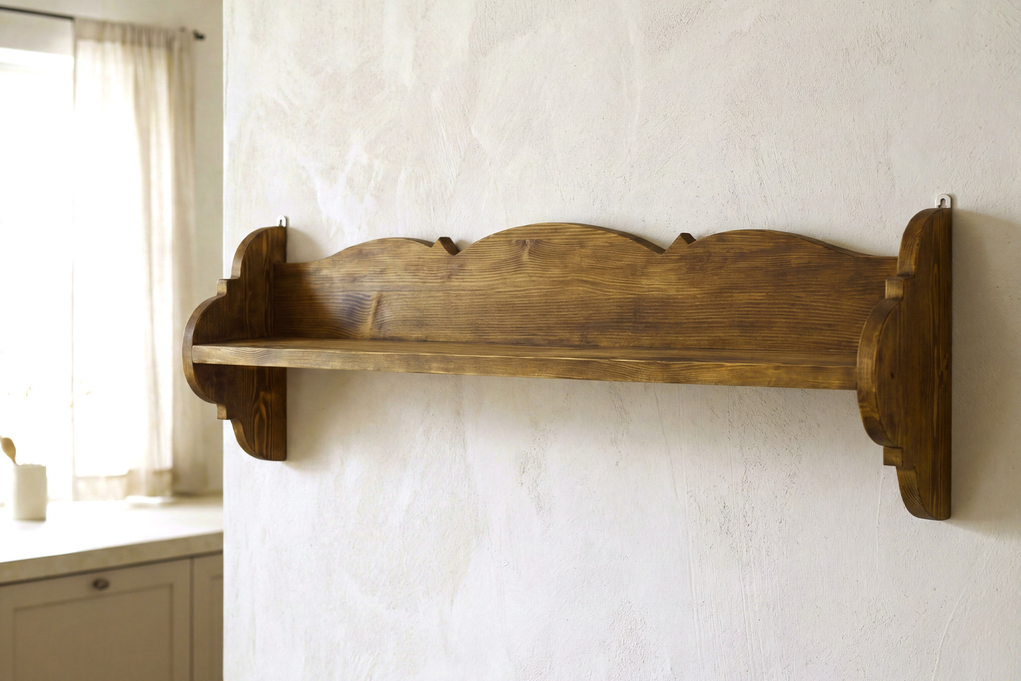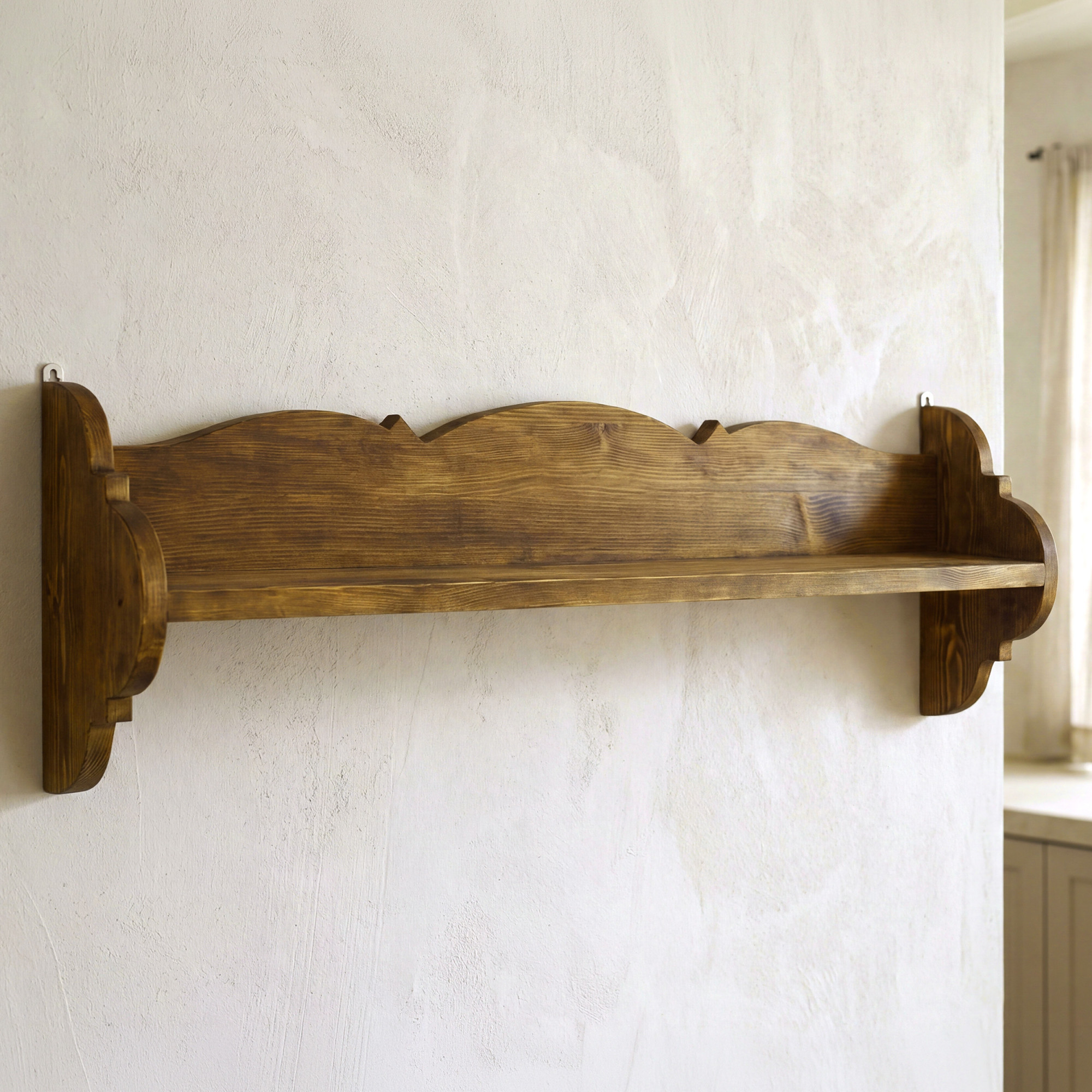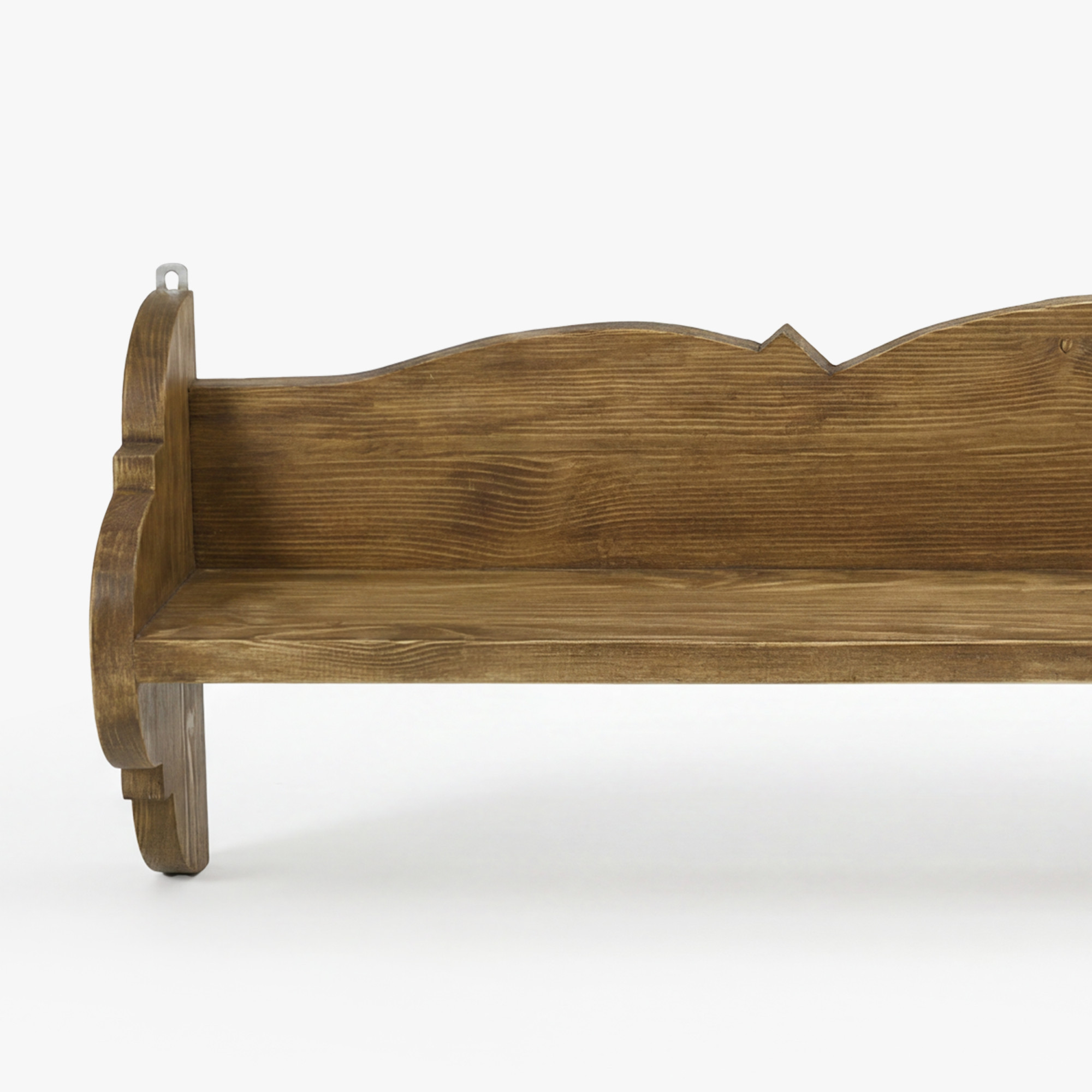 Die Oberfläche des Regals ist mit hochwertigem Supreme Max Wachs im Farbton Ruggeri Brown, auch bekannt als dunkler Honig, behandelt. Diese Oberflächenbehandlung betont die natürliche Maserung des Kiefernholzes, unterstreicht den rustikalen Charakter der Möbel und schützt gleichzeitig die Oberfläche bei normaler Nutzung. Das Regal ist zur Wandmontage vorgesehen – je nach Bedarf kann es entweder mit Haken oder Schrauben befestigt werden. Ein großer Vorteil ist, dass es montiert und als ein Stück geliefert wird, sodass eine aufwändige Montage entfällt.