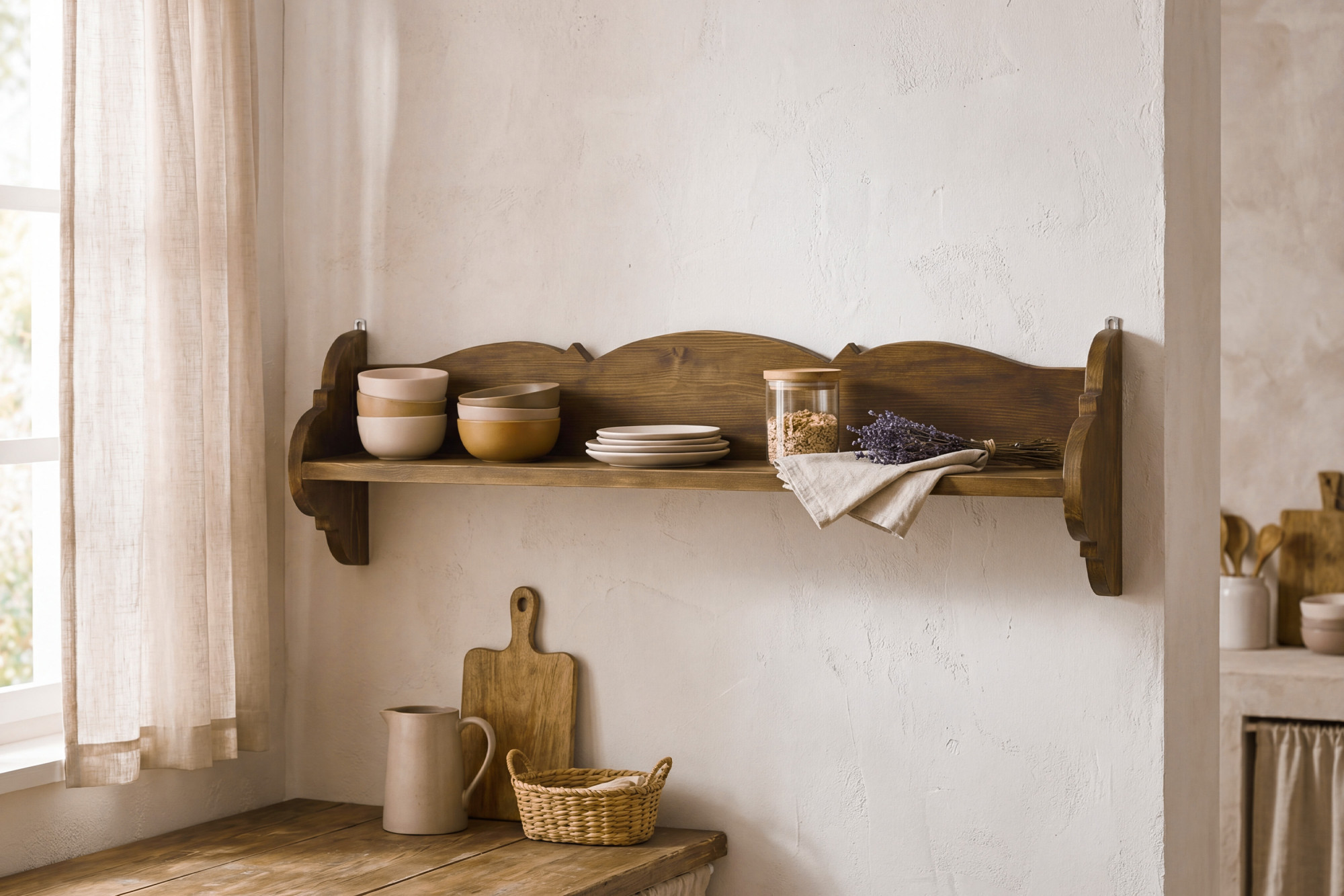 Rustikales Regal aus Massivholz ist nicht nur ein praktischer Zusatz, sondern auch ein markanter Designelement. Es eignet sich hervorragend zur Präsentation von Dekorationen, Keramik, Fotos, Kräutern oder Küchenutensilien. Dank seiner kompakten Tiefe von 15 cm wirkt es nicht wuchtig, bietet aber dennoch ausreichend Ablagefläche. Sein elegantes Landhausdesign lässt sich hervorragend mit weiteren Möbelstücken der Serie Venkov kombinieren, die gemeinsam ein harmonisches und gemütliches Zuhause schaffen.
