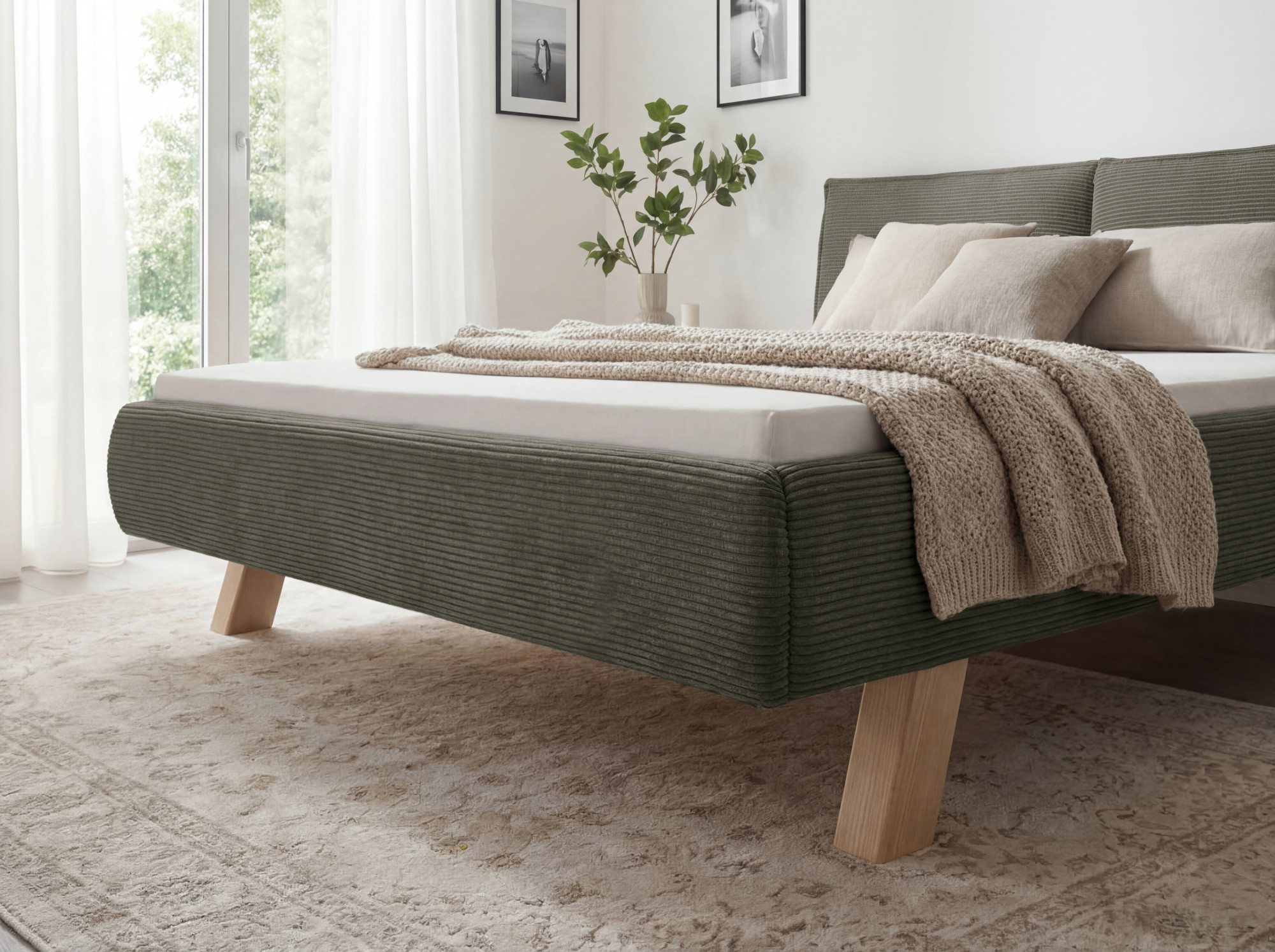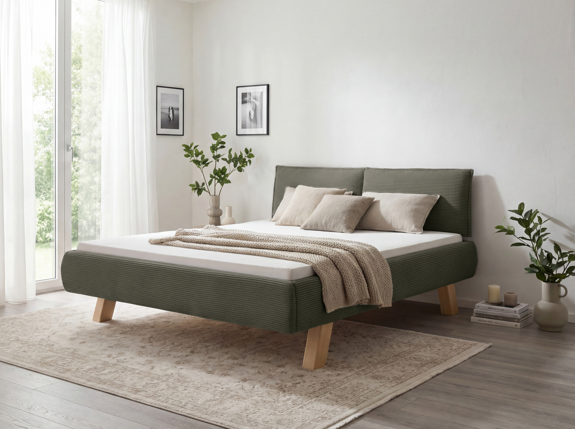Suchen Sie ein doppeltes Bett, das modernes Design mit hochwertiger Verarbeitung verbindet? Wir präsentieren Ihnen ein polstertes Bett in der Größe 180 x 200 cm, das zum Blickfang in Ihrem Schlafzimmer wird. Das Bett ist mit angenehmem Stoff bezogen, der eine Cord-Optik aufweist und sich samtweich anfühlt. Die grüne Farbe verleiht Ihrem Interieur Frische und Eleganz und lässt sich leicht mit natürlichen sowie modernen Elementen kombinieren. Das tragende Gestell besteht aus massivem Holz, was für lange Lebensdauer und Stabilität des Bettes sorgt.