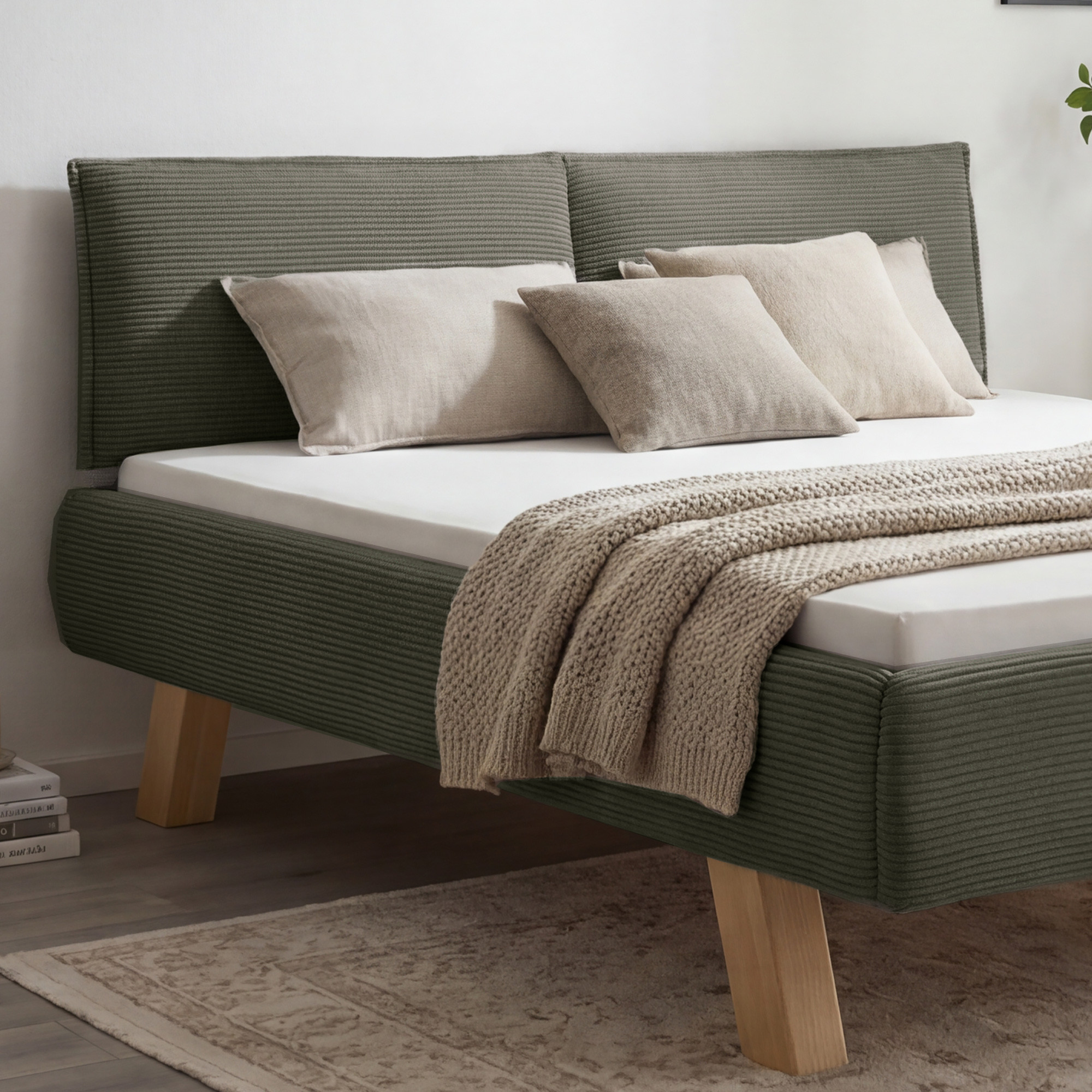 Doppelter Polsterbett 180 x 200 cm in grüner Farbe – elegantes Stoffbett auf Holzfüßen