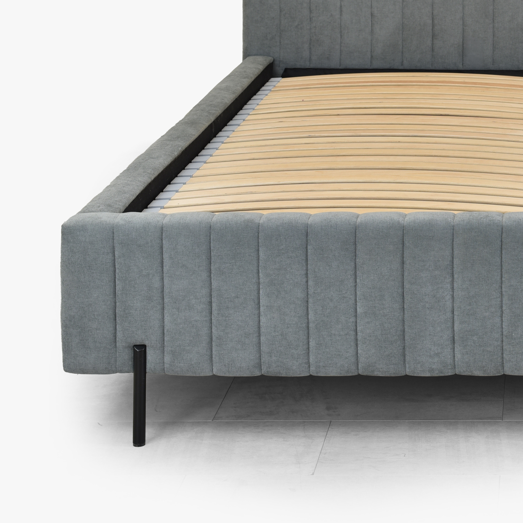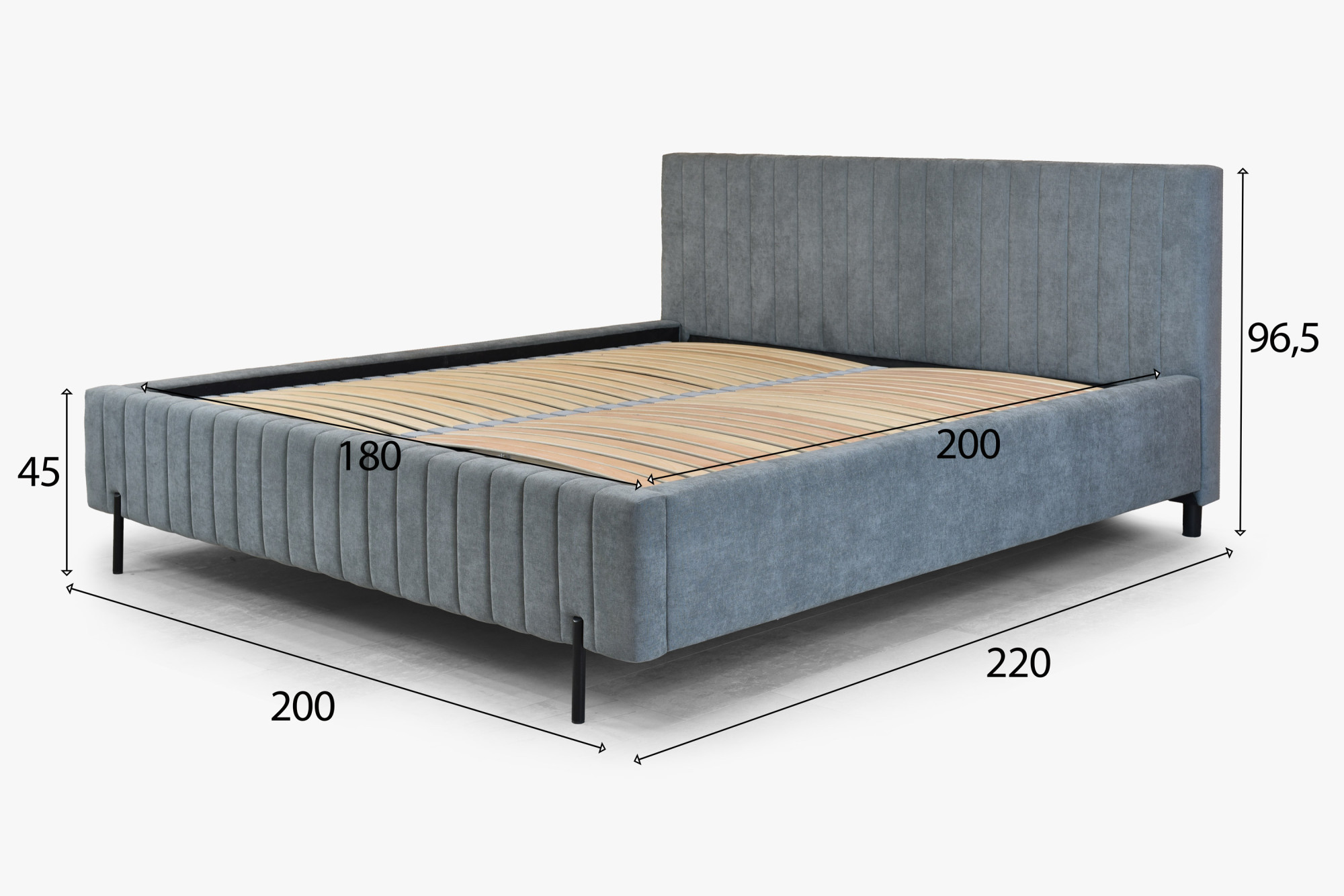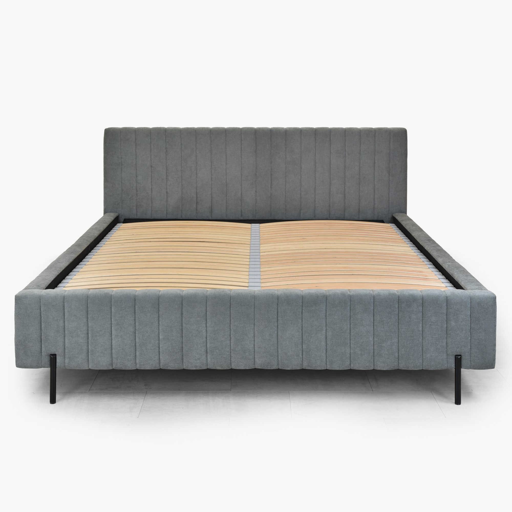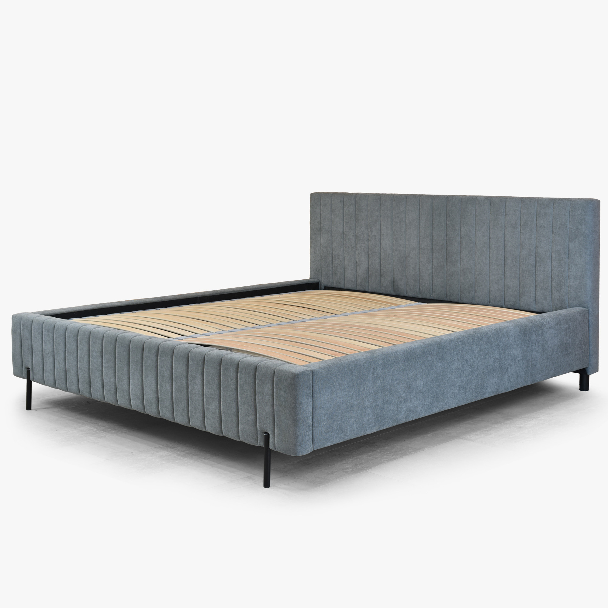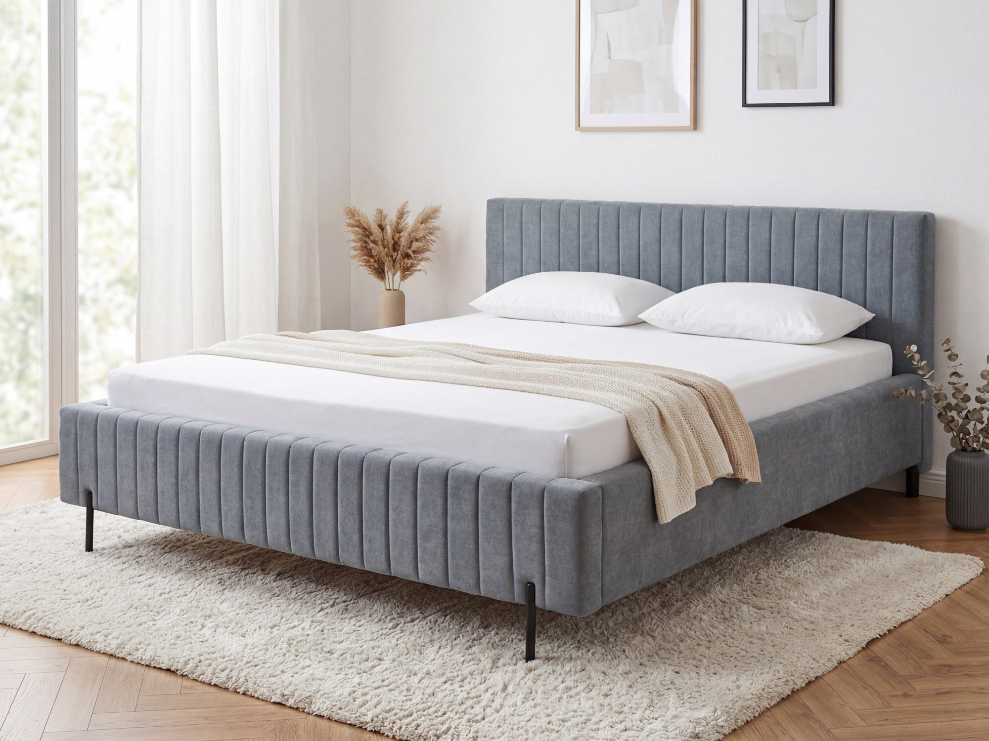 Der tragende Rahmen des Bettes besteht aus einer Kombination aus Holz und Spanplatte, was Stabilität und Langlebigkeit garantiert. Schlanke Metallfüße in schwarzer Farbe verleihen dem Bett ein luftiges Erscheinungsbild und machen das Design optisch leicht. Der Velvet Wind 89 Stoff ist 100 % Polyester mit einem Flächengewicht von 230 g/m² und weist eine Martindale-Beständigkeit von 30.000–40.000 Zyklen auf, wodurch er auch bei normaler Nutzung makellos bleibt. Die Pillingfestigkeit auf Stufe 4–5 sorgt dafür, dass die Oberfläche glatt bleibt und keine unerwünschten Knötchen entstehen.