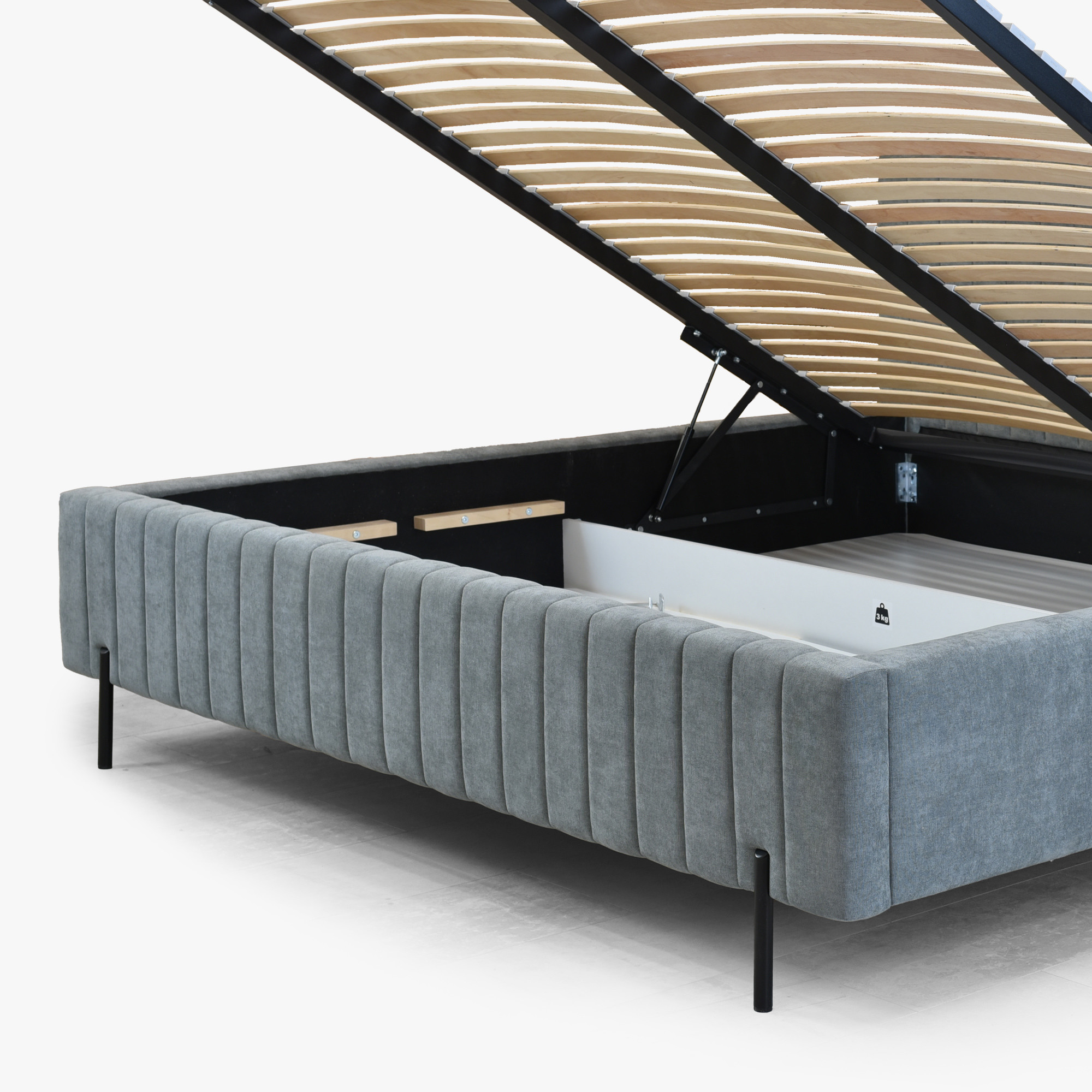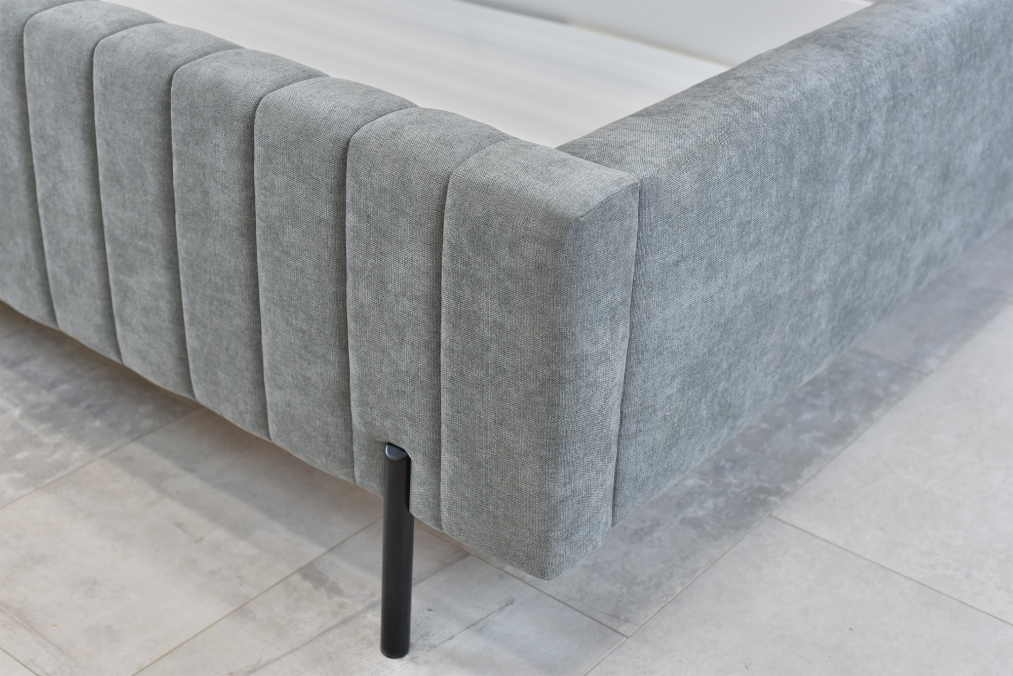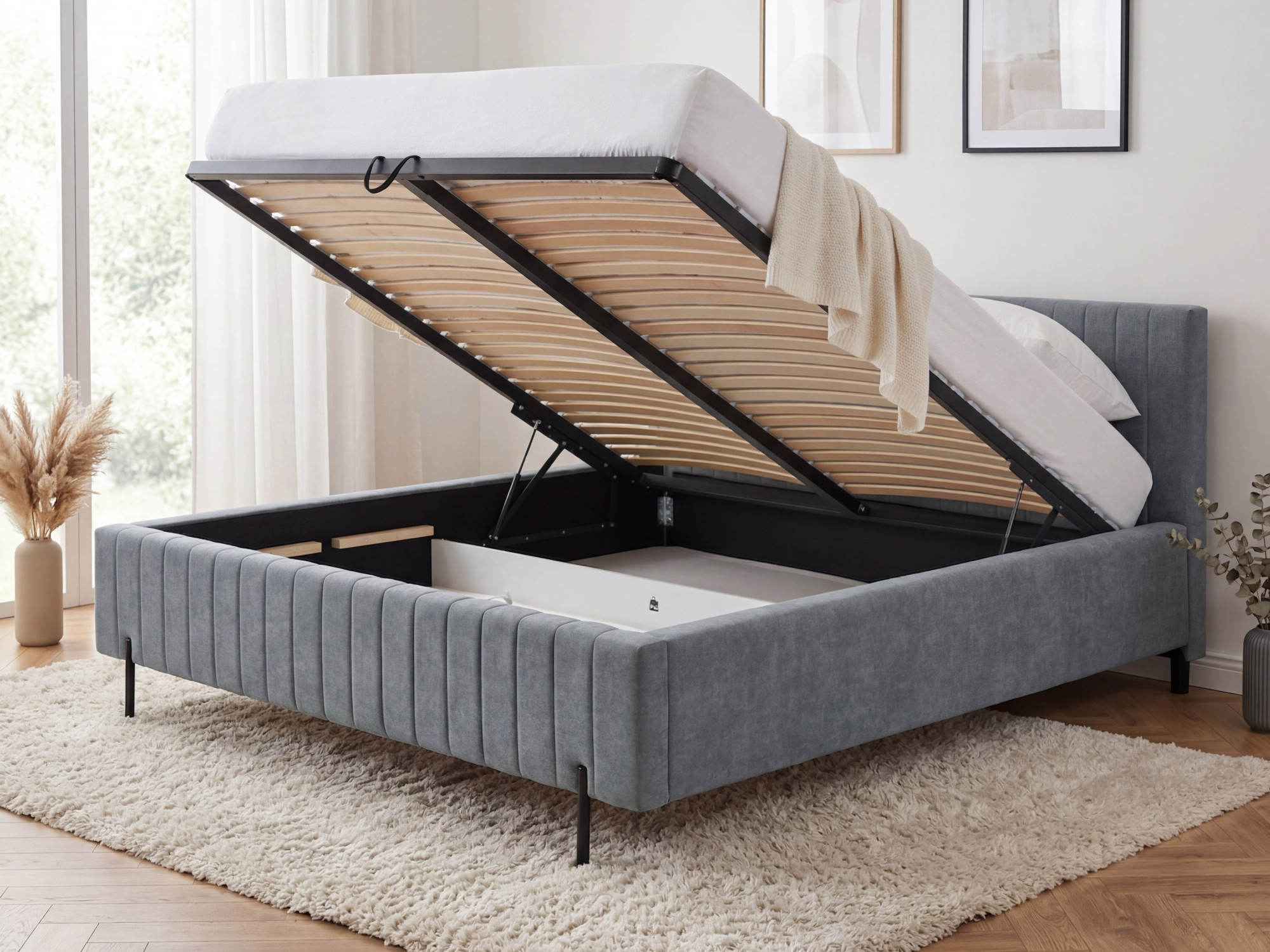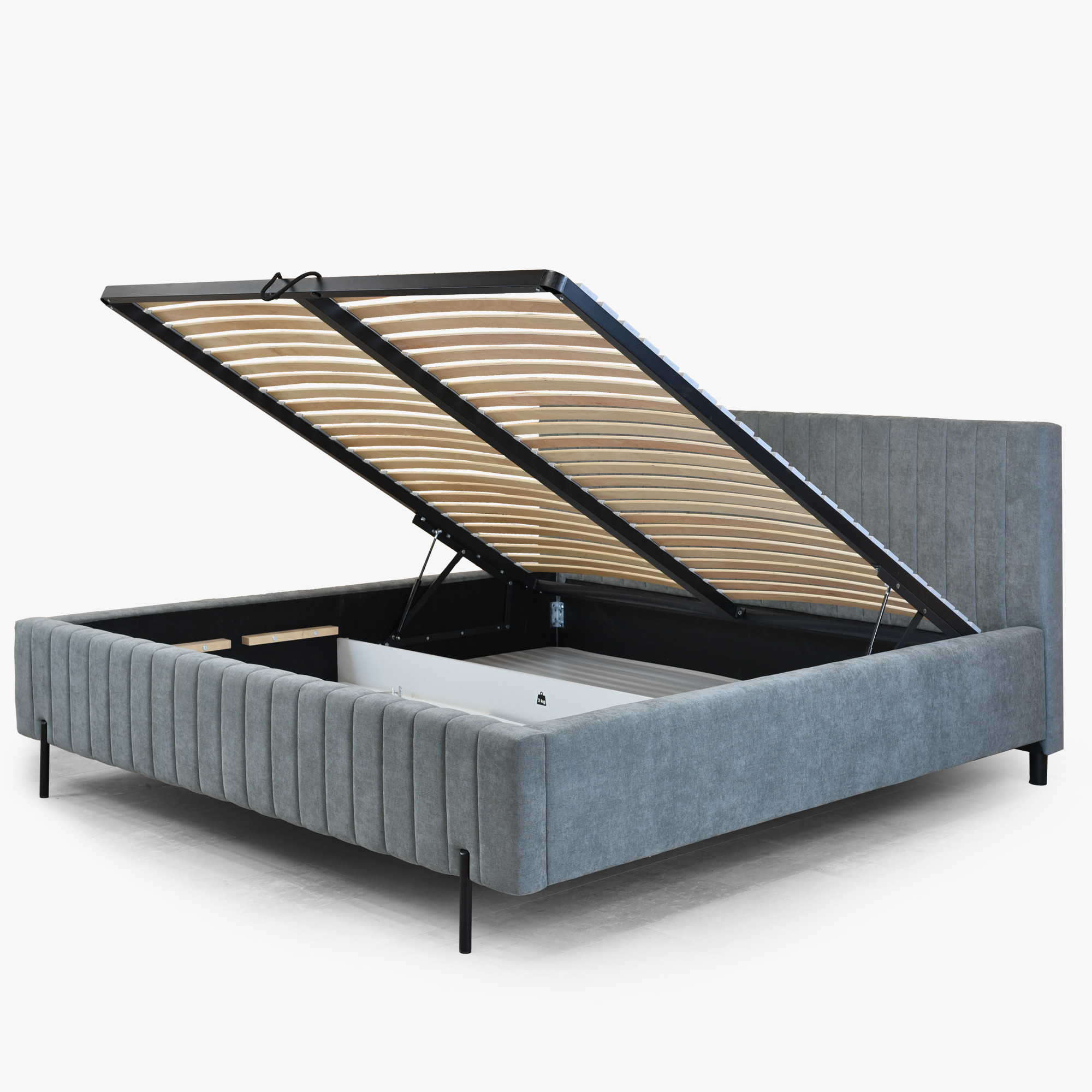 Wir präsentieren ein Polsterbett in der Größe 180 x 200 cm, das zum eleganten Blickfang in Ihrem Schlafzimmer wird. Das Bett ist mit feinem Velvet Wind 89 Stoff in zeitlosem Grau mit angenehmer samtiger Haptik bezogen. Charakteristische vertikale Steppungen rundum und am Kopfteil verleihen dem Bett ein modernes Design. Zum Lieferumfang gehören ein hochwertiger Lattenrost und ein großzügiger Stauraum mit Gasdruckfedern, in dem Sie Bettwäsche, Kissen oder saisonale Textilien komfortabel verstauen können. Die Matratze ist nicht enthalten und kann nach Ihren individuellen Wünschen ausgewählt werden.