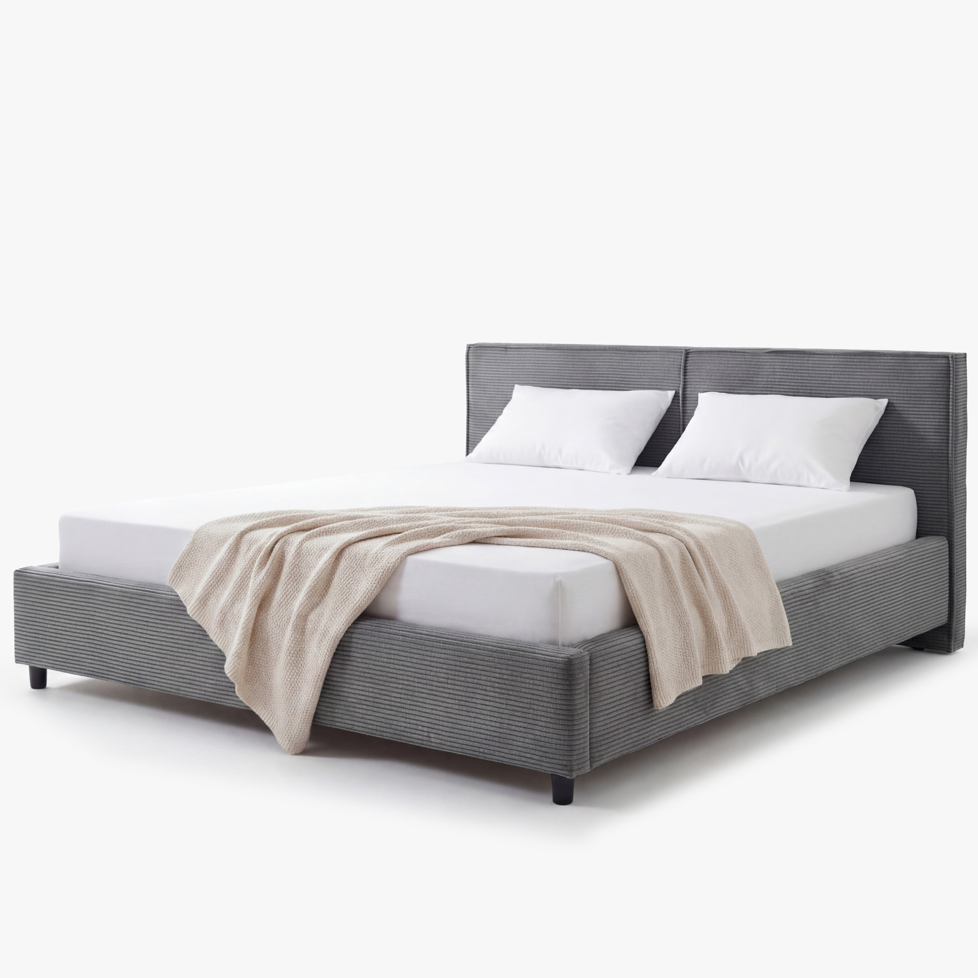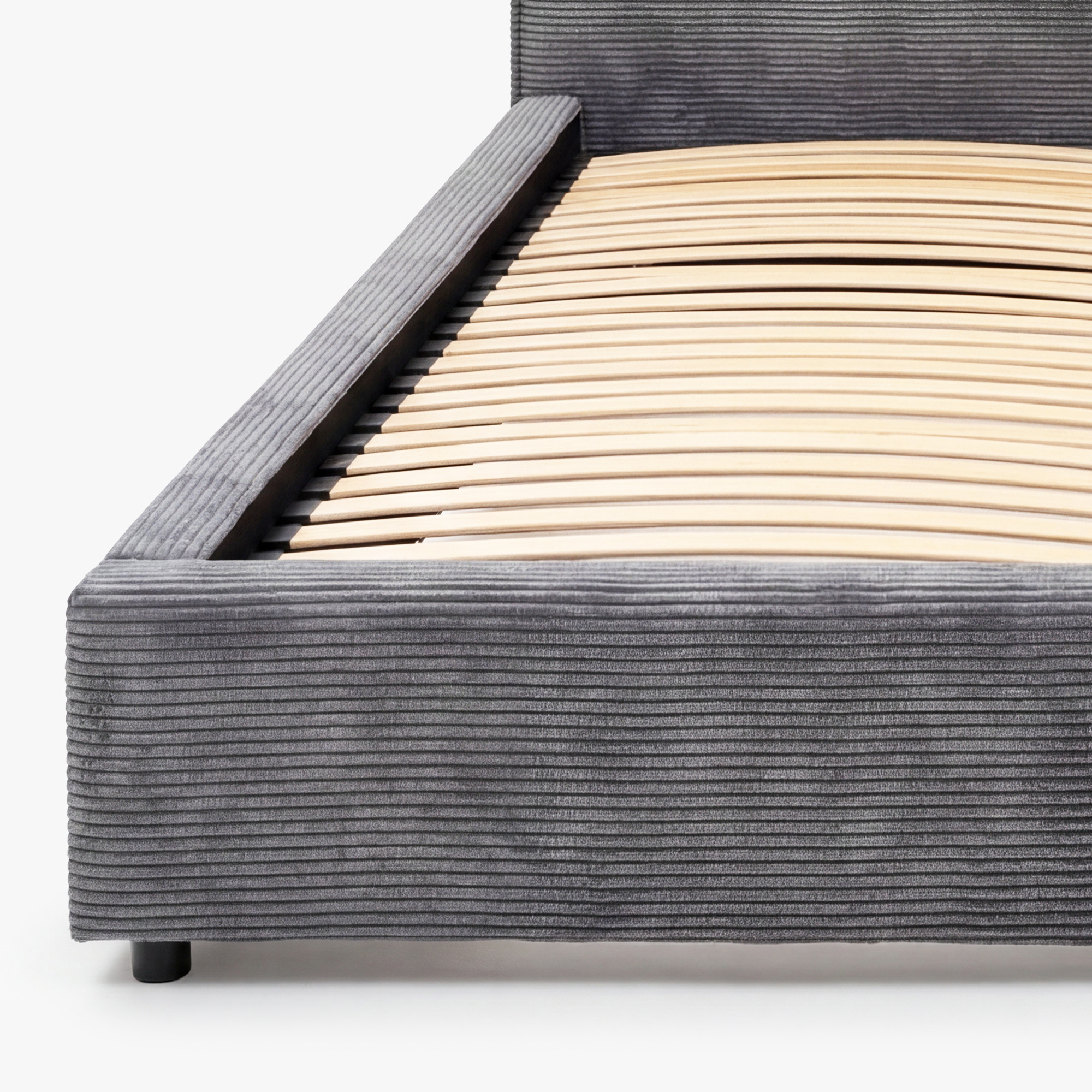 Das Betthaupt ist in zwei weich gepolsterte Segmente unterteilt, die beim Lesen oder Fernsehen für bequeme Unterstützung sorgen. Dank der niedrigen Holzfüße wirkt das Bett luftig und modern und ist gleichzeitig ausreichend stabil für die tägliche Belastung. Der Stoff Lincoln 90 zeichnet sich durch eine Scheuerbeständigkeit von über 90.000 Martindale-Zyklen und eine Zusammensetzung von 91 % Polyester und 9 % Nylon aus, sodass er sein Aussehen über viele Jahre beibehält. Im Lieferumfang ist das Lattenrost enthalten, das Bett wird zerlegt mit einer übersichtlichen Aufbauanleitung geliefert.