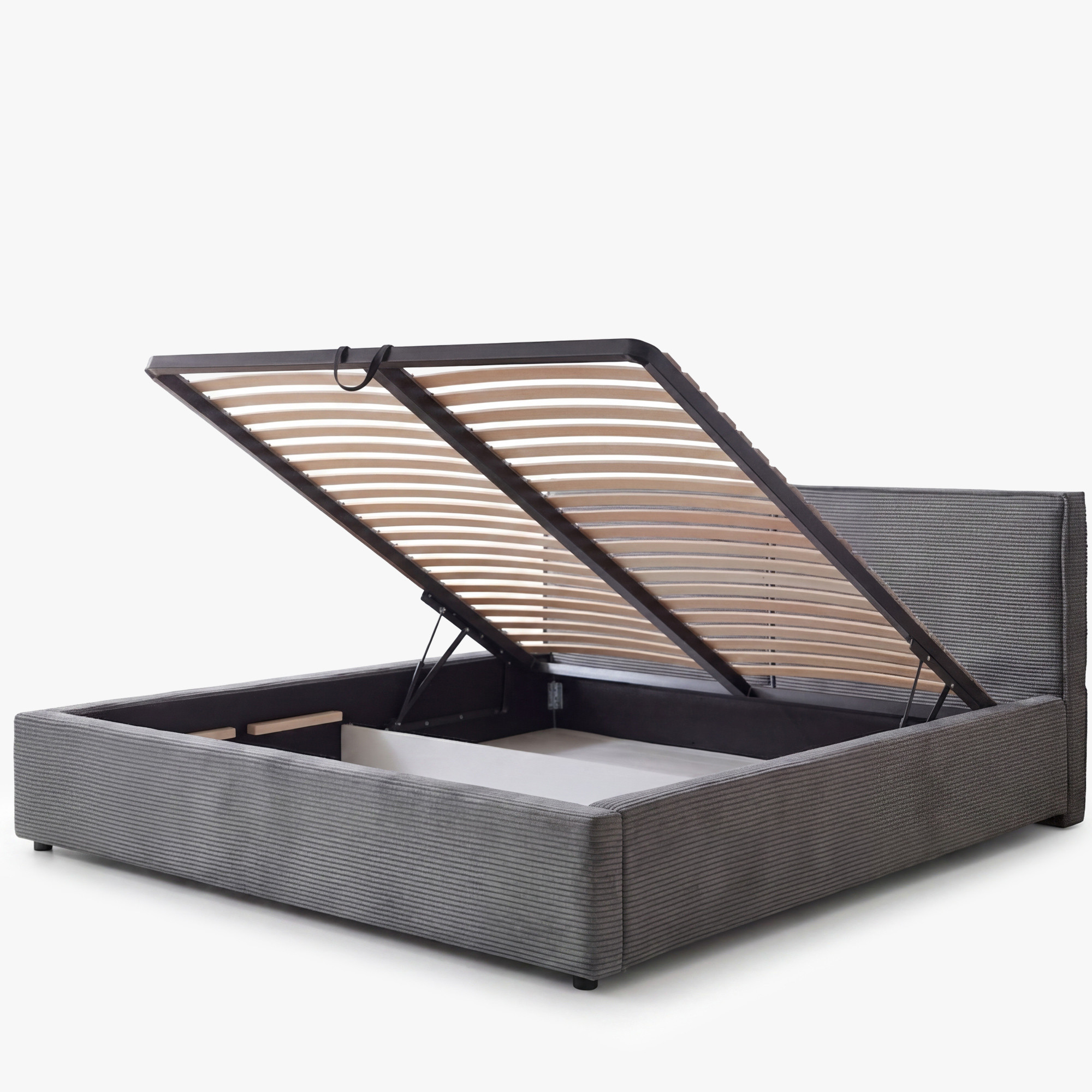 Im Lieferumfang ist ein Lattenrost enthalten. Die Matratze ist nicht enthalten und kann nach Ihren Präferenzen separat erworben werden. - Wie funktioniert der Stauraum?