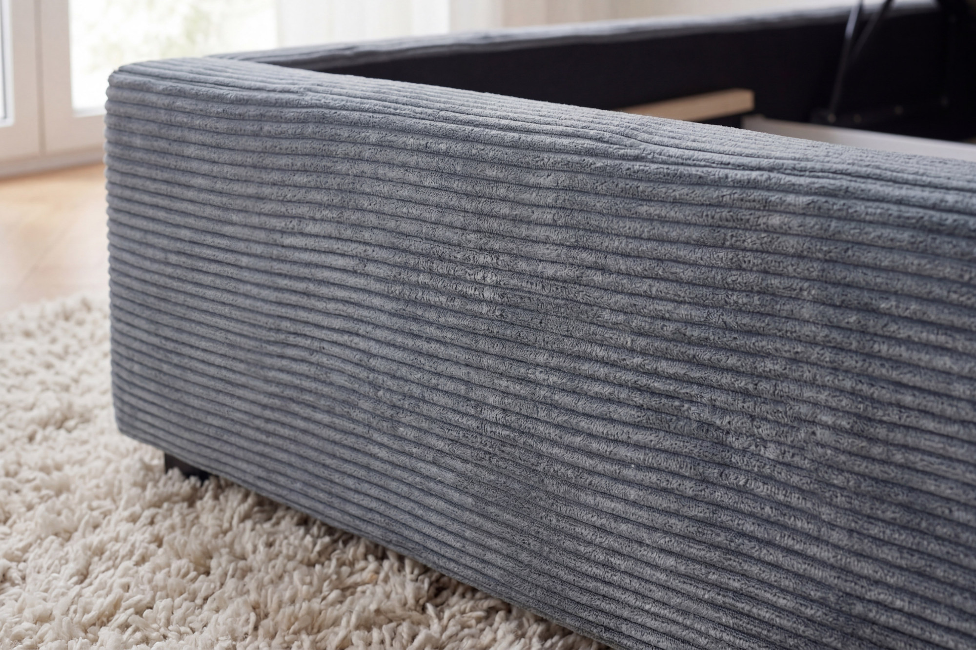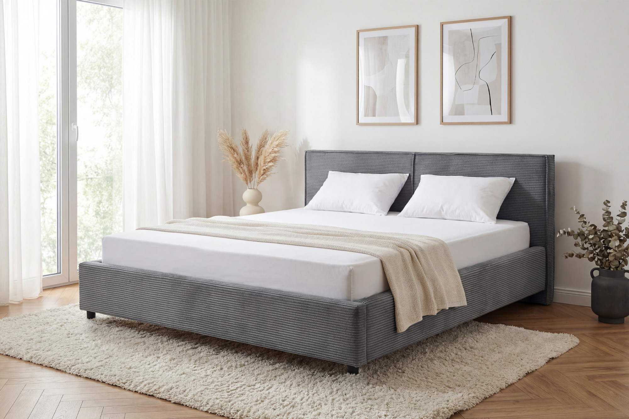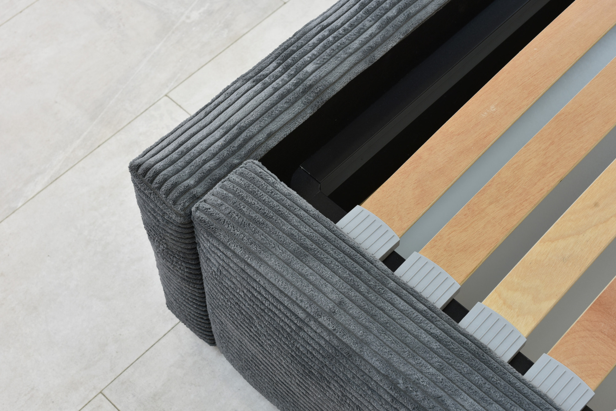 Wir präsentieren Ihnen das gestepptes Doppelbett Ineza in der Größe 160 x 200 cm, das modernes Design mit maximaler Funktionalität verbindet. Das Bett ist mit hochwertigem Stoff Lincoln 90 mit feinem Cordmuster in Grau bezogen, das elegant und zugleich gemütlich wirkt. Unter der gesamten Liegefläche verbirgt sich ein geräumiger Stauraum mit Klappmechanismus auf Gasfedern, mit dem Sie Bettwäsche, Kissen oder saisonale Textilien mühelos verstauen können. Die tragende Konstruktion ist aus massiver Kiefer gefertigt, was Stabilität und lange Lebensdauer des gesamten Bettes garantiert.