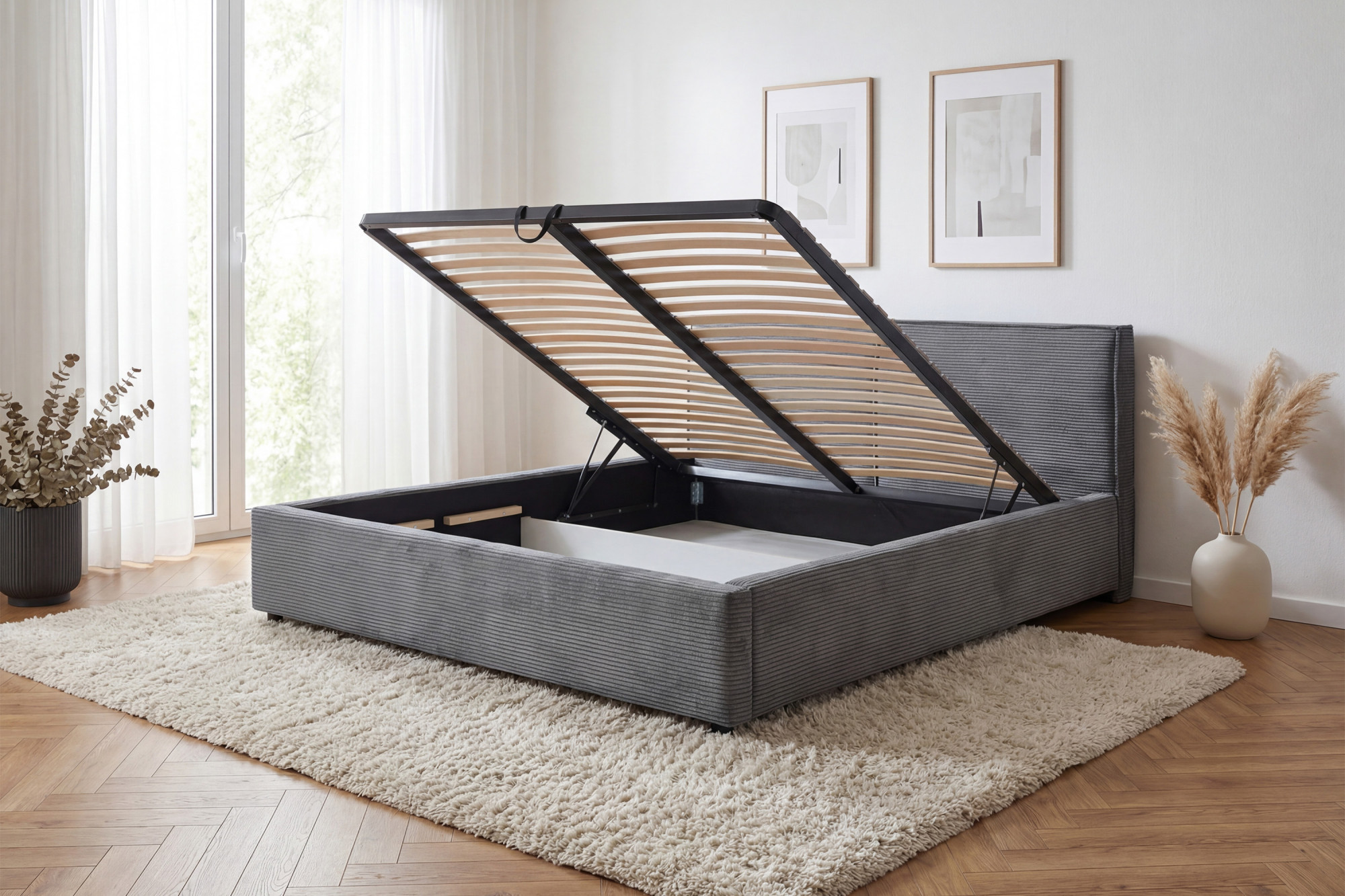 - Stauraum: klappbar auf Gasfedern unter der gesamten Liegefläche