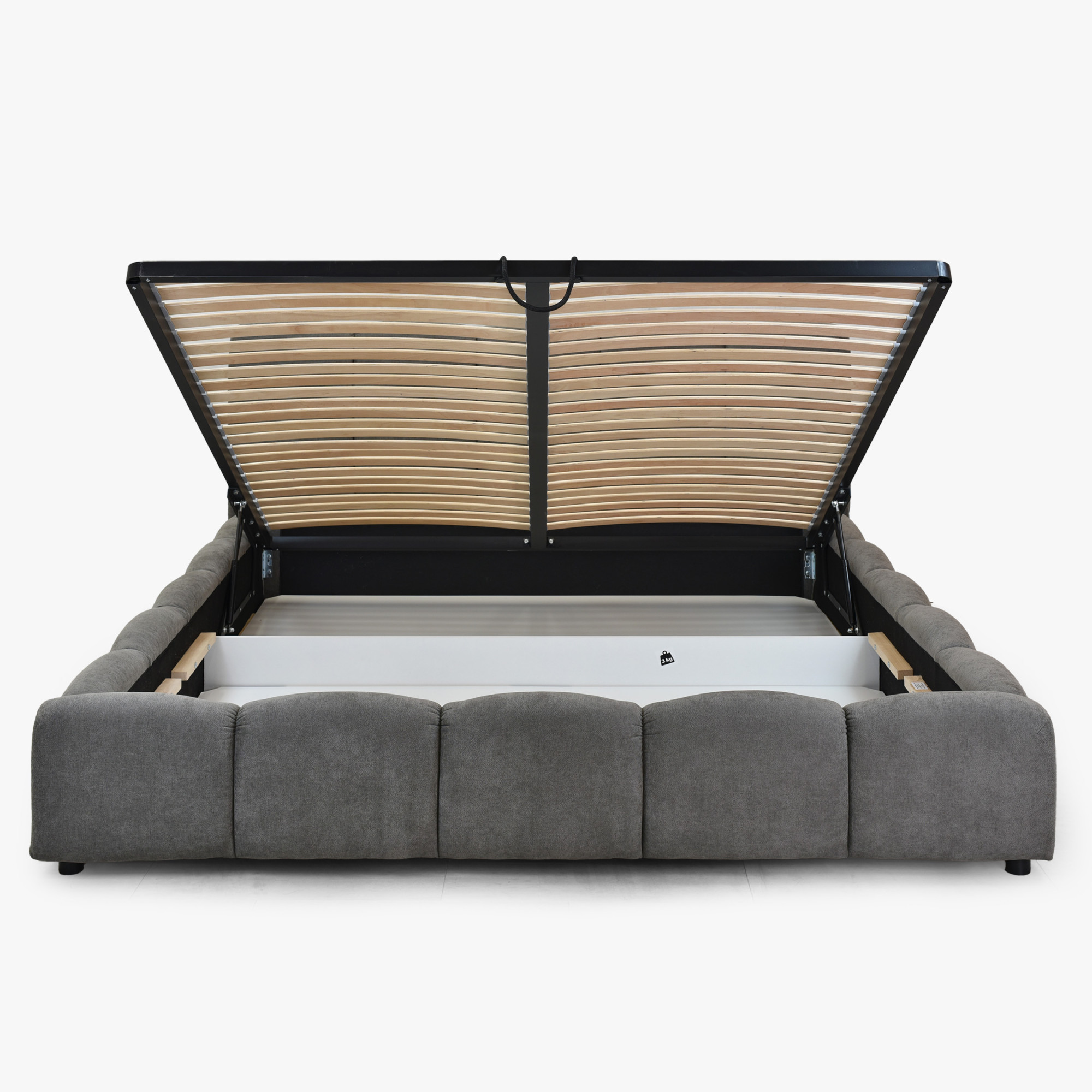 Die tragende Konstruktion besteht aus einem Holzrahmen in Kombination mit Spanplatte, die Stabilität und lange Lebensdauer des Bettes garantieren. Das Herzstück des Bettes ist ein verstellbarer Lattenrost mit Gasdruckfedern, der beim Anheben einen großen Stauraum mit weißer Box freigibt – der ideale Platz für Bettwäsche, Decken oder saisonale Kleidung. Der Mechanismus ist durchdacht und lässt sich mühelos auch mit einer Hand öffnen. Das Bett Nubi wird zerlegt geliefert mit einer übersichtlichen Aufbauanleitung, sodass Sie den Zusammenbau einfach und schnell schaffen. Durch die komfortable Höhe von 38 cm am Rahmengerüst steigt man bequem ein und aus, und die Gesamthöhe von 98 cm inklusive Kopfteil sorgt für angenehme Rückenstütze beim Lesen oder Fernsehen.