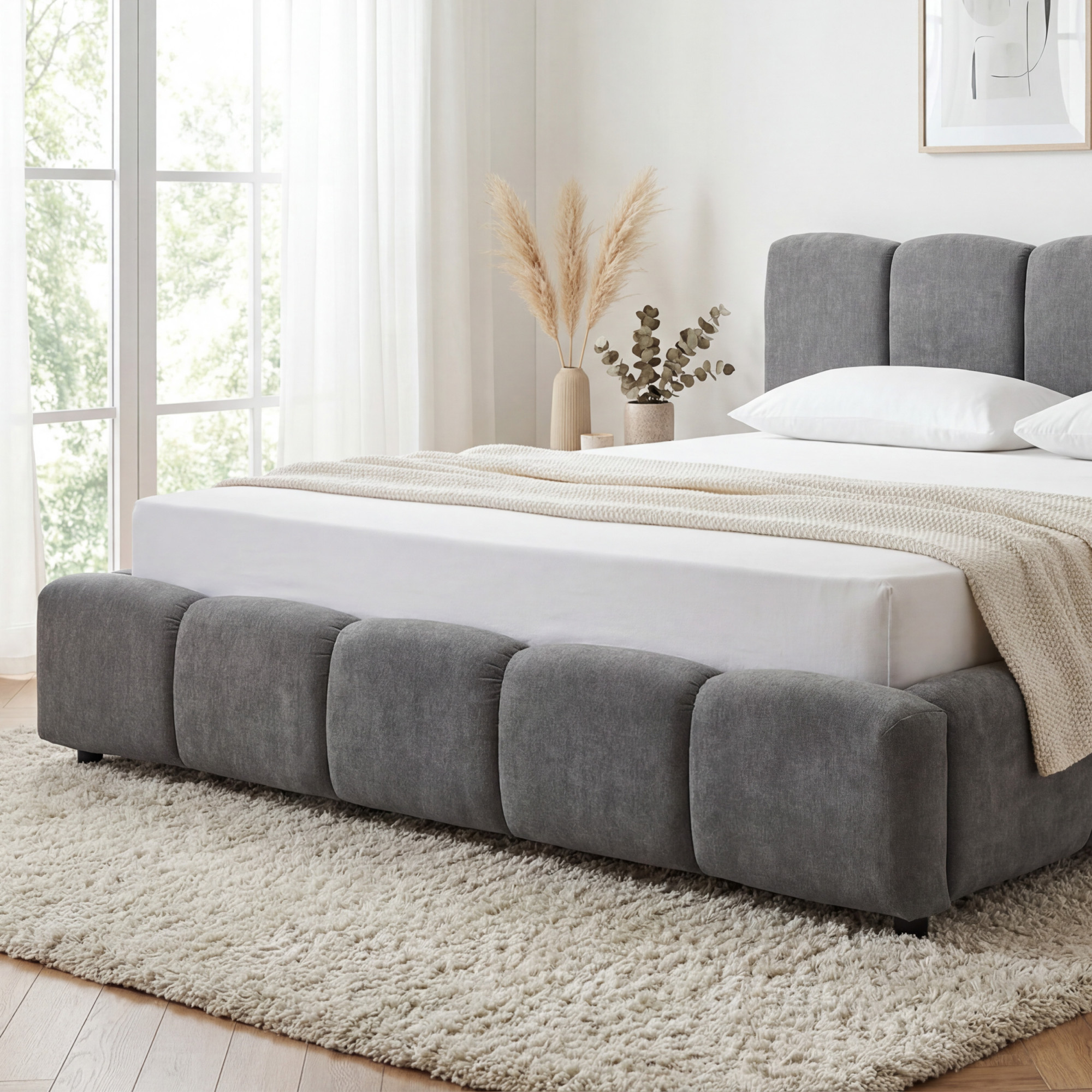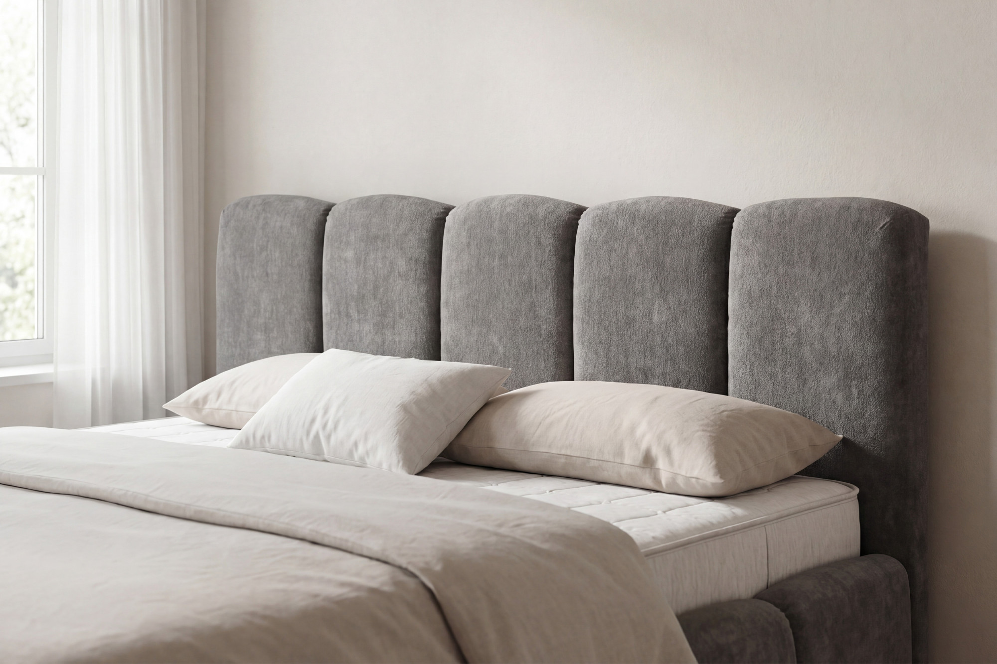 Suchen Sie ein Ehebett, das modernes Design, erstklassigen Komfort und maximale Praktikabilität vereint? Wir präsentieren Ihnen das polsterbed Nubi in der Größe 180 x 200 cm, dessen markantes Merkmal die effektvolle Blasen (Segment-) Polsterung an Kopf- und Seitenrahmen ist. Dieses Design verleiht dem Bett eine raffinierte und luxuriöse Ausstrahlung und sorgt gleichzeitig für eine gemütliche Atmosphäre im Schlafzimmer. Das Bett ist mit hochwertigem Polsterstoff Casa 9 in der Farbe Falcon bezogen, einem eleganten dunkelgrauen Farbton, der sich mit praktisch jedem Einrichtungsstil problemlos kombinieren lässt. Der Stoff fühlt sich angenehm weich an und erinnert optisch an edlen Chenille.