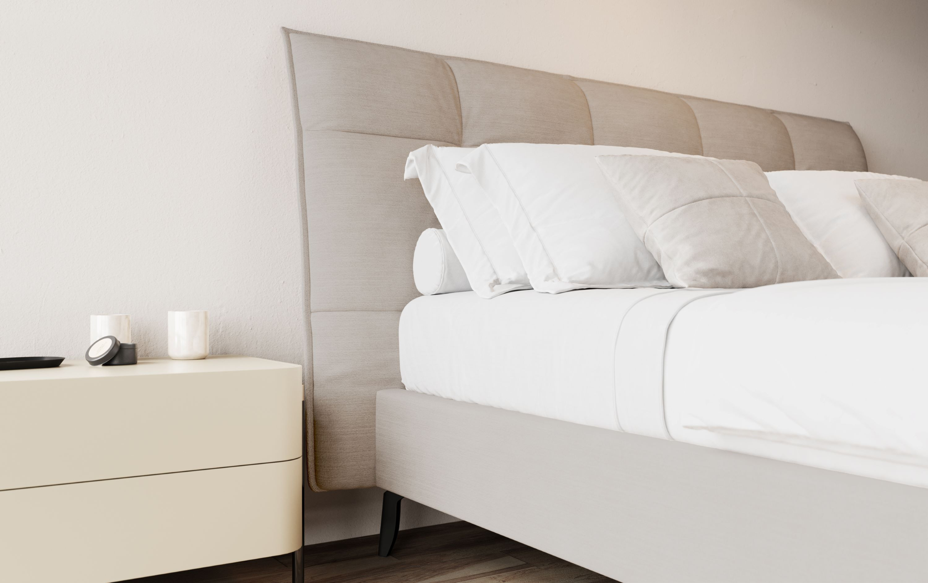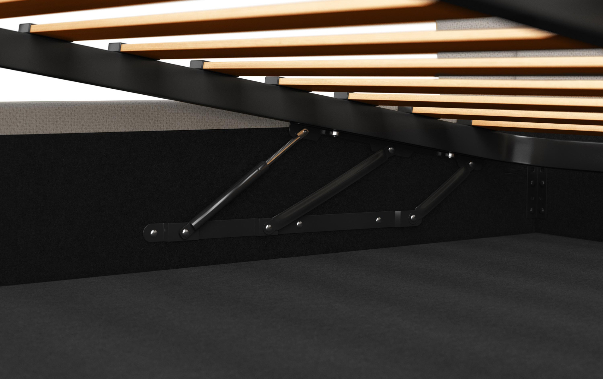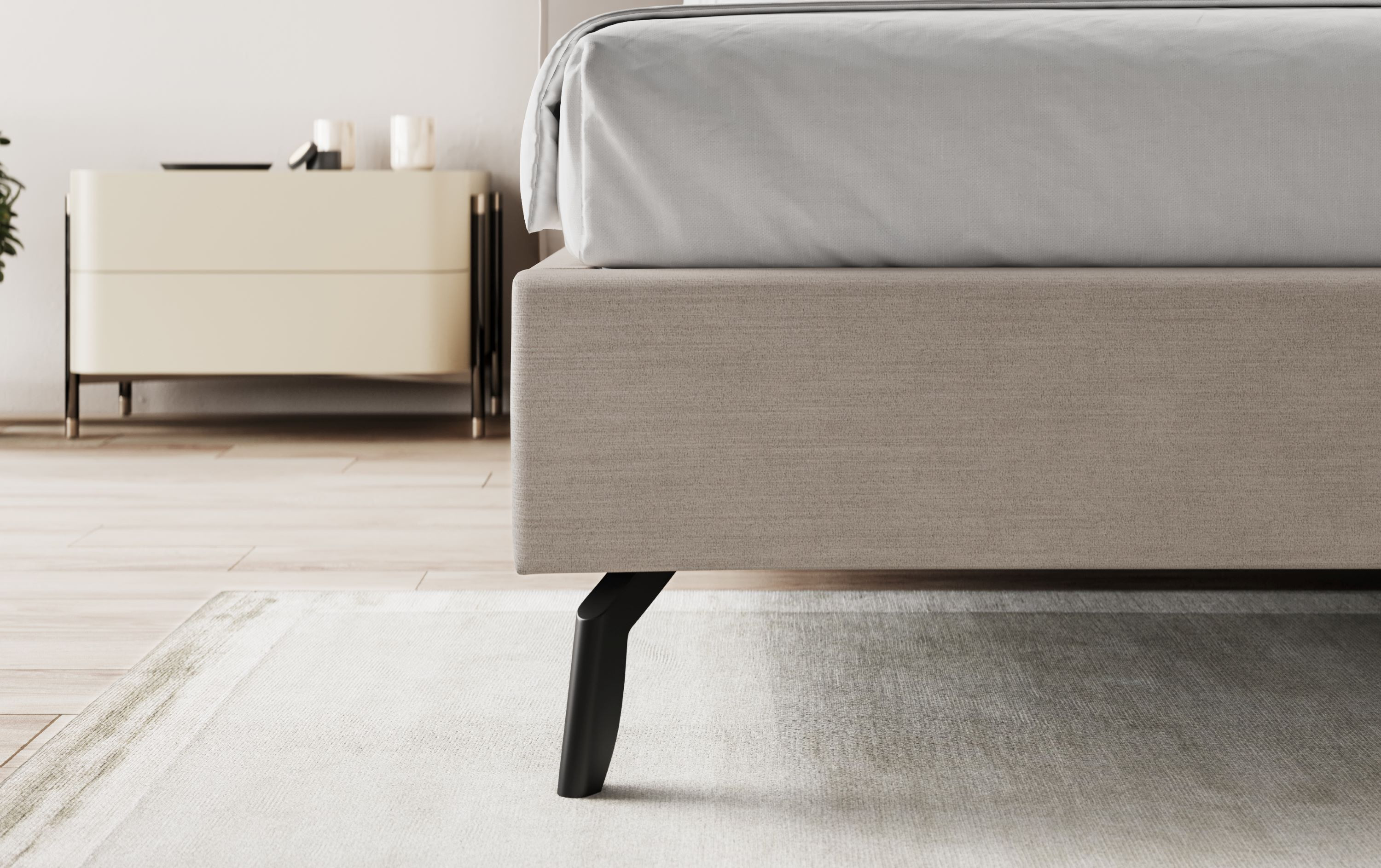 - Bettgestell: Gestell mit tragenden Teilen aus massivem Holz, belüfteter Bettrahmen 10 mm, Sperrholz mit technischem Stoff bezogen
