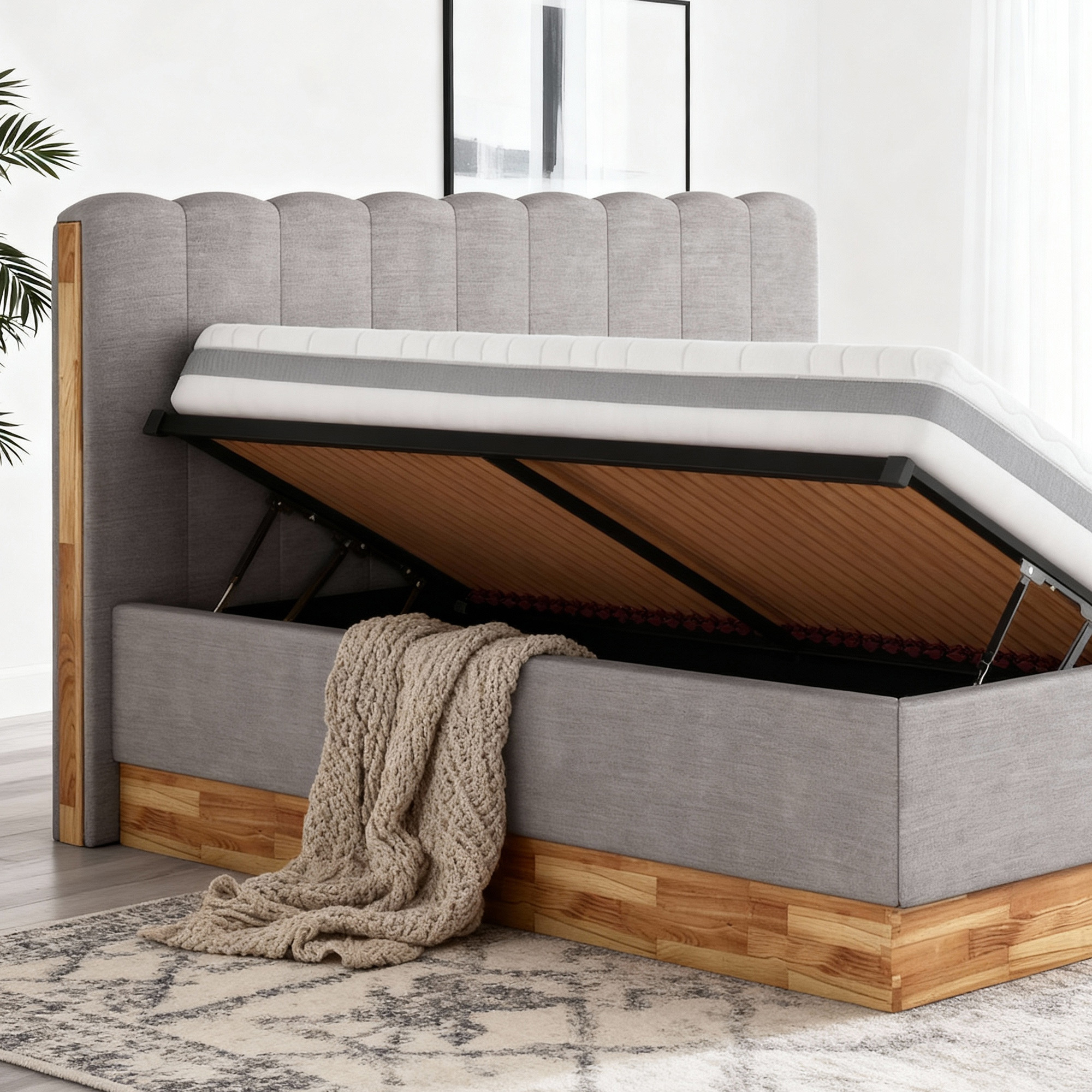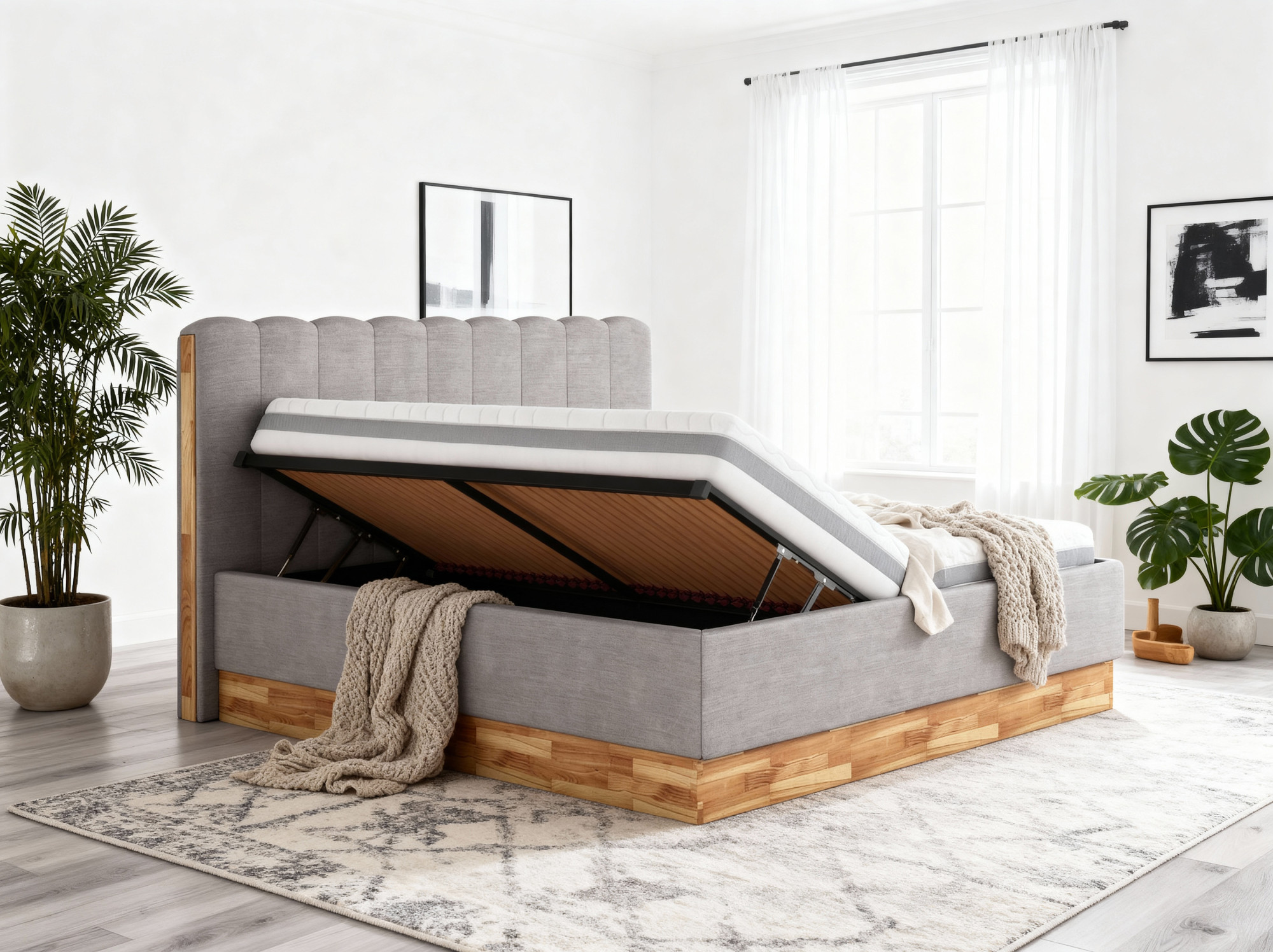 Ein großer Vorteil dieses Modells ist der geräumige Stauraum unter dem Lattenrost. Hier lassen sich Bettwäsche, Decken, Kissen oder saisonale Textilien ordentlich und platzsparend verstauen. So gewinnen Sie zusätzlichen Stauraum im Schlafzimmer, ohne auf ein harmonisches Erscheinungsbild verzichten zu müssen. Durch den belüfteten Rahmen wird zudem ein gesundes und hygienisches Schlafumfeld unterstützt, was den täglichen Komfort zusätzlich erhöht.
