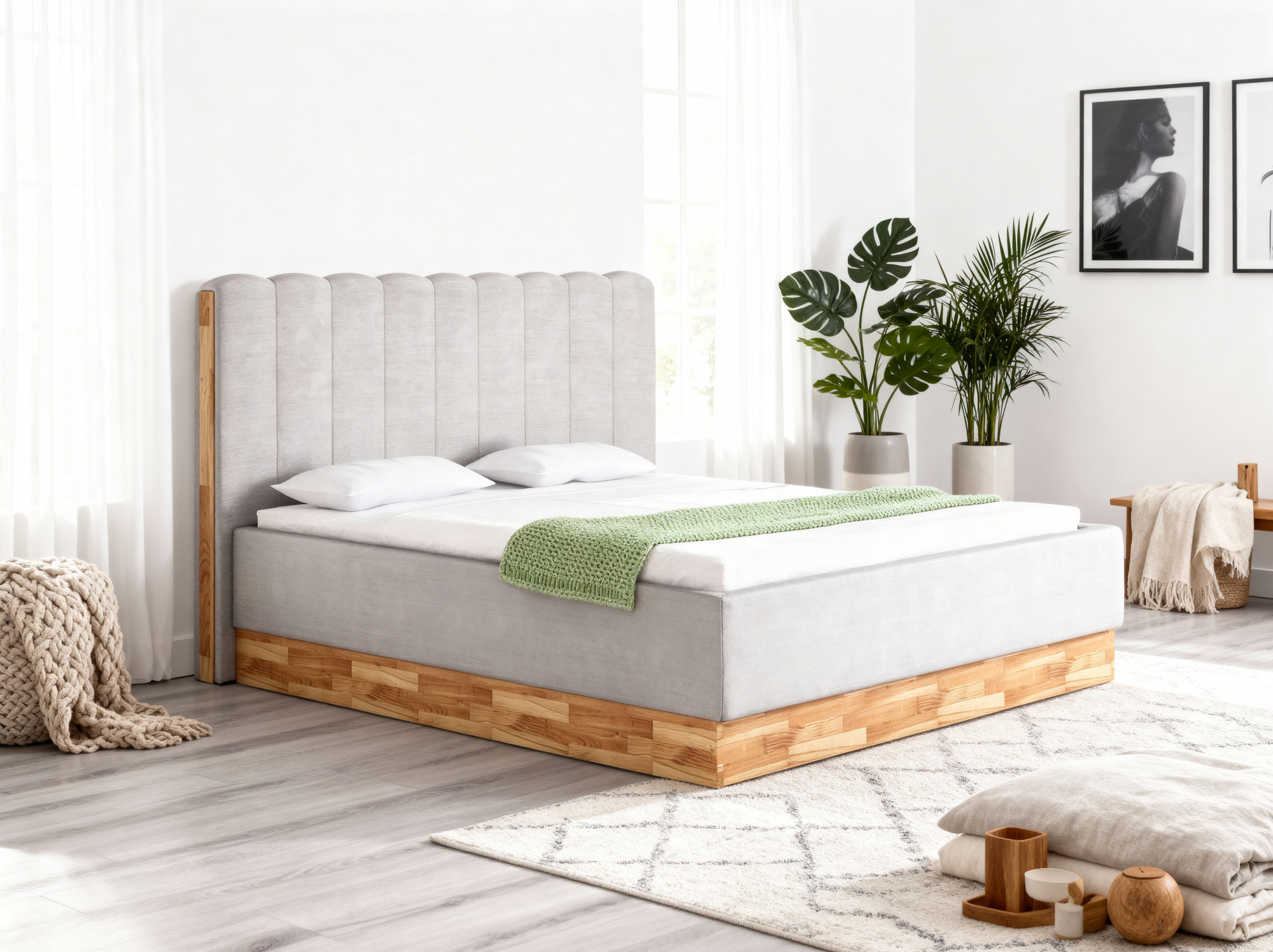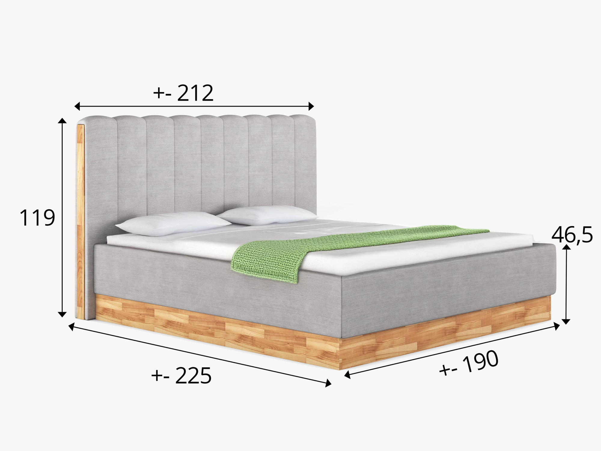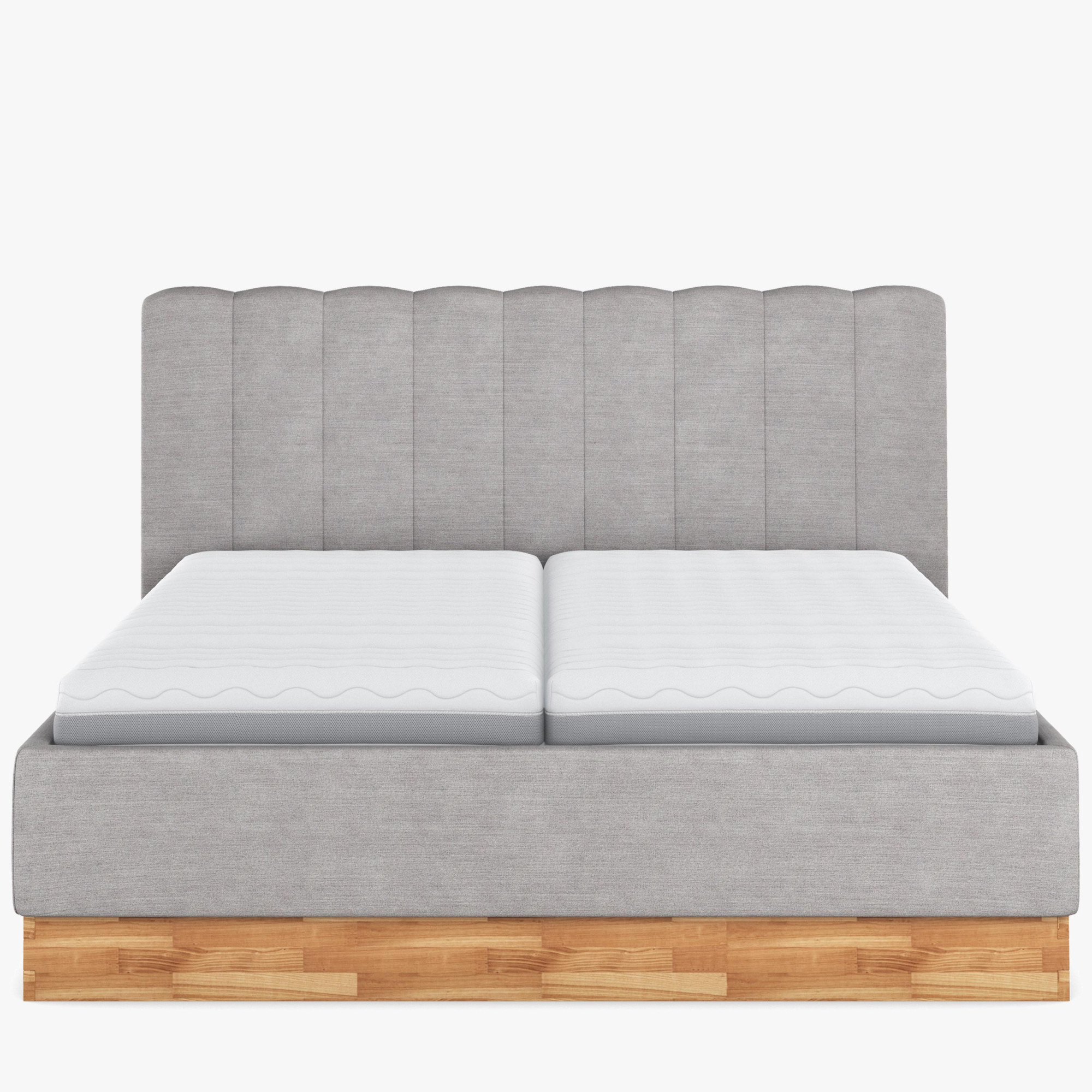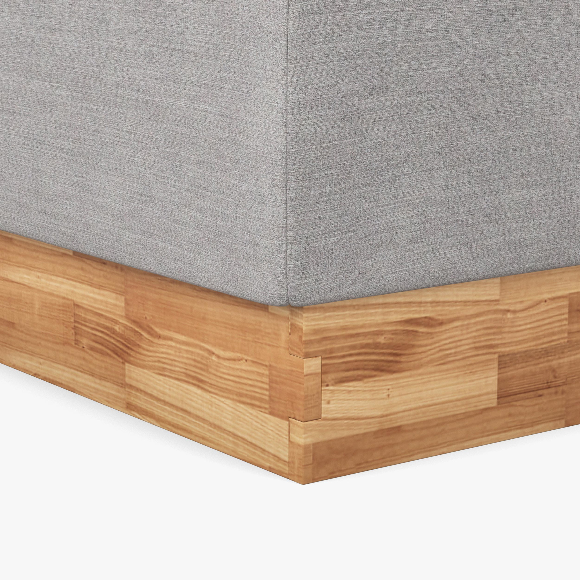 - Bettgestell: Tragende Teile aus Massivholz, Seiten mit hochwertigem Polsterstoff bezogen