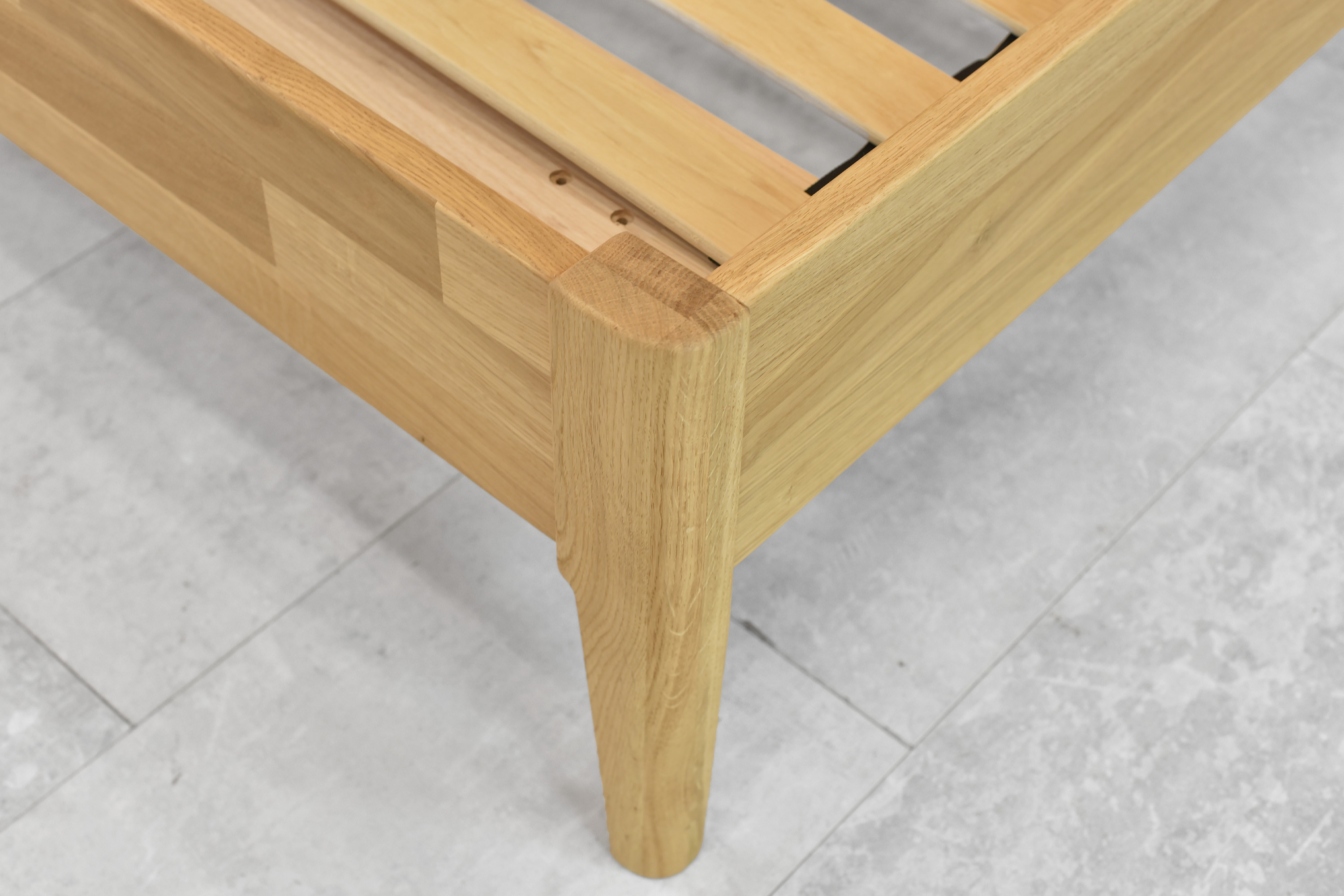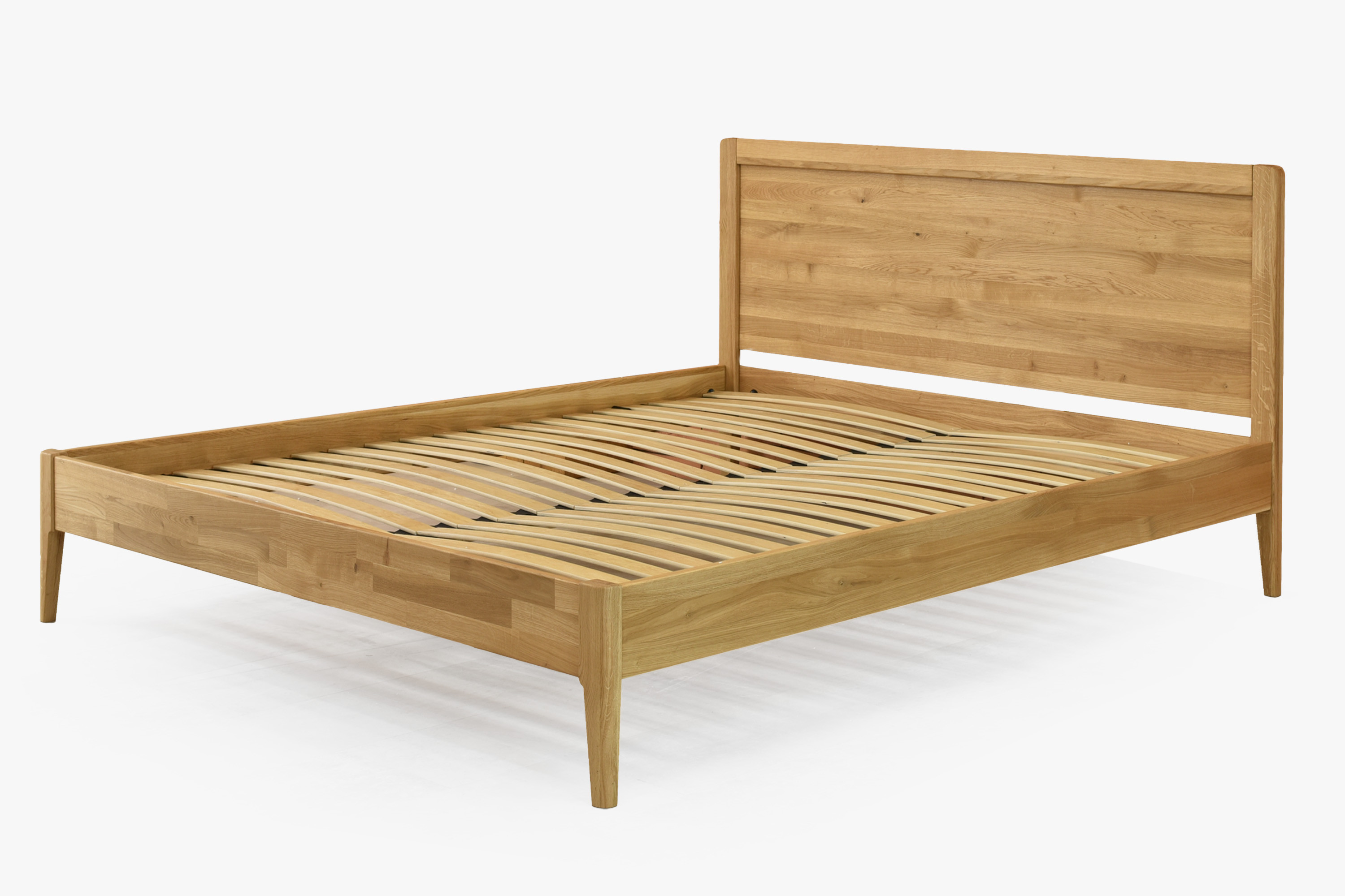 Das hölzerne Eichenbett Prag ist ein elegantes Doppelbett, gefertigt aus hochwertigem Eichenmassivholz. Dank seines stabilen Kopfteils und der schlanken Maße eignet es sich auch für kleinere Schlafzimmer, wobei es maximale Stabilität und Langlebigkeit bewahrt. Die Matratze ist etwa 5 cm versenkt, was für ein bequemes und sicheres Schlafen sorgt. Bei Verwendung einer Standardmatratze mit 20 cm Höhe erreichen Sie eine optimale Liegehöhe von ca. 50 cm, die ideal für den täglichen Komfort ist. Das Bett ist detailverliebt gestaltet – abgerundete Beine und die natürliche Maserung des Eichenholzes verleihen dem Möbelstück einen zeitlosen Charakter.