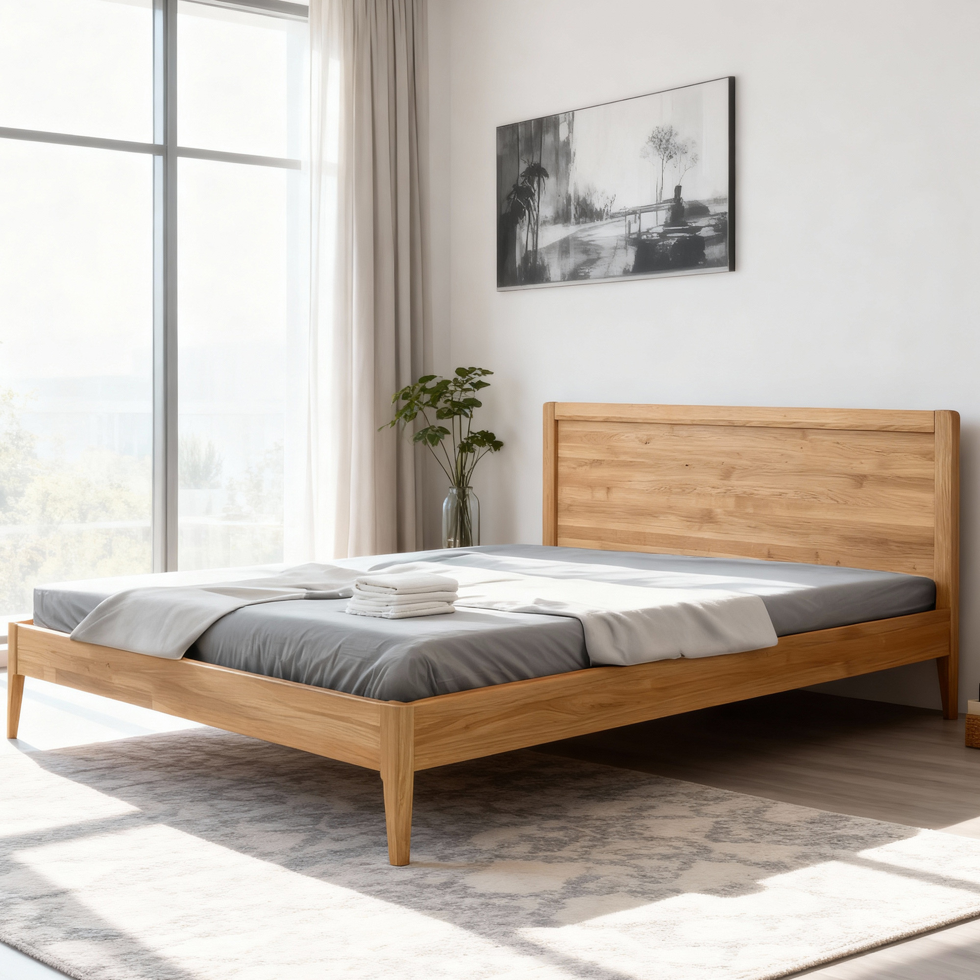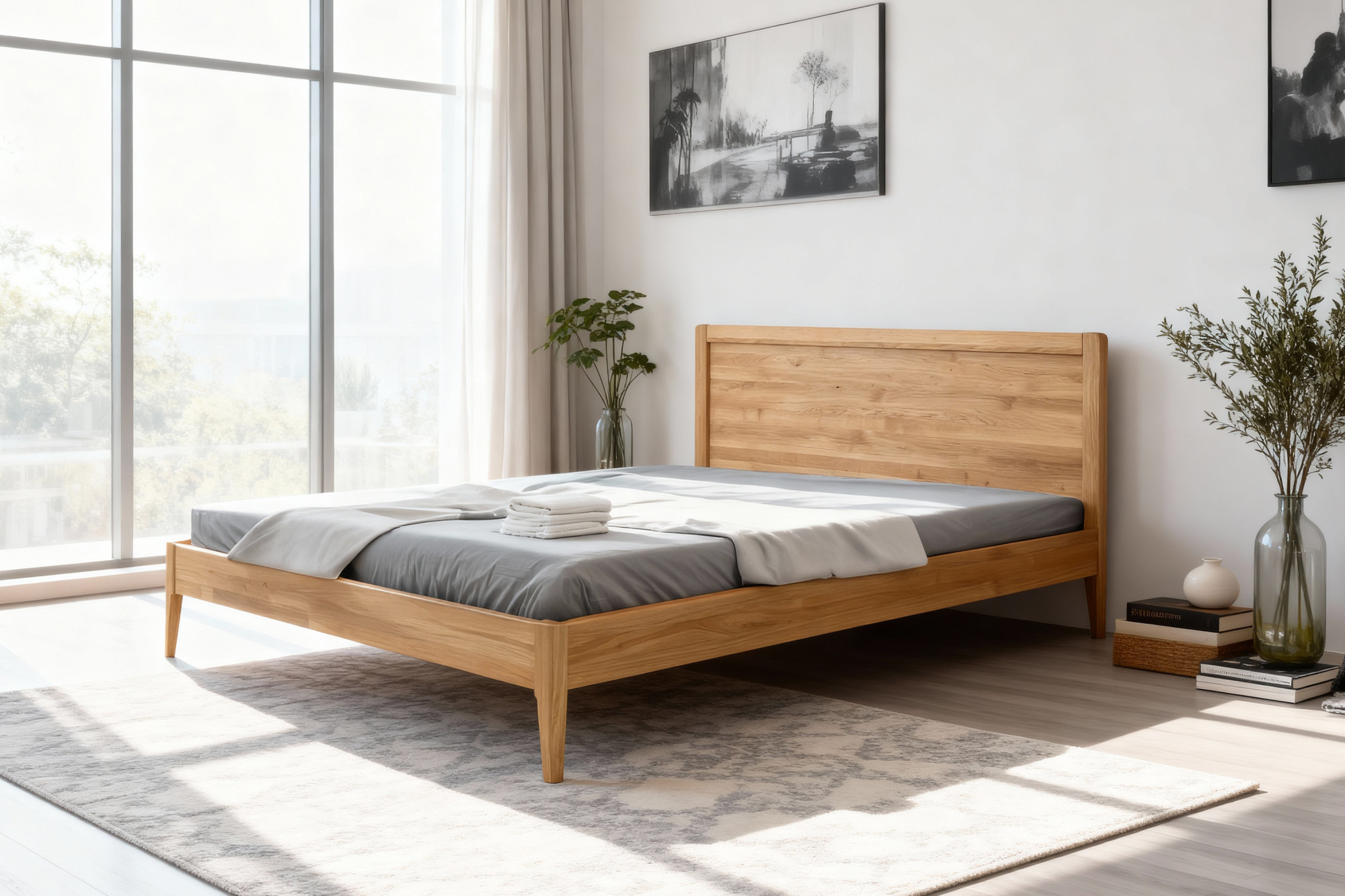 Das hölzerne Eichenbett Prag ist ein elegantes Doppelbett aus hochwertigem Eichenmassivholz. Dank seines stabilen Kopfteils und den dezenten Maßen eignet es sich auch für kleinere Schlafzimmer und behält dabei maximale Stabilität und lange Lebensdauer. Die Matratze ist etwa 5 cm versenkt, was für komfortables und sicheres Schlafen sorgt. Bei Verwendung einer Standardmatratze mit einer Höhe von 20 cm erreichen Sie eine optimale Liegehöhe von ca. 50 cm, die ideal für den täglichen Komfort ist. Das Bett ist mit Liebe zum Detail gestaltet – abgerundete Beine und die natürliche Maserung des Eichenholzes verleihen dem Möbelstück einen zeitlosen Charakter.