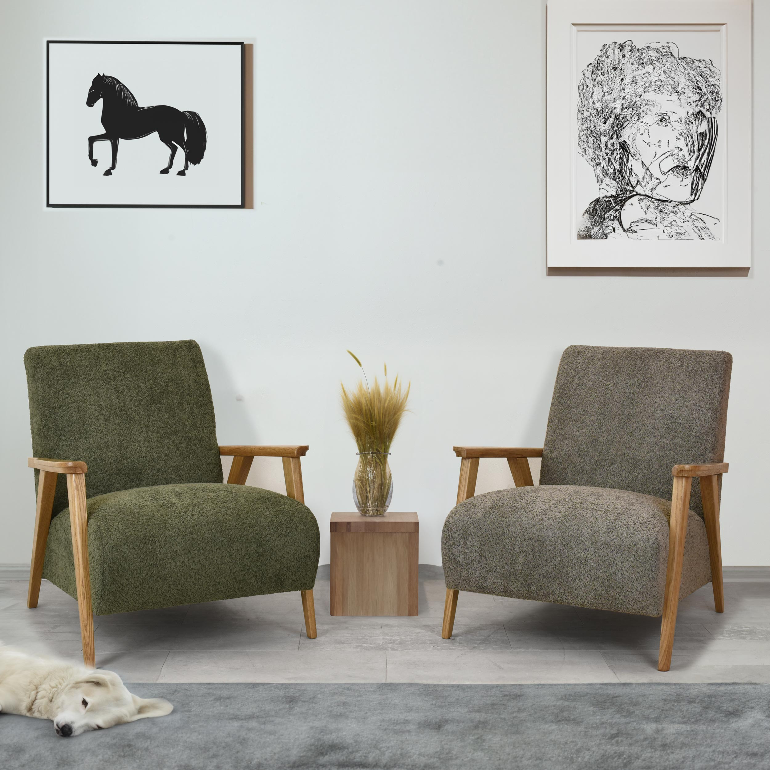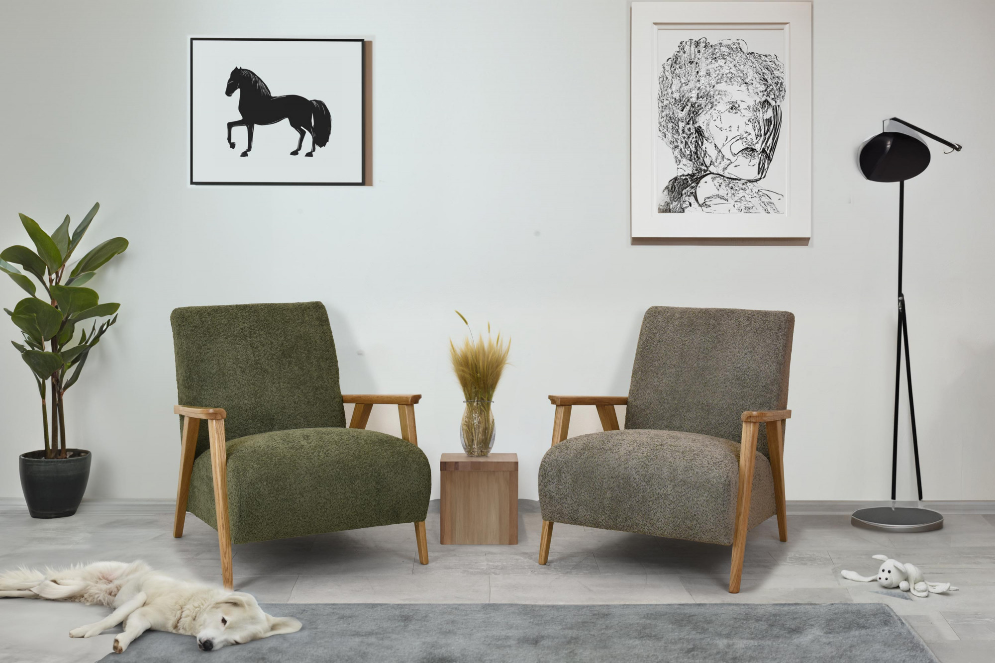 Entdecken Sie Komfort und Eleganz mit dem Sessel mit Holzgriffen in grüner Farbe, der die perfekte Ergänzung für jedes Wohnzimmer ist. Dieser Sessel verbindet Retro-Stil mit modernem Komfort und bringt nicht nur ästhetische, sondern auch praktische Vorteile in Ihr Zuhause. Dank der Verwendung von hochwertigem Eichenholz für die Griffe und Beine, behandelt mit mattem Lack in der Farbe Eiche Natur, ist dieses Möbelstück nicht nur robust, sondern auch leicht mit weiteren Eichenmöbeln aus unserem Sortiment kombinierbar.