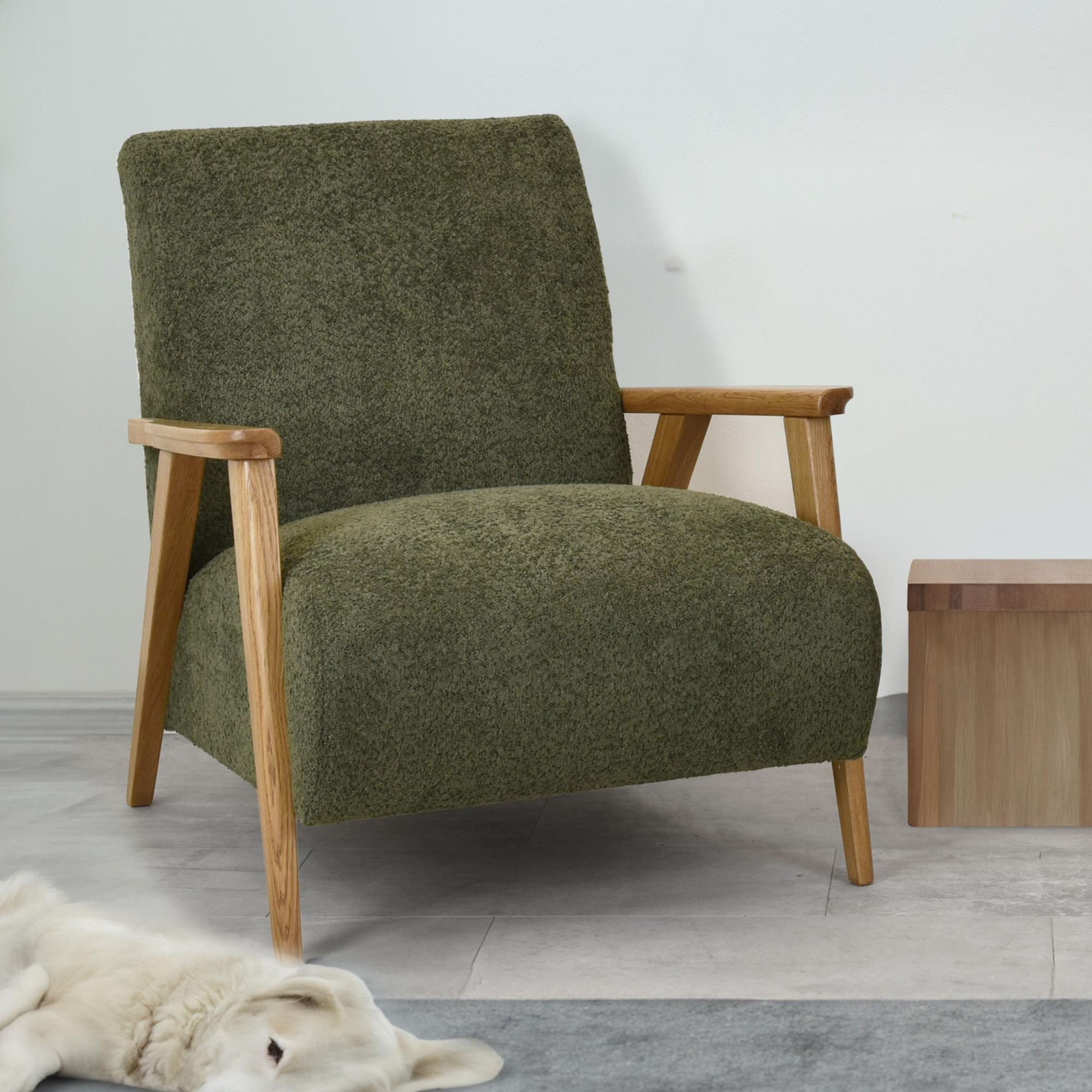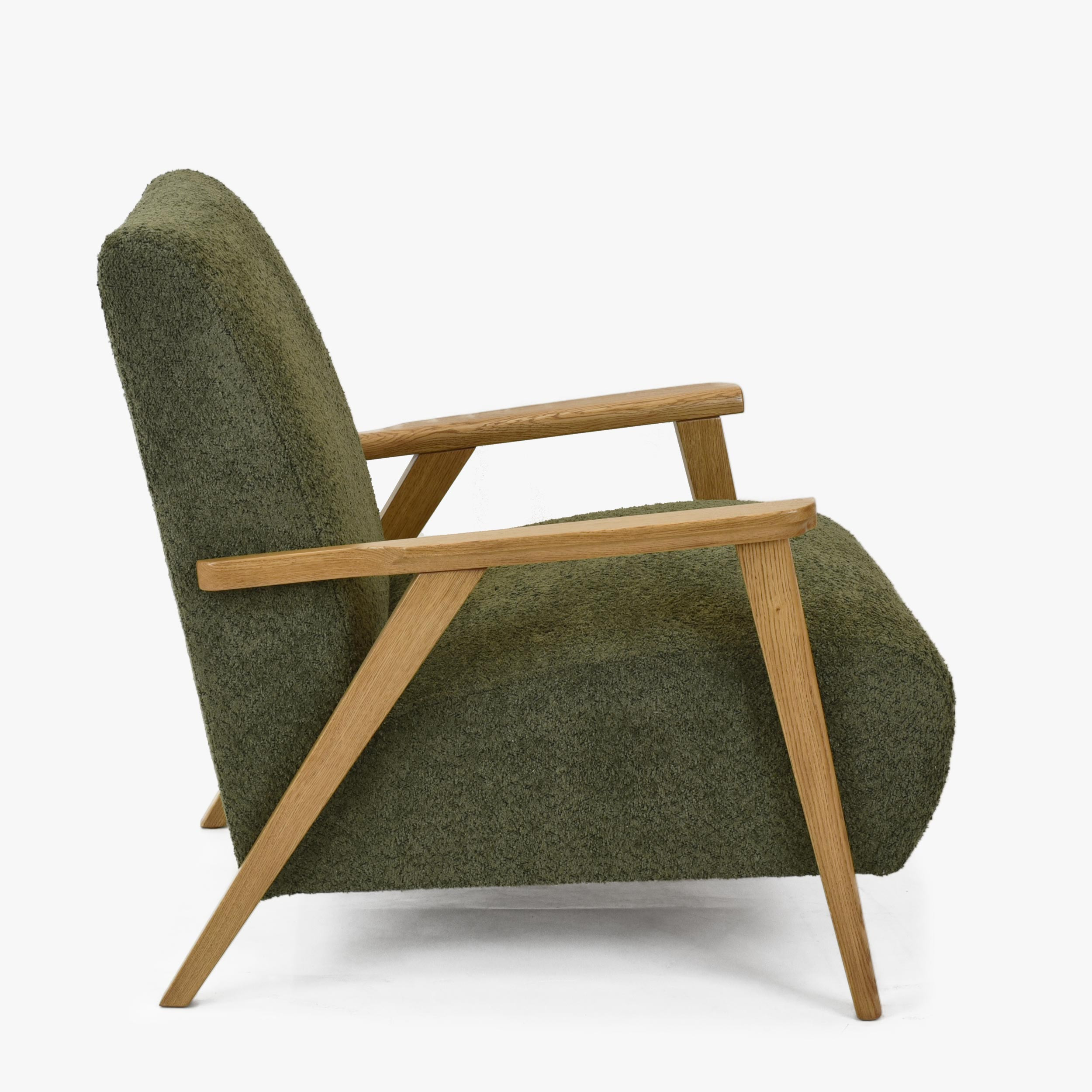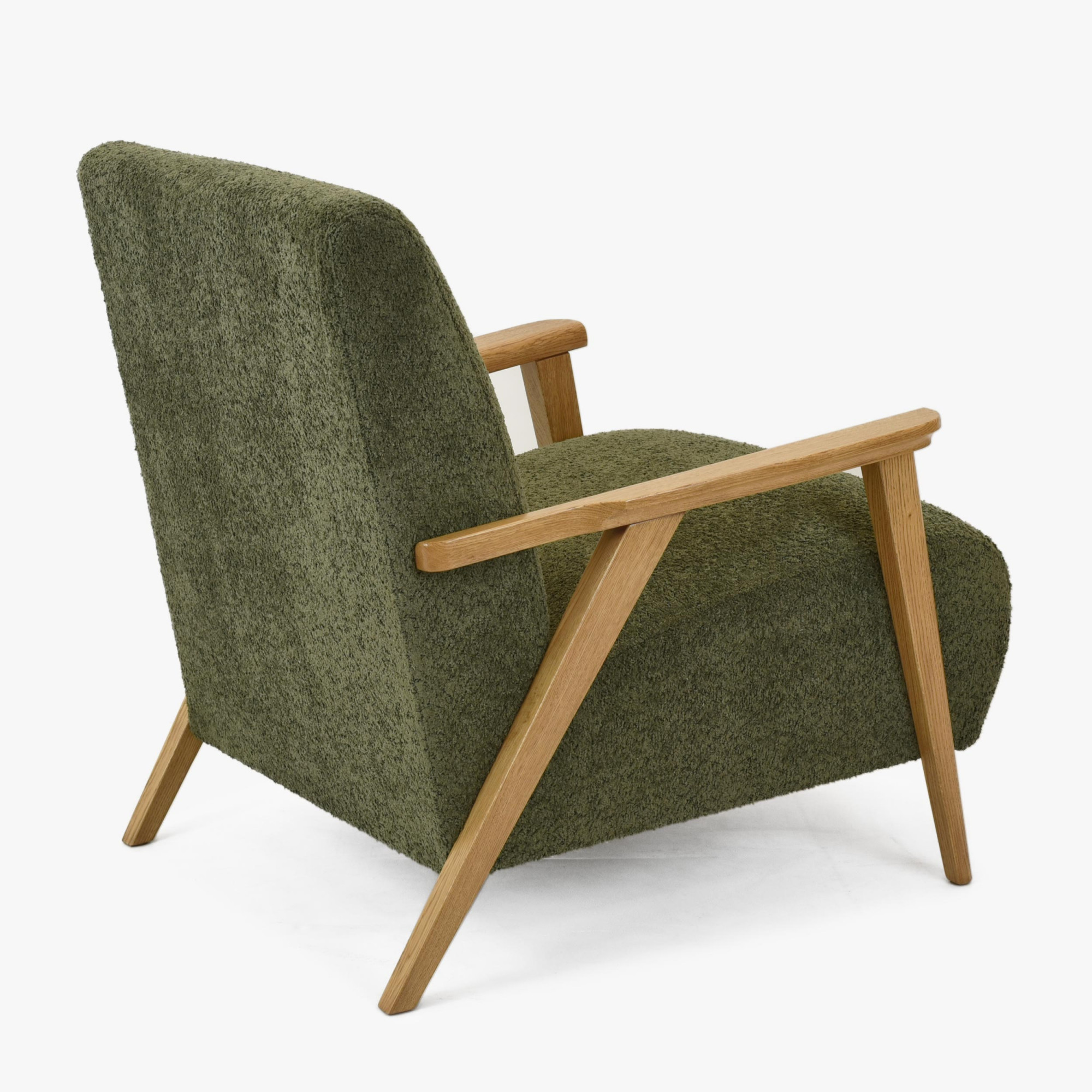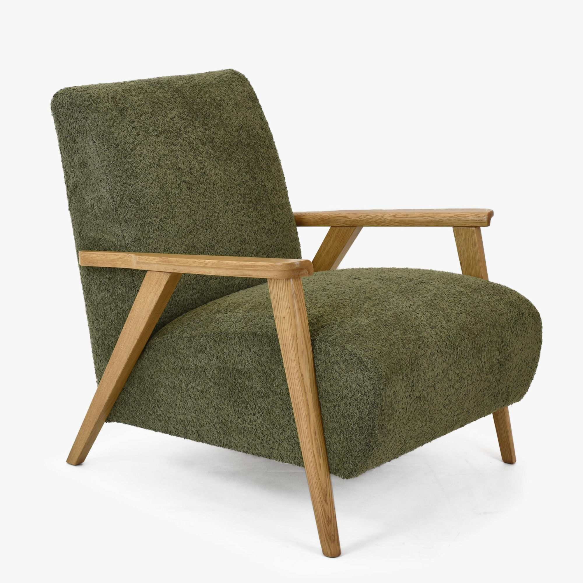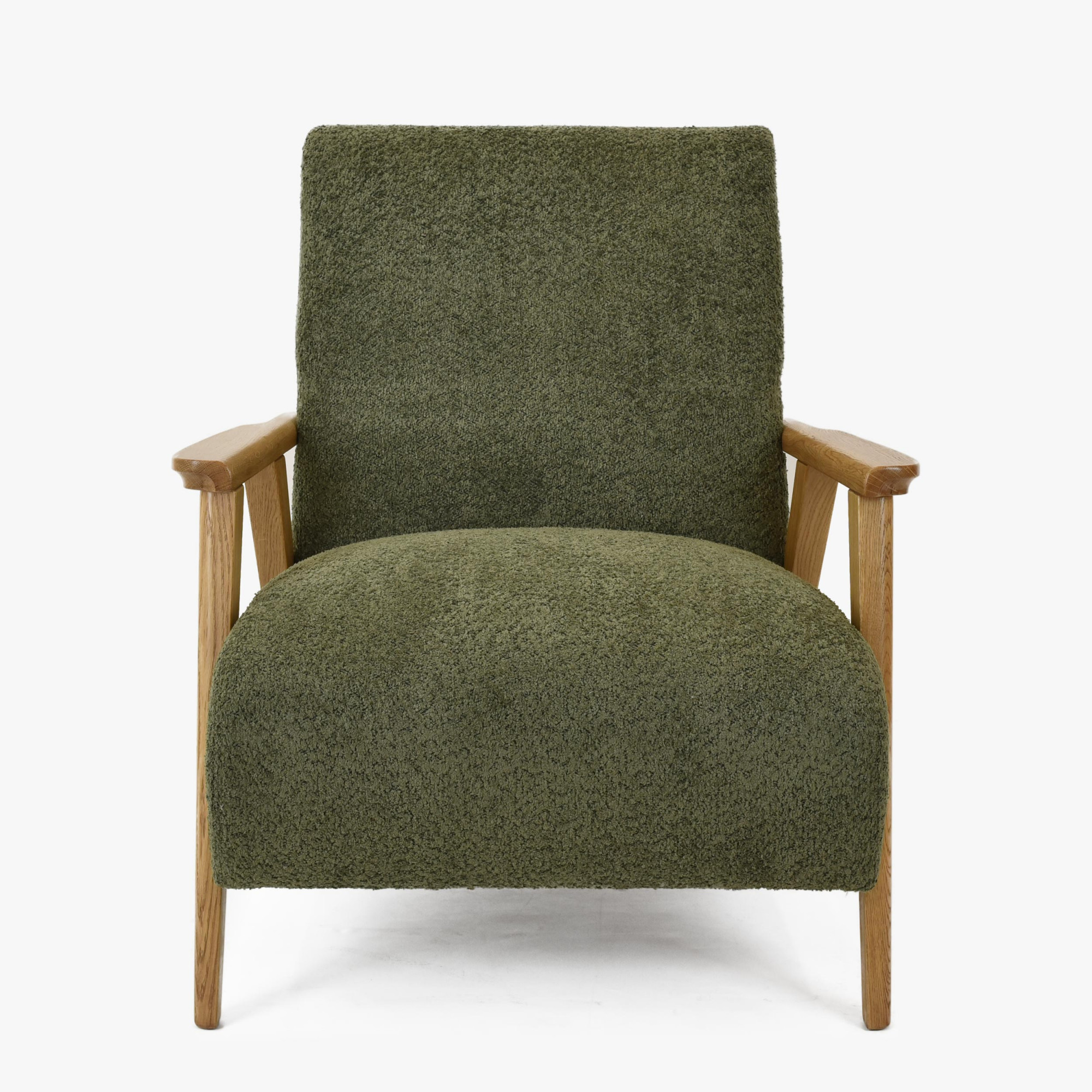 Retro Sessel grün mit Eichenholz Armlehnen und Beinen