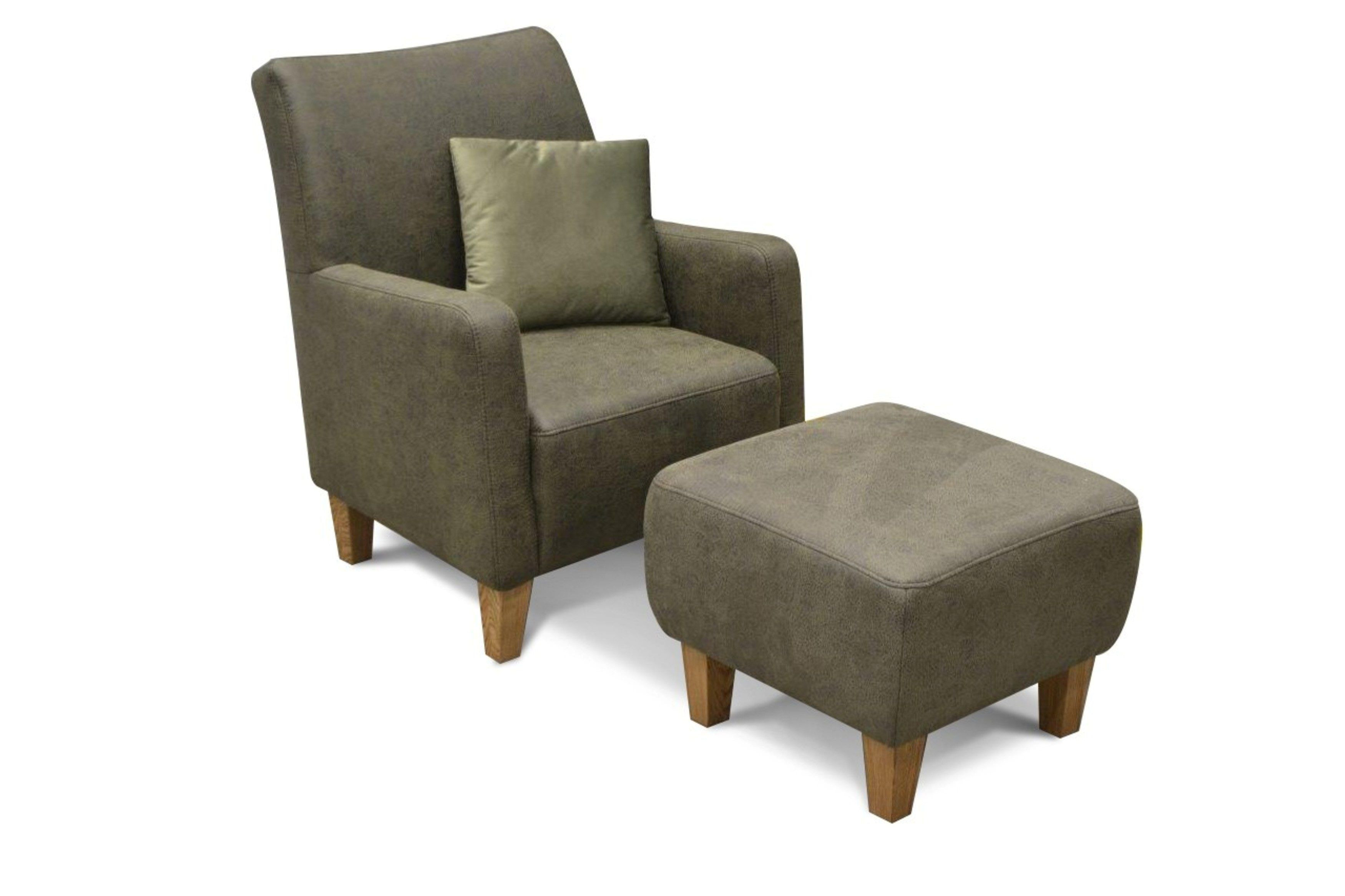 Auf dem Bild sehen Sie den Sessel Bosse zusammen mit dem Hocker, die ein perfektes Set für maximalen Komfort bilden. Dieses elegante und komfortable Set können Sie bei uns bestellen und sich so die perfekte Entspannung in Ihrem Zuhause gönnen. Farbe: Bosse Sessel Hocker Taurus olive Fuß Eiche geölt