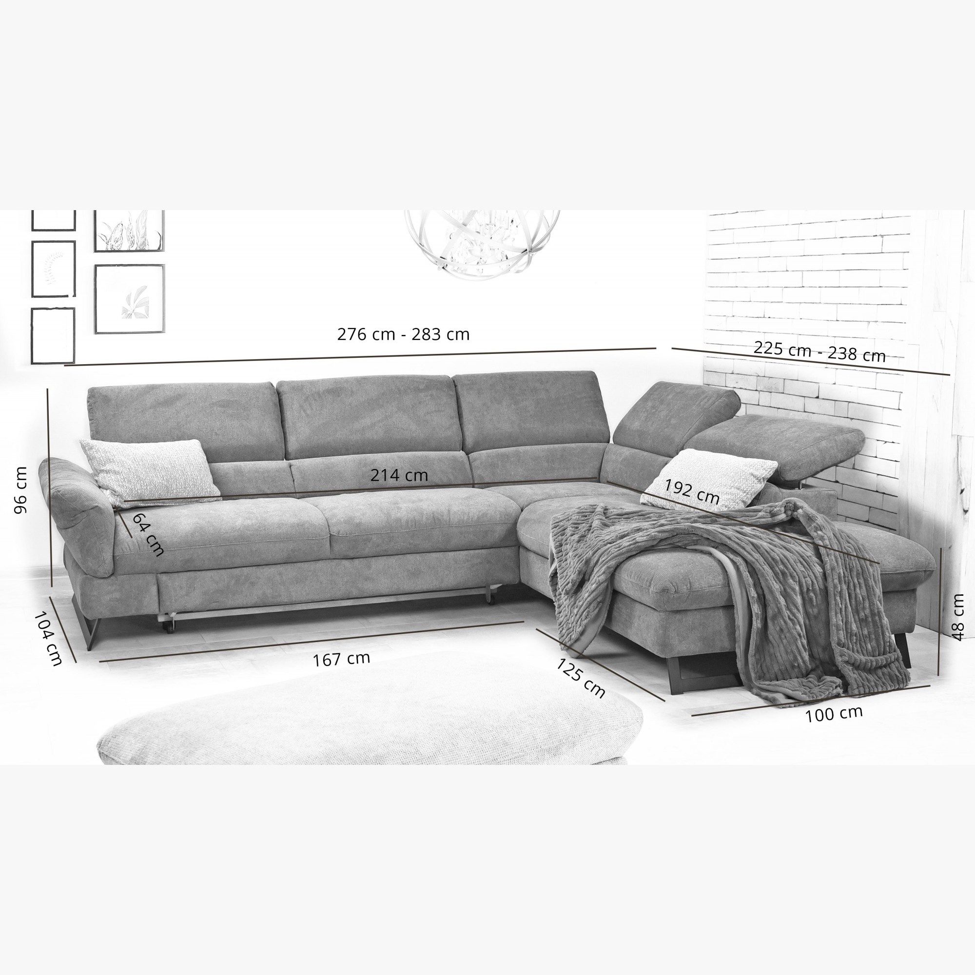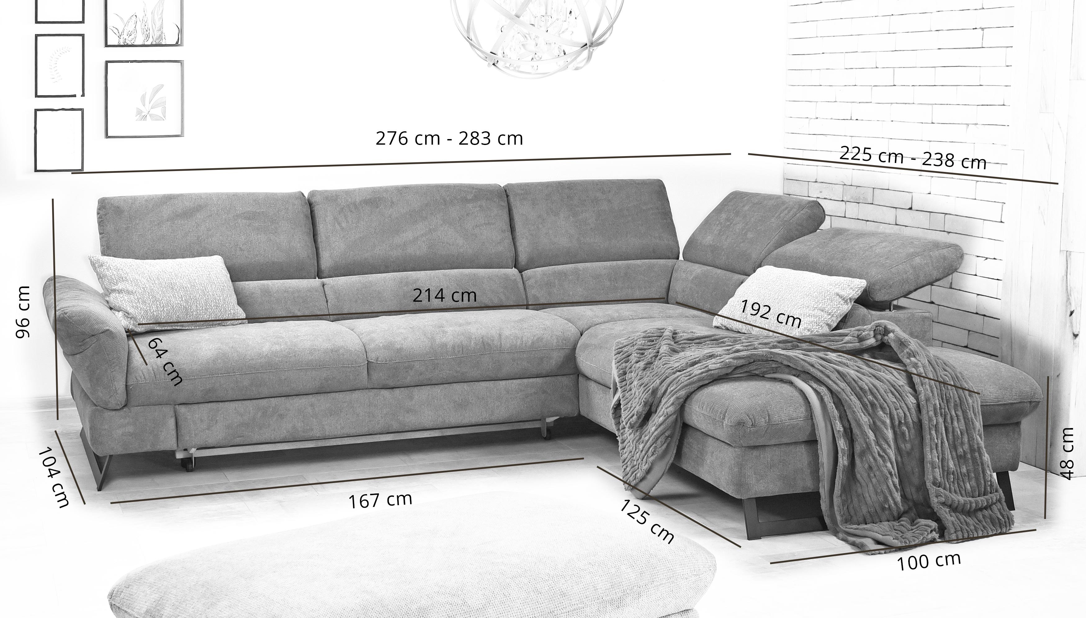 Gesamtbreite des Sofas 283 cm beim Herunterklappen der Lehne.