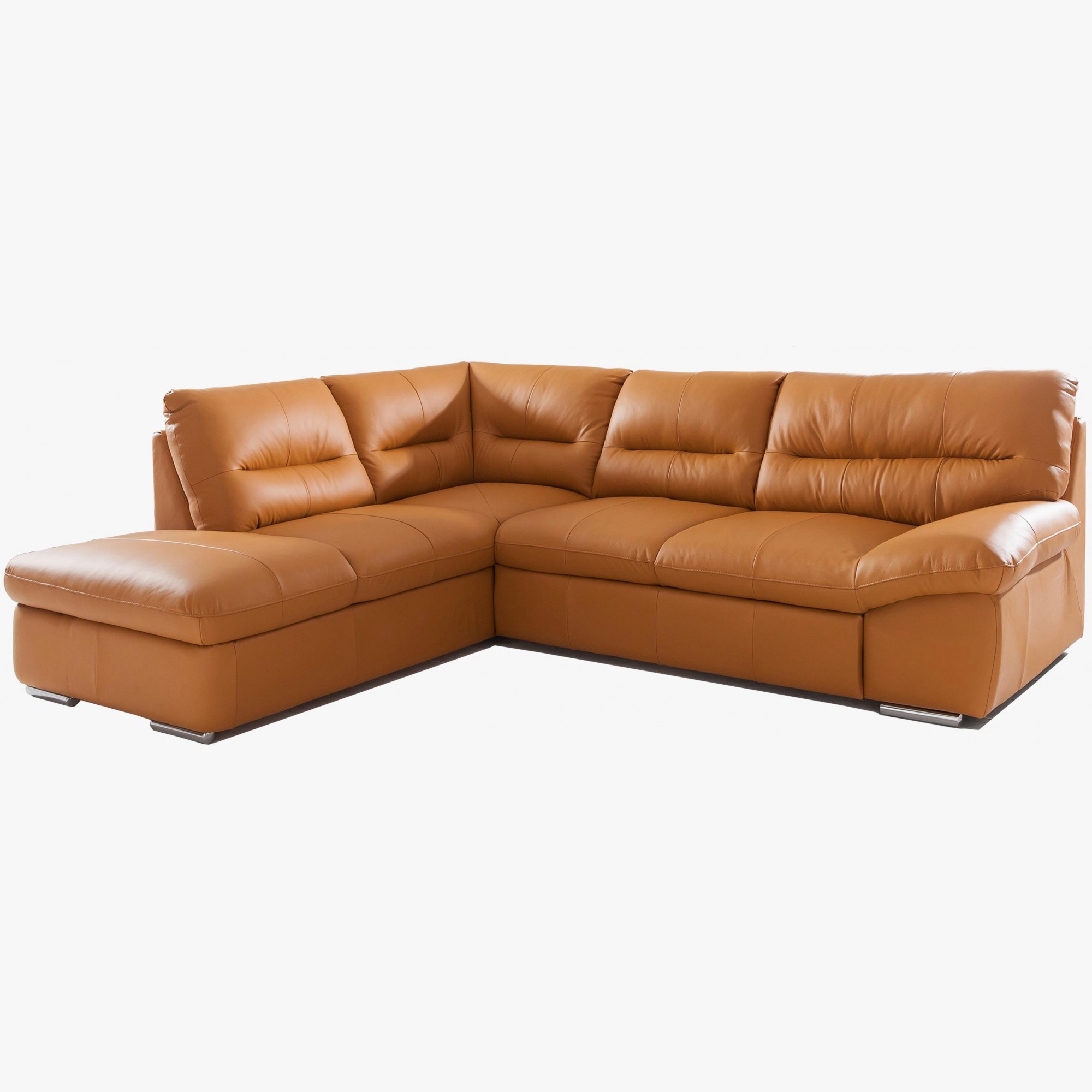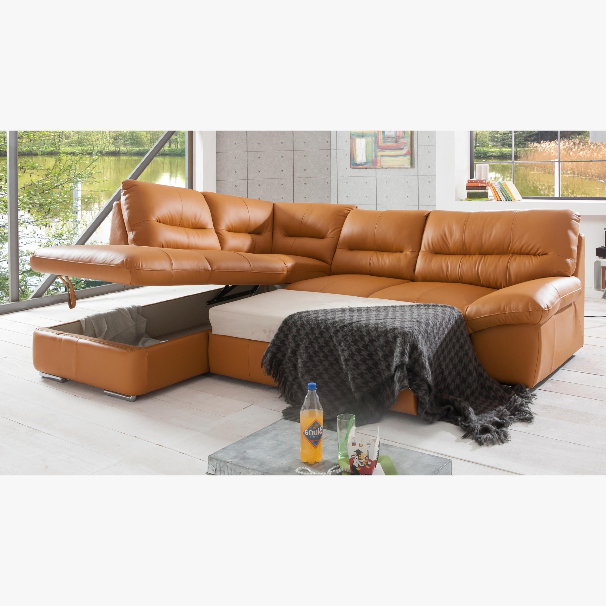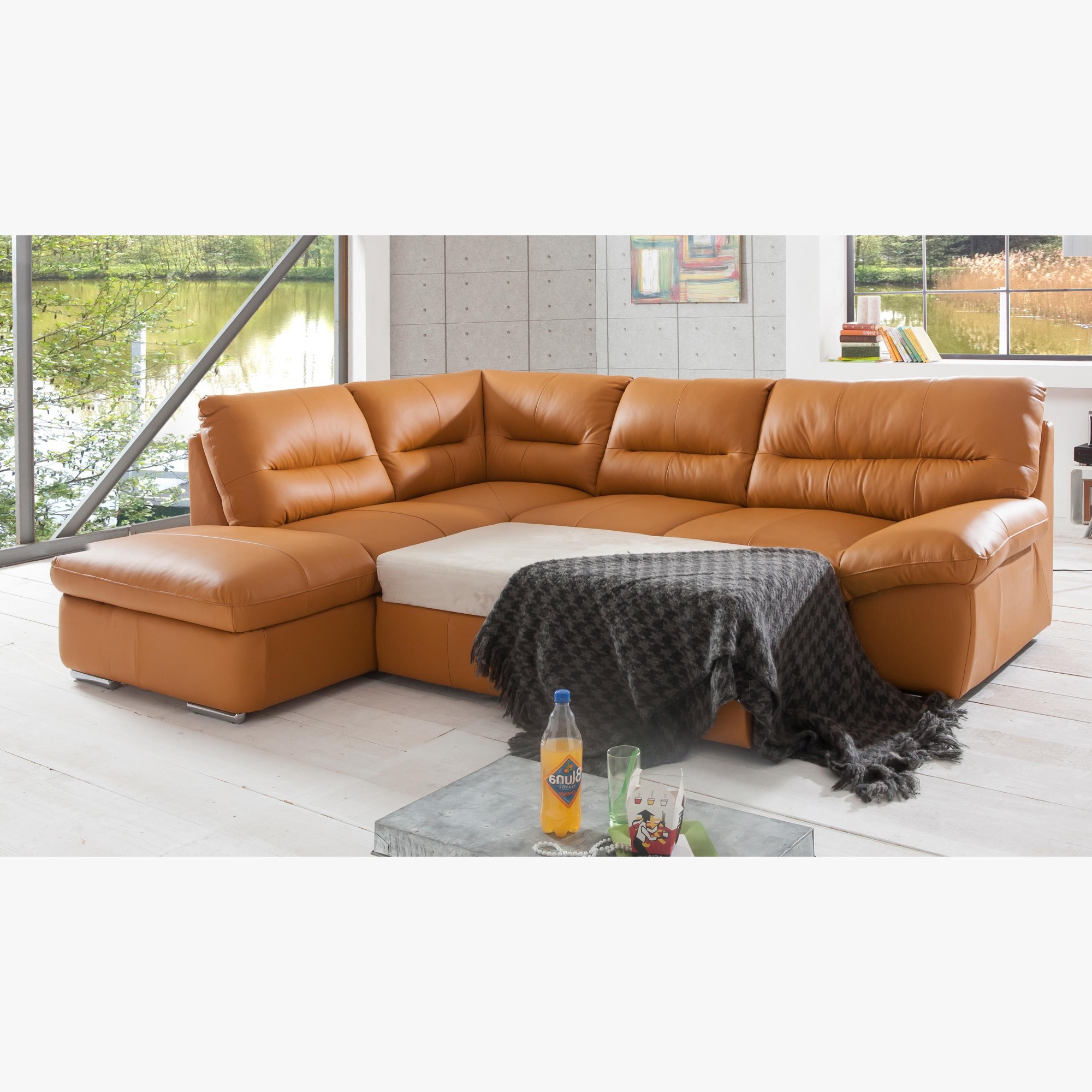 Moderne Eck-Sitzgarnitur aus echtem Leder in der Farbe AMBER. Die Sitzgarnitur William wird aus den hochwertigsten Materialien hergestellt. Das Leder mit einer Dicke von 0,9 - 1,1 mm ist dick und sehr angenehm im Griff, auch bei längerem Sitzen. Die Sitzgarnitur verfügt über ein ausziehbares Bett mit einer Liegefläche von 183 x 123 cm. Das Bett ist für gelegentliches Schlafen geeignet. Ein großer Vorteil der Sitzgarnitur ist auch der riesige Stauraum unter dem gesamten Eckteil der Sitzgarnitur. Die Sitzgarnitur William aus echtem Leder in orange-brauner Farbe (PAMPAS M9030) kann auf Wunsch auch in Stoff oder einer anderen Lederfarbe gefertigt werden. Die Füße des Sofas sind aus Metall mit einer Gesamthöhe von 4 cm. Ein zeitloses Design, das auch nach Jahren weiterhin im Trend liegt in der mutigen und außergewöhnlich angenehmen Farbe Amber.