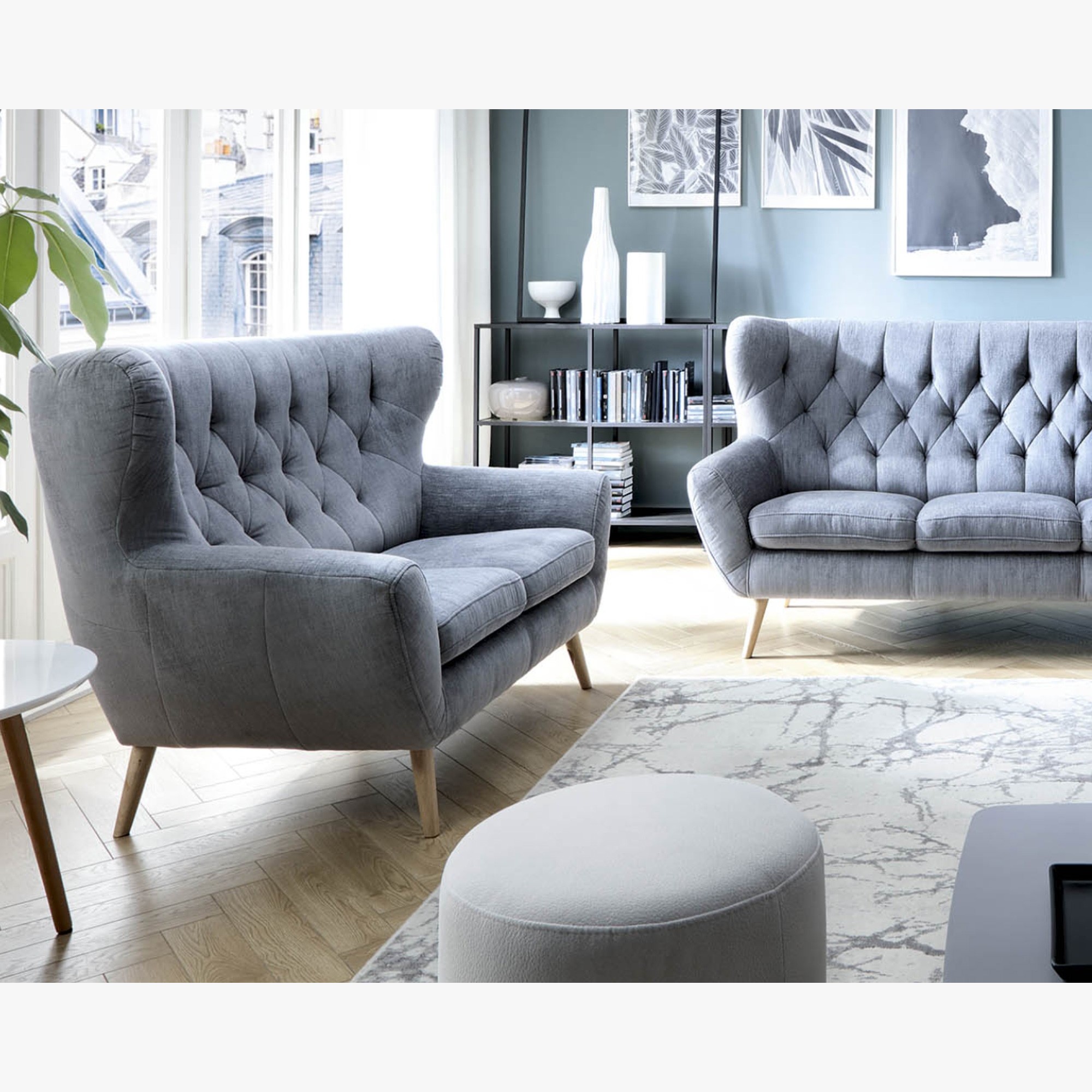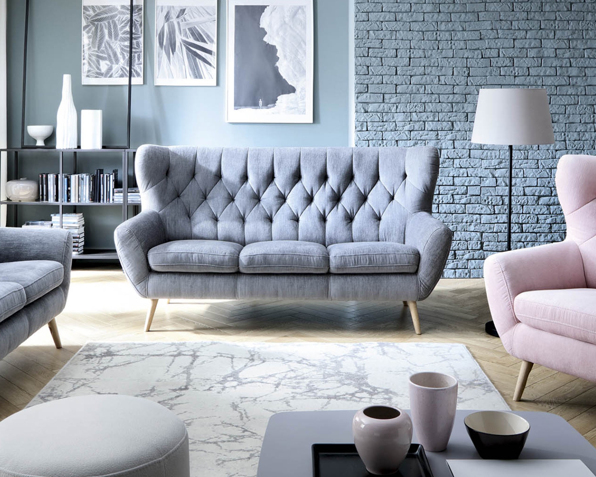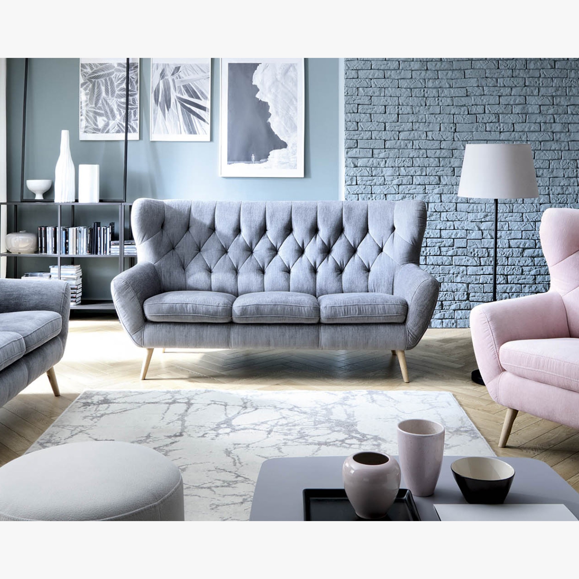 Schöne und vor allem bequeme Couch mit außergewöhnlich hohem Sitzkomfort. Das Sofa verfügt über einen außergewöhnlich hochwertigen Aquaclean-Stoff, so dass Sie sicher sein können, dass Sie alle Flecken entfernen können. Die Nähqualität garantiert feste Verbindungen auch nach einem Jahr Nutzung. Das Sitzmöbel ist in den Varianten Sessel, Zweiersofa und Dreiersofa erhältlich. Zur Auswahl stehen die hochwertigsten Stoffe mit Aquaclean-Eigenschaften. Das Sofa ist für moderne Wohnungen, aber auch für geräumige Häuser bestimmt. Ein charakteristisches Merkmal der Sofas sind ihre Ohren an den Seiten. Wenn Sie hohen Komfort mögen, ist dieses Sofa genau für Ihr Wohnzimmer geeignet. Der hohe Sitzkomfort wird durch Federn und Füllungen aus hoch elastischem Schaumstoff gewährleistet, die auch nach Jahren ihre Form behalten. Die Höhe der Füße beträgt 18 cm. Die Farbe des Stoffes kann leicht abweichen, dies hängt von den Farbeinstellungen Ihres Monitors ab.