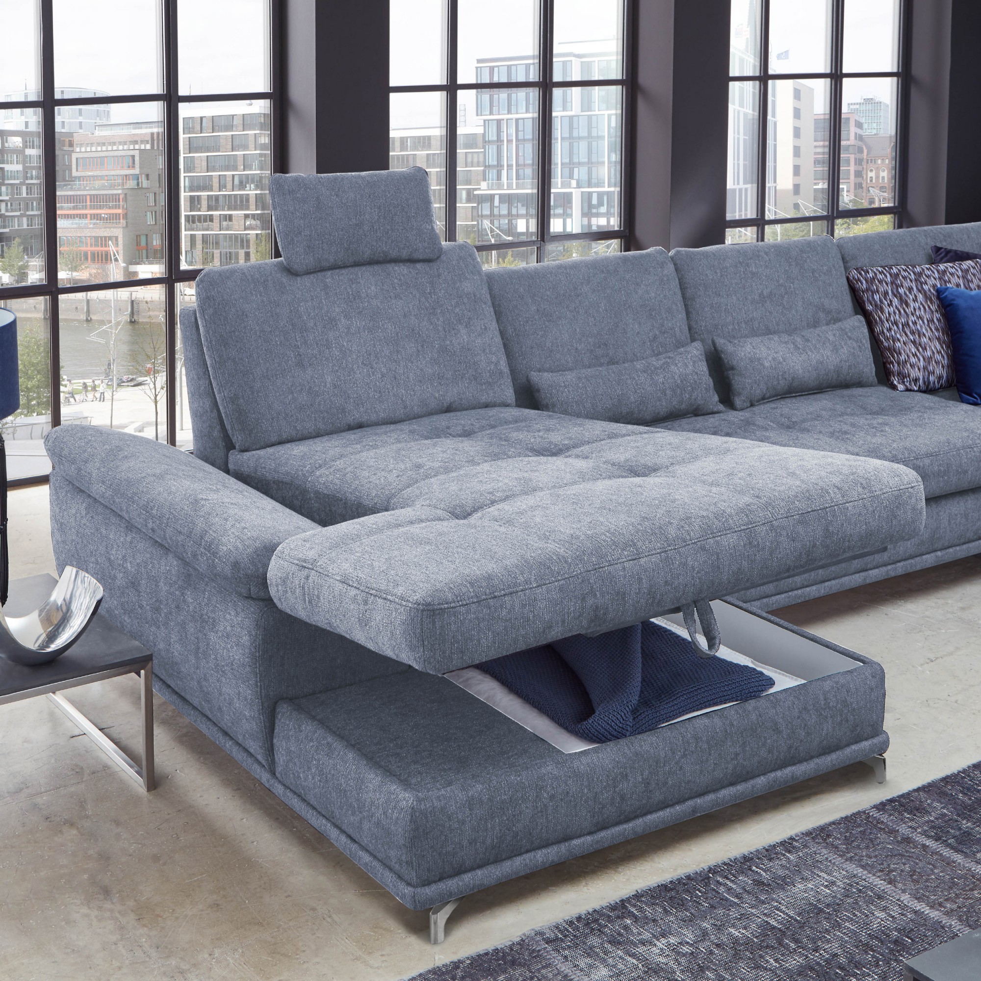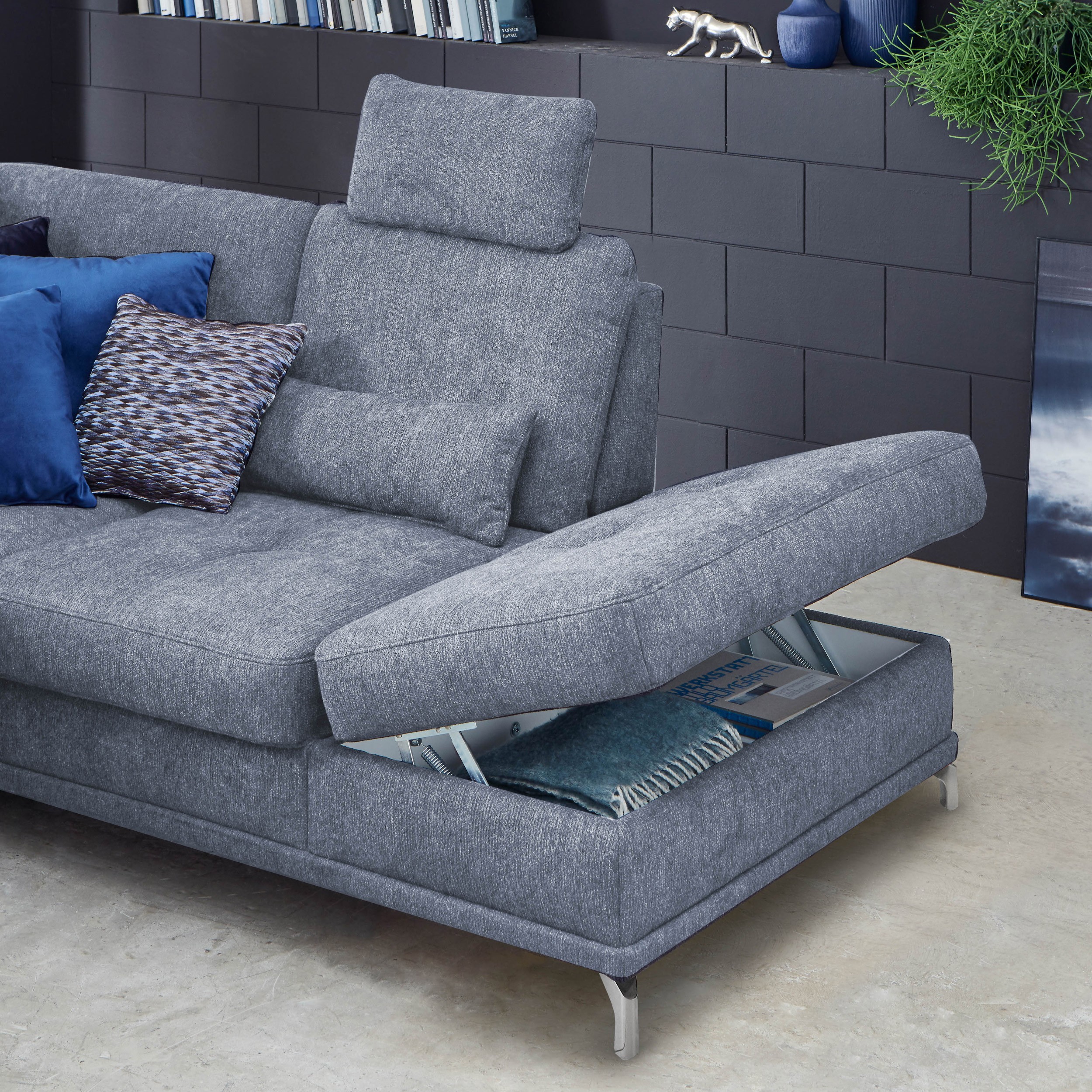 Modernes Designsofa Modell Costello. Das Ecksofa verfügt gegen Aufpreis über eine Schlaffunktion und einen Ablagebereich in der Sofaecke. Ein großes Plus ist bereits im Grundpreis die Tiefenverstellfunktion der Sitzfläche im mittleren Sofabereich. Sie können zwischen rechter oder linker Ecke wählen. Das Modell ist in mehreren Ausführungen verfügbar. Ablagemöglichkeiten sind kostenpflichtig, einen größeren Ablagebereich in der Sofaecke können Sie beim Produkt dazu bestellen. Ein kleinerer Ablagebereich ist mit einem weiteren Aufpreis verbunden.