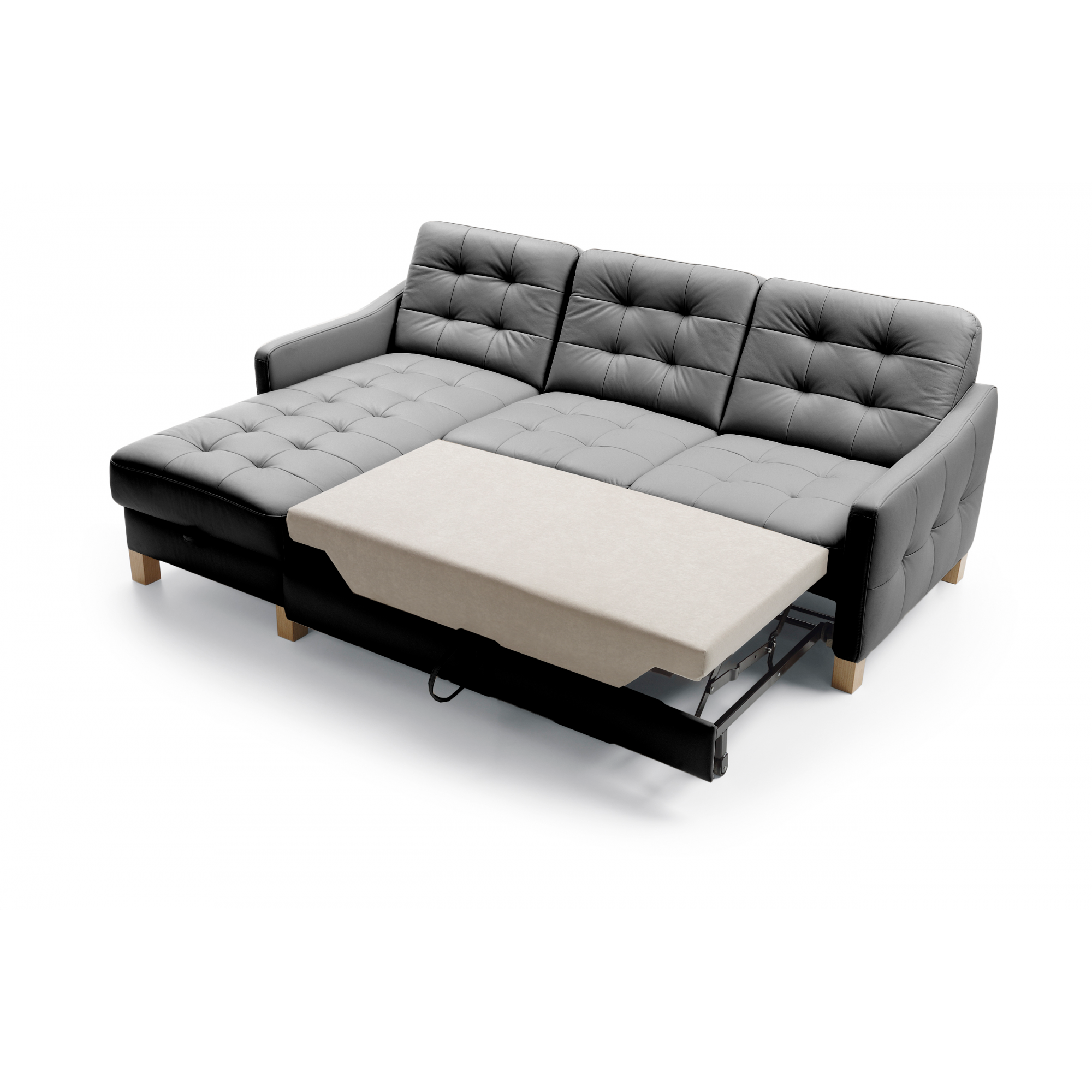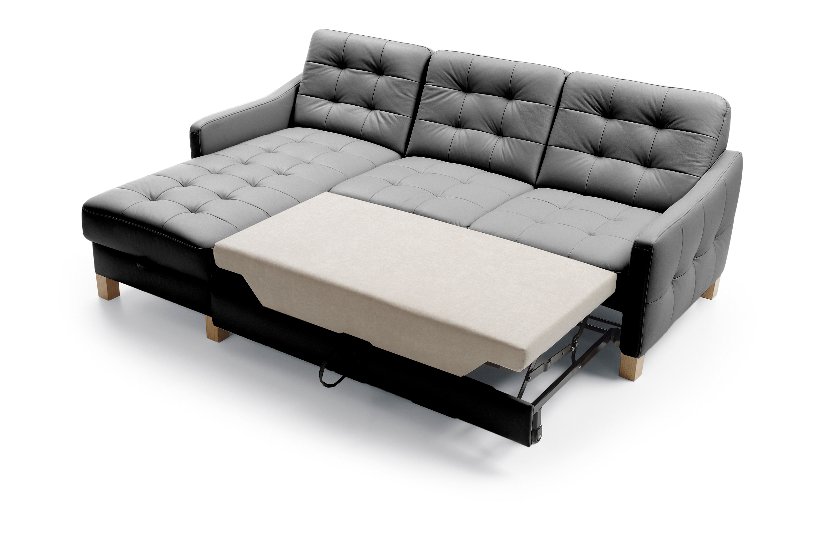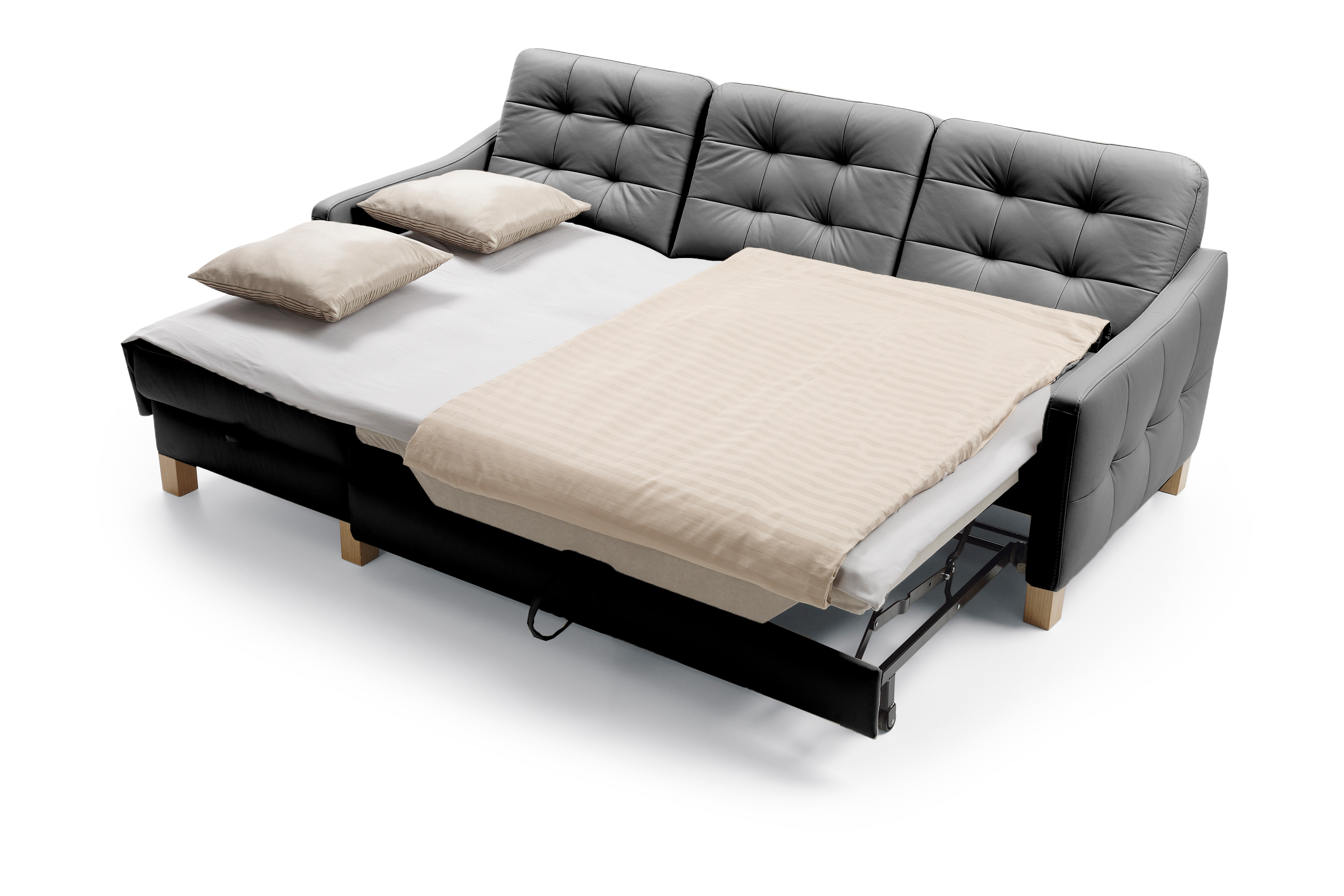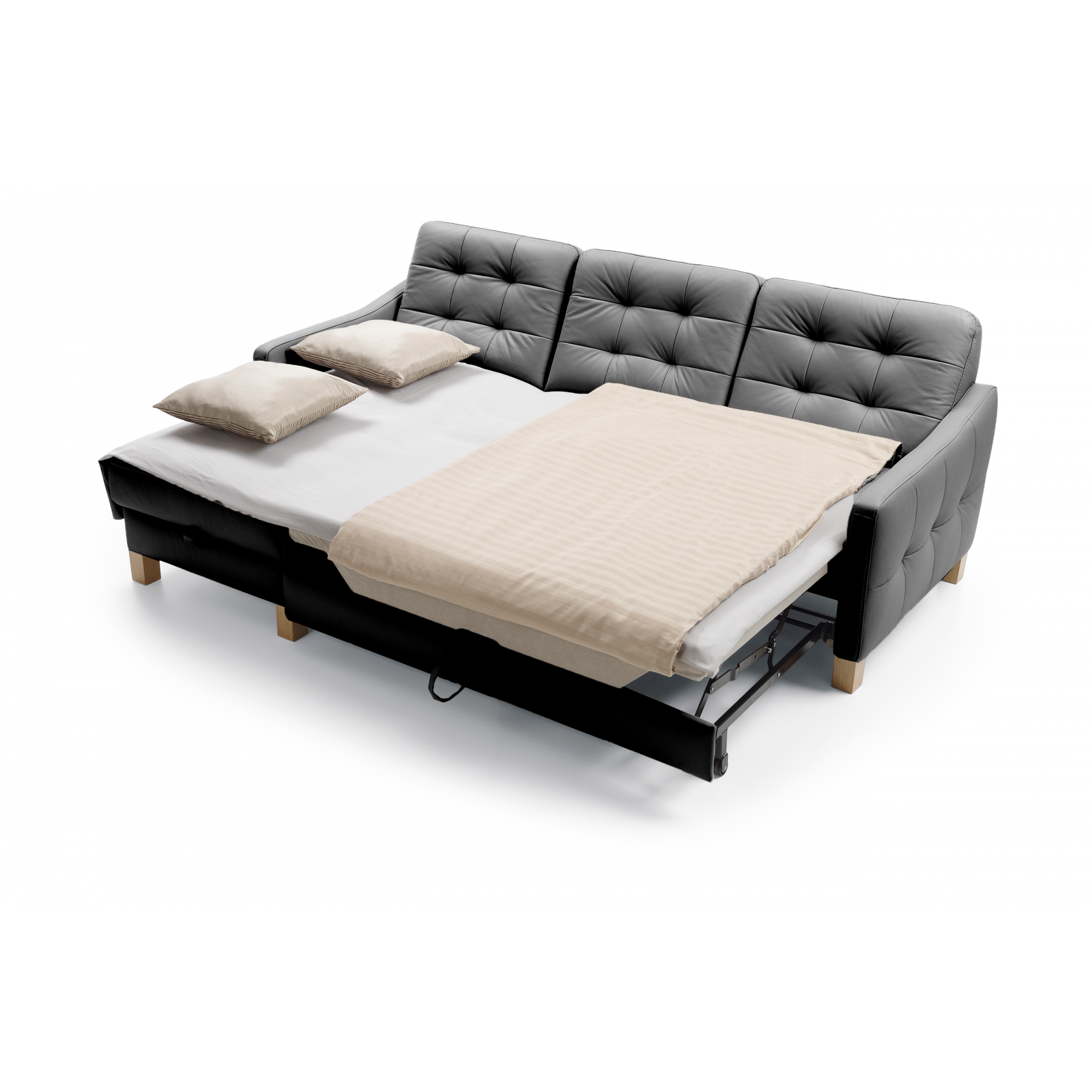 Schwarzes Eckledersofa mit Schlaf- und Stauraumfunktion