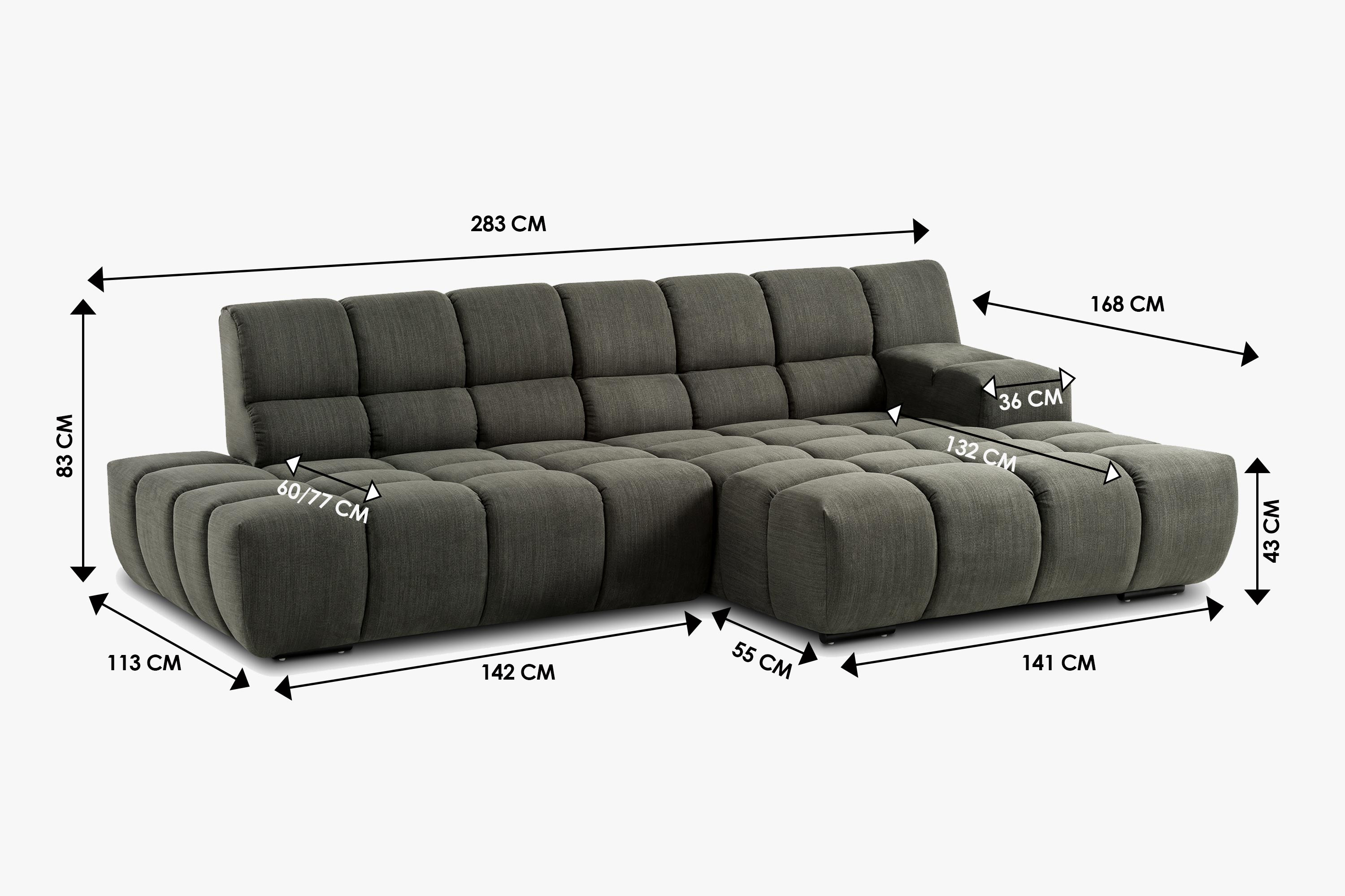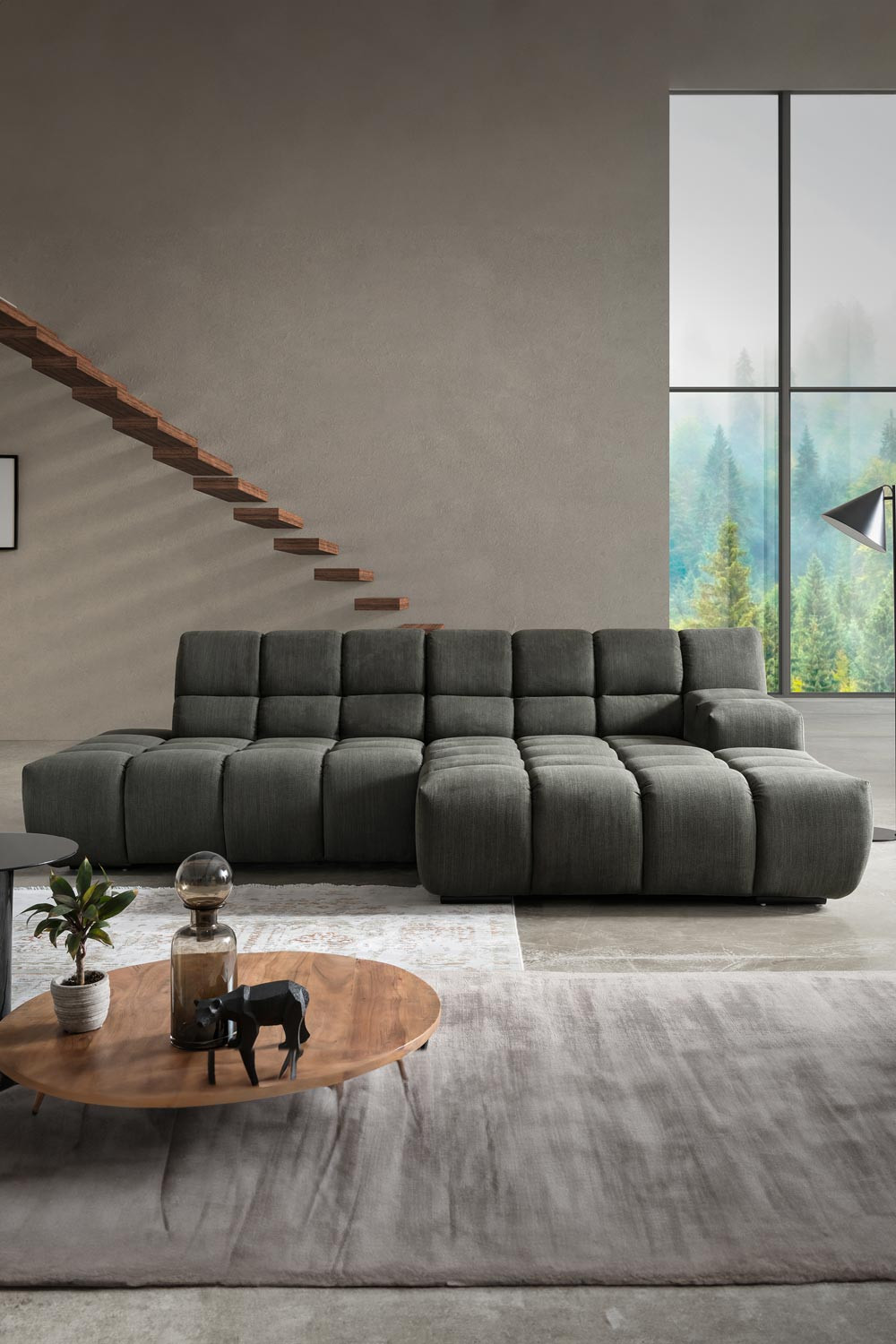 Die Eckversion des Sofas kann mit Modulen von 70 oder 105 cm Breite erweitert werden. Jede Ecke kann in Richtung U oder mit klassischem Abschluss beendet werden.